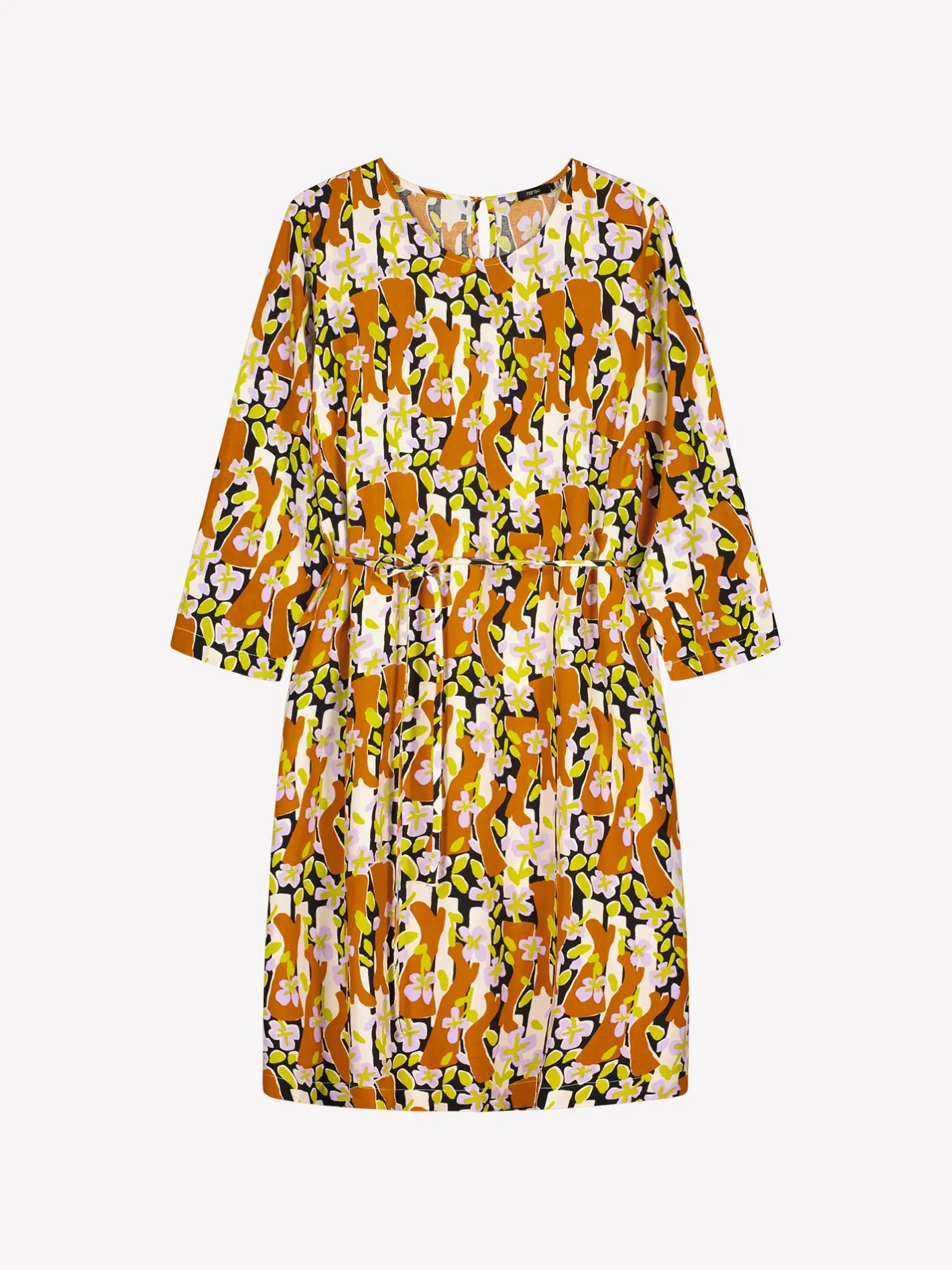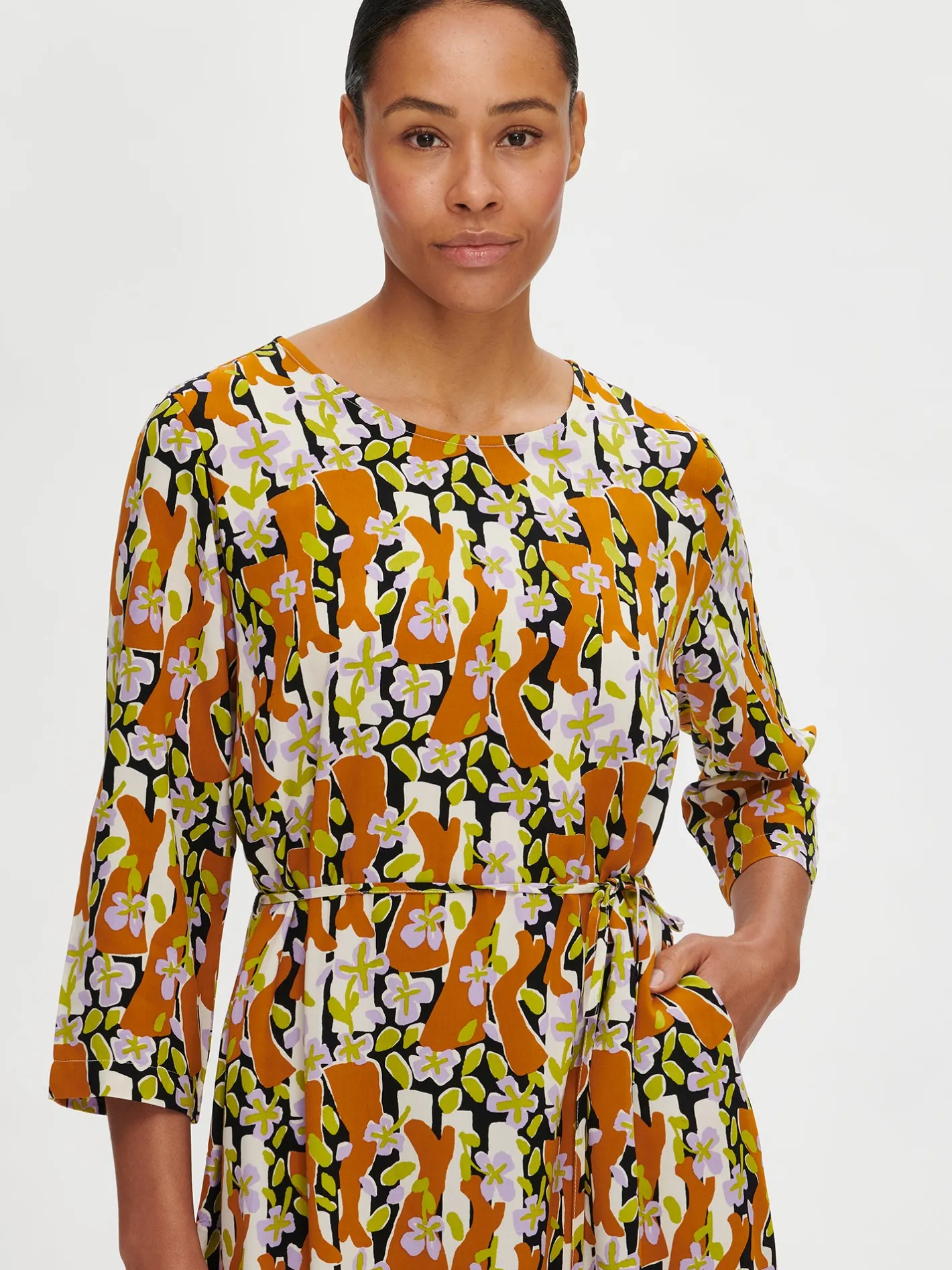 Naisten kuosillinen monivärinen Bootsit-mekko. A-linjaisessa mekossa on pyöreä pääntie, jossa nappihalkio takana. Mekon suoralinjaiset hihat ovat 3/4 pituiset. Mekon sivuissa on taskut ja vyötäröllä on kapea irroitettava vyö. Mekon pituus koossa 38 on noin 98 cm. Materiaali on kauniisti laskeutuvaa kudottua 100 % viskoosikangasta. Materiaalille on ominaista 3-5 % kutistuminen ensimmäisessä pesussa.