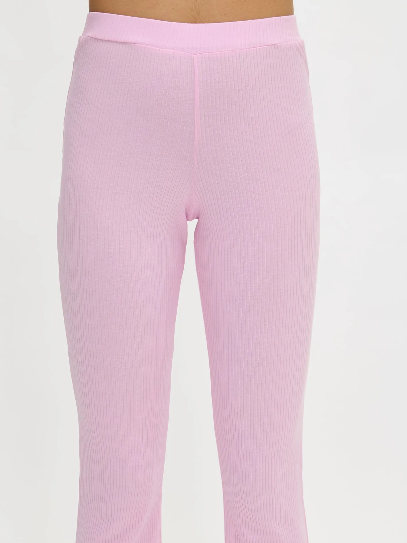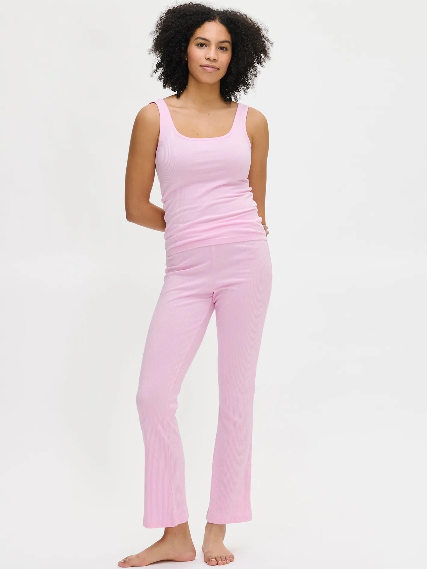 Naisten rennot vaaleanpunaiset Heila-ribbihousut, joissa on mukava kuminauharakenne vyötäröllä ja levenevät lahkeet. Housut ovat täyspitkät ja kauniisti muotoiltu. Materiaali on laadukasta, iholla pehmeän tuntuista bambu-puuvilla-elastaaniribbiä. Tuotteessa käytetty puuvilla on orgaanista. Nämä housut yhdistävät rentouden ja tyylikkyyden.