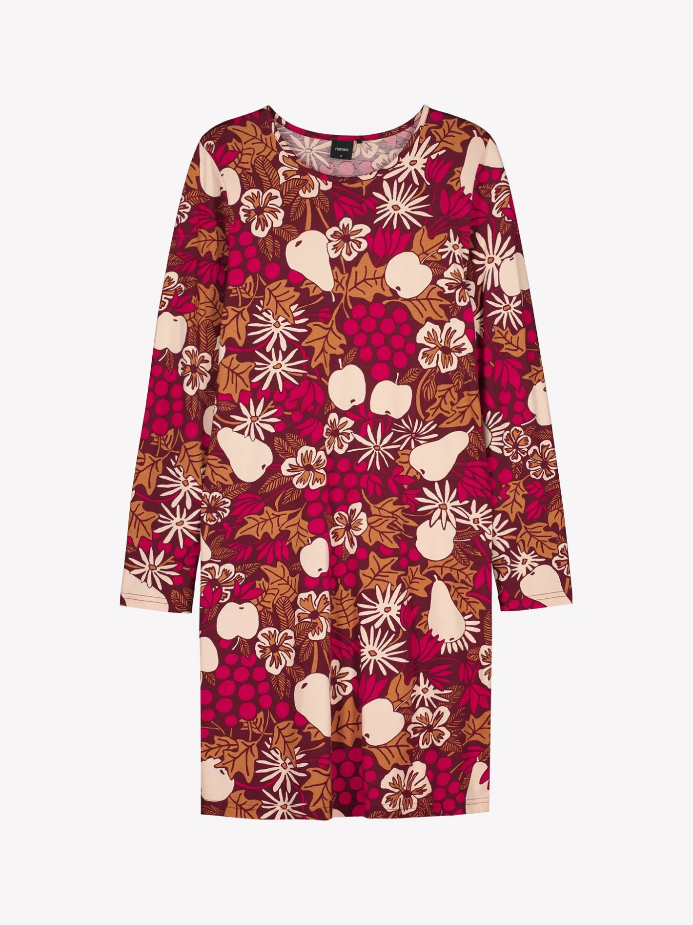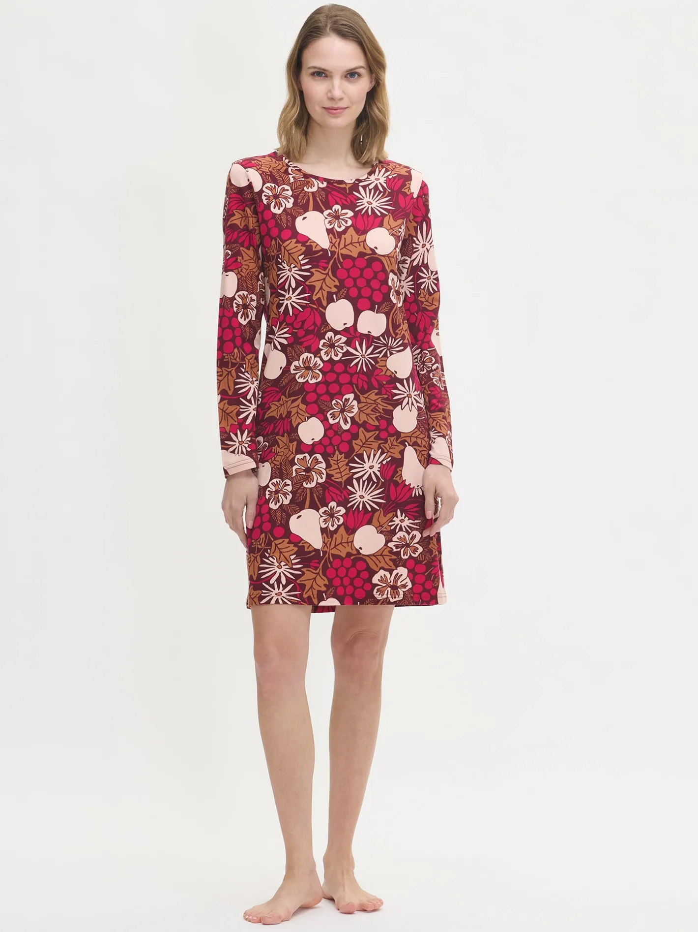 Naisten kuosillinen Juhla-yöpaita pitkillä hihoilla ja pyöreällä pääntiellä ruskeassa sävyssä. Yöpaidan pituus koossa M on noin 95 cm. Materiaali on laadukasta, iholla miellyttävän pehmeältä tuntuvaa ja helppohoitoista puuvilla-modaalia, joka pysyy hyvänä pesusta toiseen.