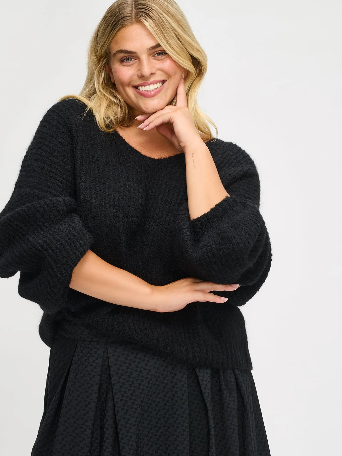 Naisten ylellinen musta Karamelli-neulepusero. Tyylikäs ja muhkea neulepusero on talven ehdoton suosikkivaate, sillä pehmeään neulepuseroon on aina ihanaa pukeutua. Neulepaidan neulos on sekoite, jossa on osaksi sertifioitua mohairia, sertifioitua villaa, polyamidia ja hieman elastaania. Muotoonneulotussa neulepuserossa on avara v-pääntie ja täyspitkät hihat. Neulepuseron pituus koossa M on noin 57 cm. Neuleen hoito-ohjeet löydät .