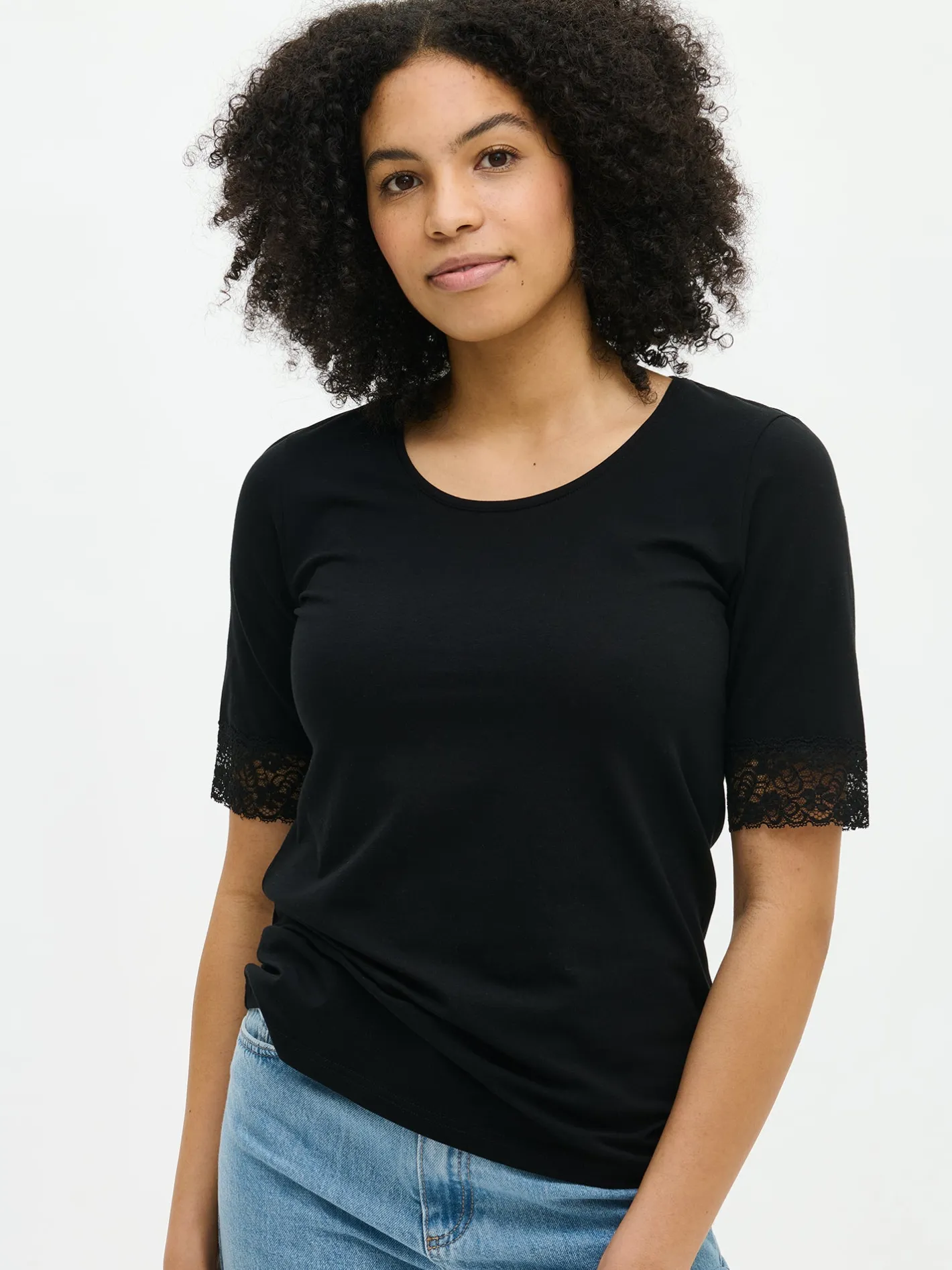 Naisten klassinen musta Lempi t-paita pyöreällä pääntiellä. Laadukas t-paita on varma valinta arjen pukeutumiseen. Lempi t-paidassa on kaunis pitsi hihan reunoissa. Hihat ovat puolipitkät. T-paidan pituus koossa M on noin 68 cm. Materiaali on miellyttävää ja joustavaa luomupuuvilla-elastaani-neulosta.