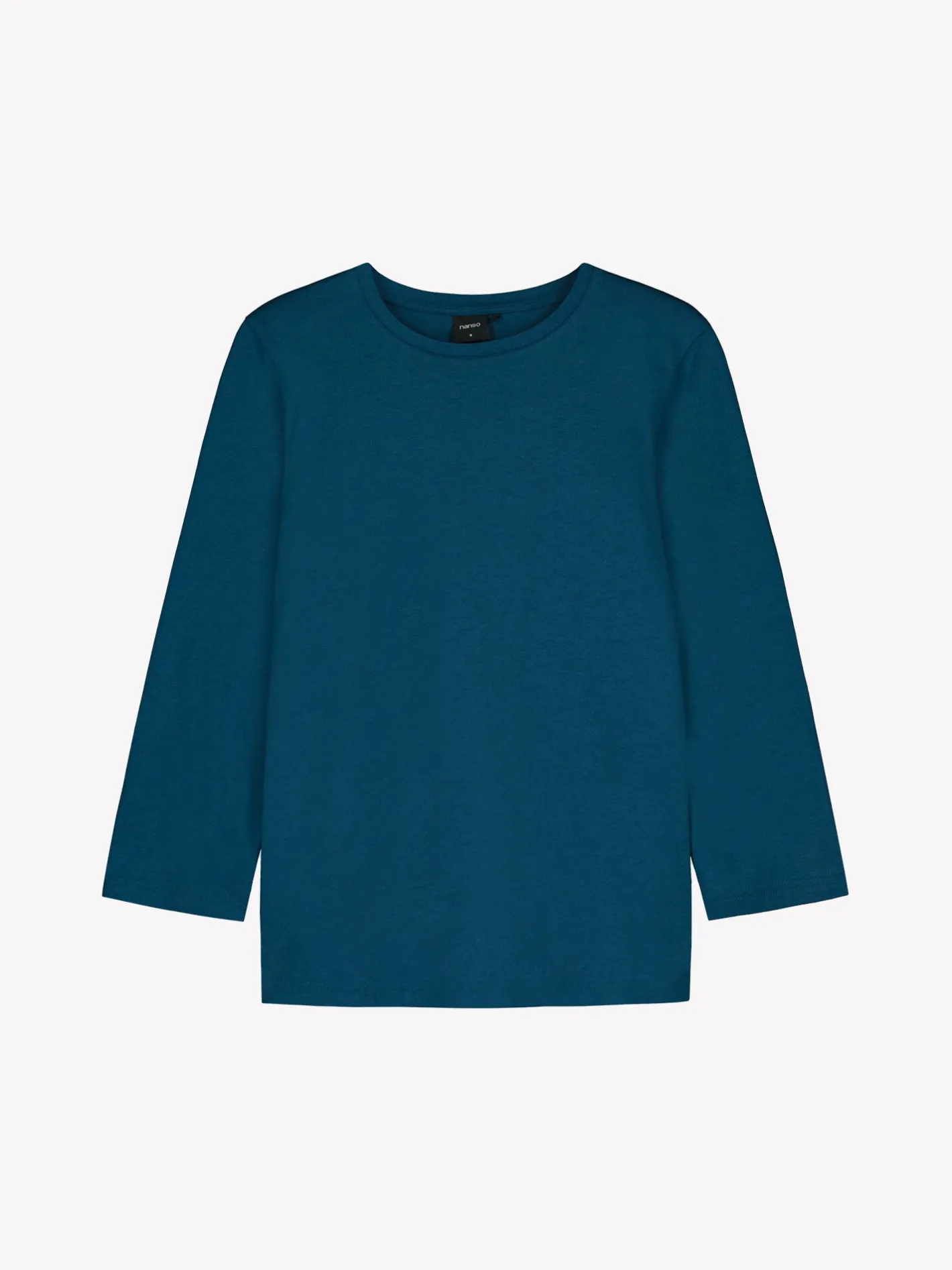Naisten sininen Leonora-pyjama. Yksivärisessä puserossa on pyöreä pääntie ja 3/4 pituiset hihat. Puseron pituus koossa M on noin 65 cm. Kuosilliset housut ovat 7/8 pituiset. Materiaali on laadukasta, iholla miellyttävän pehmeältä tuntuvaa ja helppohoitoista puuvilla-modaalia, joka pysyy hyvänä pesusta toiseen. Rento malli ja näyttävä Leonora-kuosi tekevät tästä pyjamasta arjen luottotuotteen – sekä uneen että oleskeluun.
