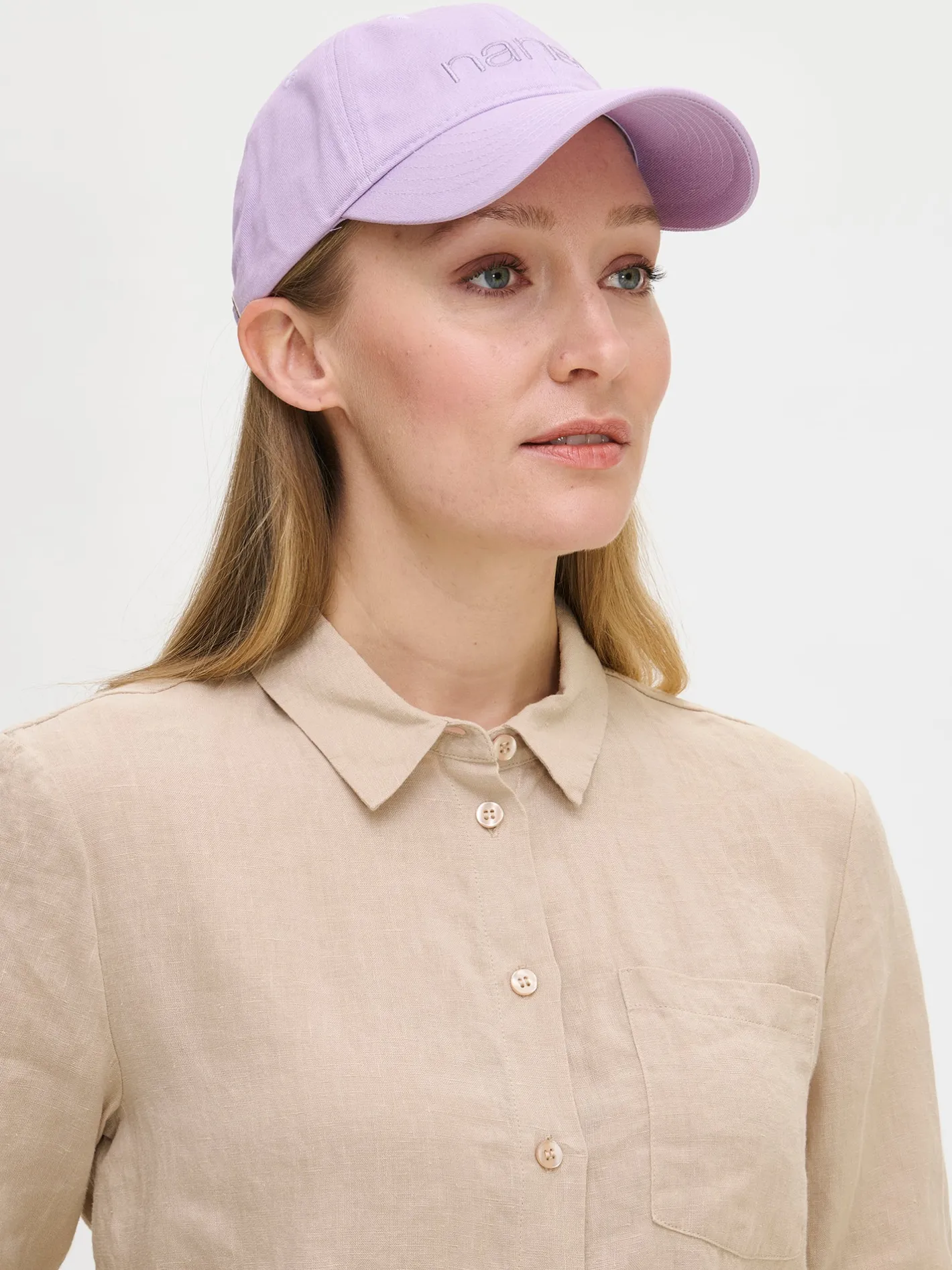 Naisten tyylikäs lila Logo-lippalakki. Edessä on sävy-sävyyn brodeerattu Nanso-logo ja takana säätömahdollisuus. Lippalakki on valmistettu kierrätetystä puuvillasta.