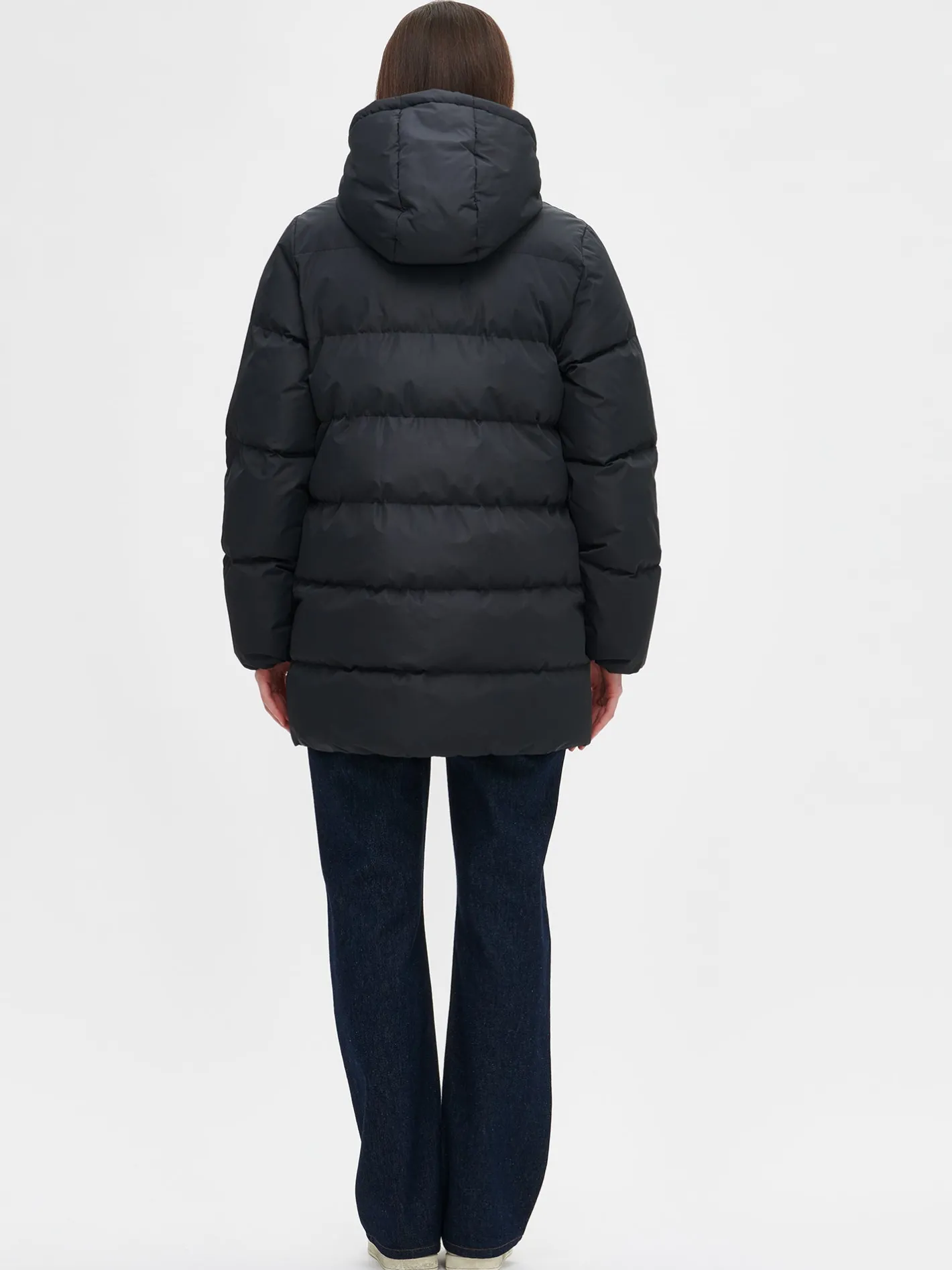 Lämmin ja muhkea musta Lumi-toppatakki miellyttävän kevyellä vanuvuorella. Takissa on lämmin huppu, jossa on kiristysmahdollisuus. Takin hihansuissa ja helmassa on kuminauhareunus. Toppatakissa on sivutaskut ja tuulilistallinen kaksisuuntainen vetoketjukiinnitys. Takin pituus koossa M on noin 85 cm. Materiaali on laadukasta, vettähylkivää ja kierrätyspolyesteria. Toppatakissa on Sorona-vanu.