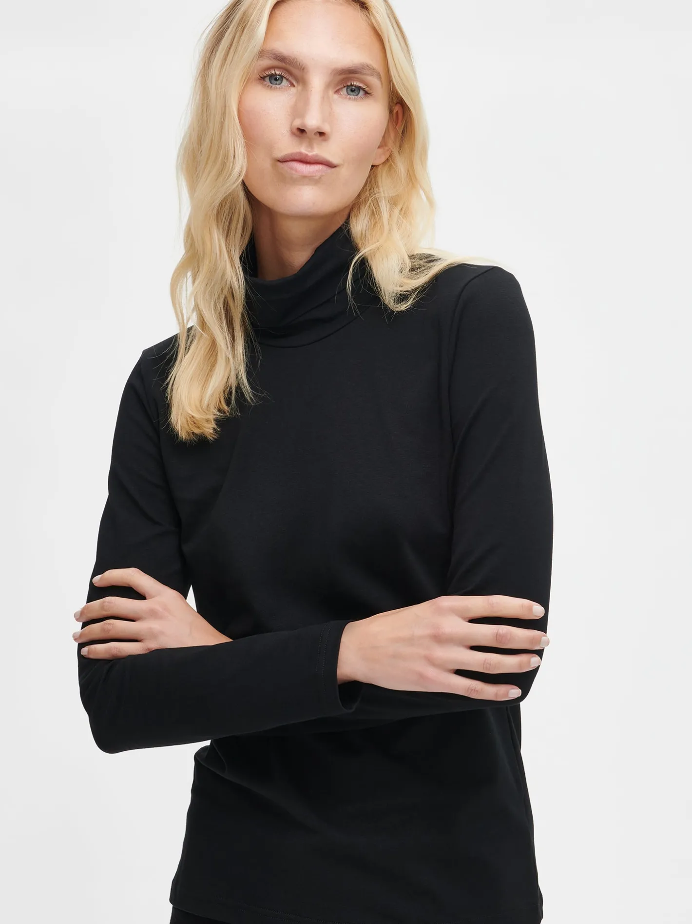 Naisten musta Mari-poolopusero. Istuva poolo on ajaton klassikko, johon haluaa pukeutua vuodesta toiseen. Monikäyttöisen poolon voi pukea myös lyhythihaisen mekon tai paidan alle. Istuvassa matalakauluksellisessa poolopuserossa on täyspitkät hihat. Puseron pituus koossa M on noin 65 cm. Poolon materiaali on miellyttävää ja joustavaa luomupuuvilla-elastaani-neulosta.