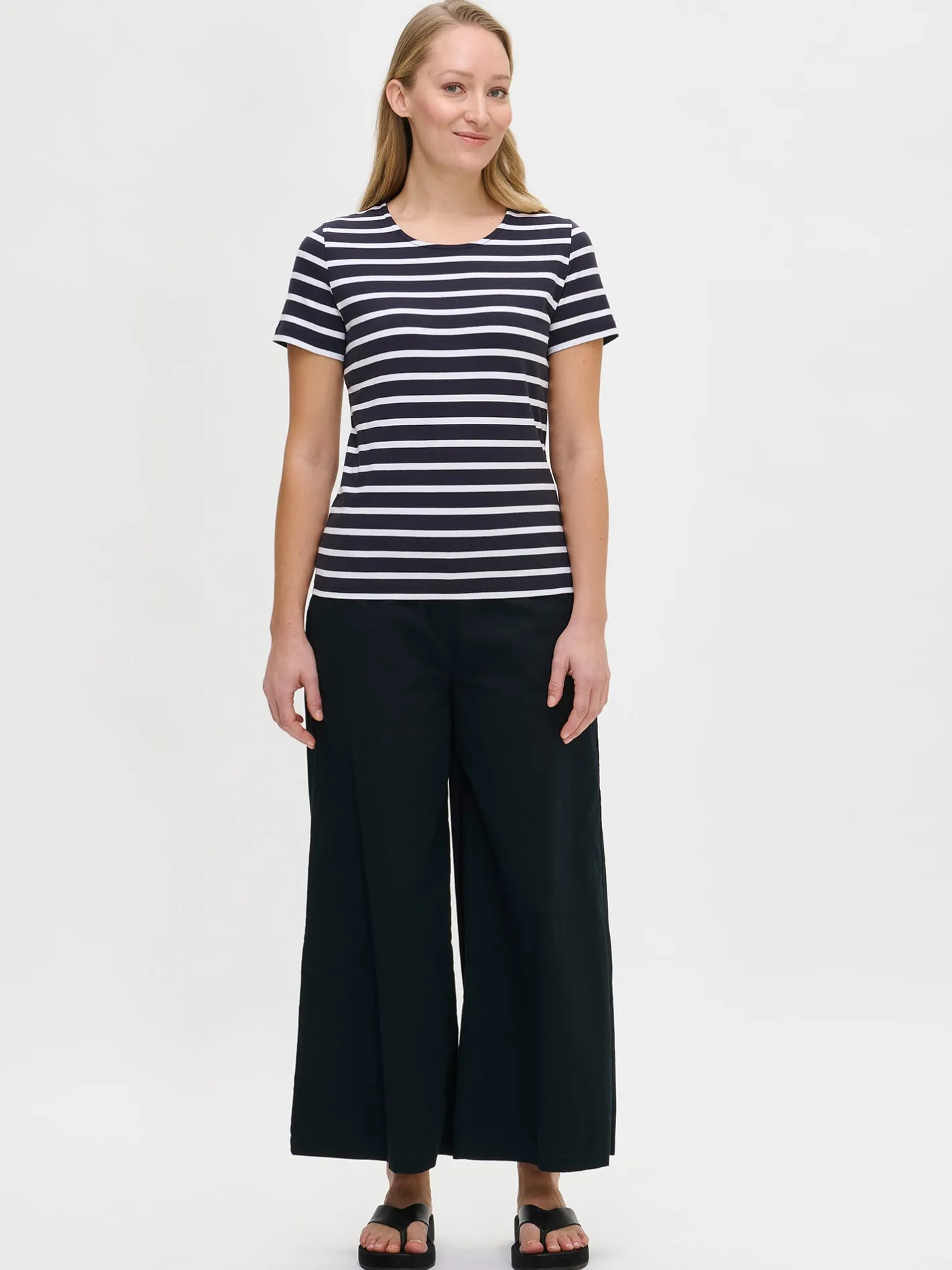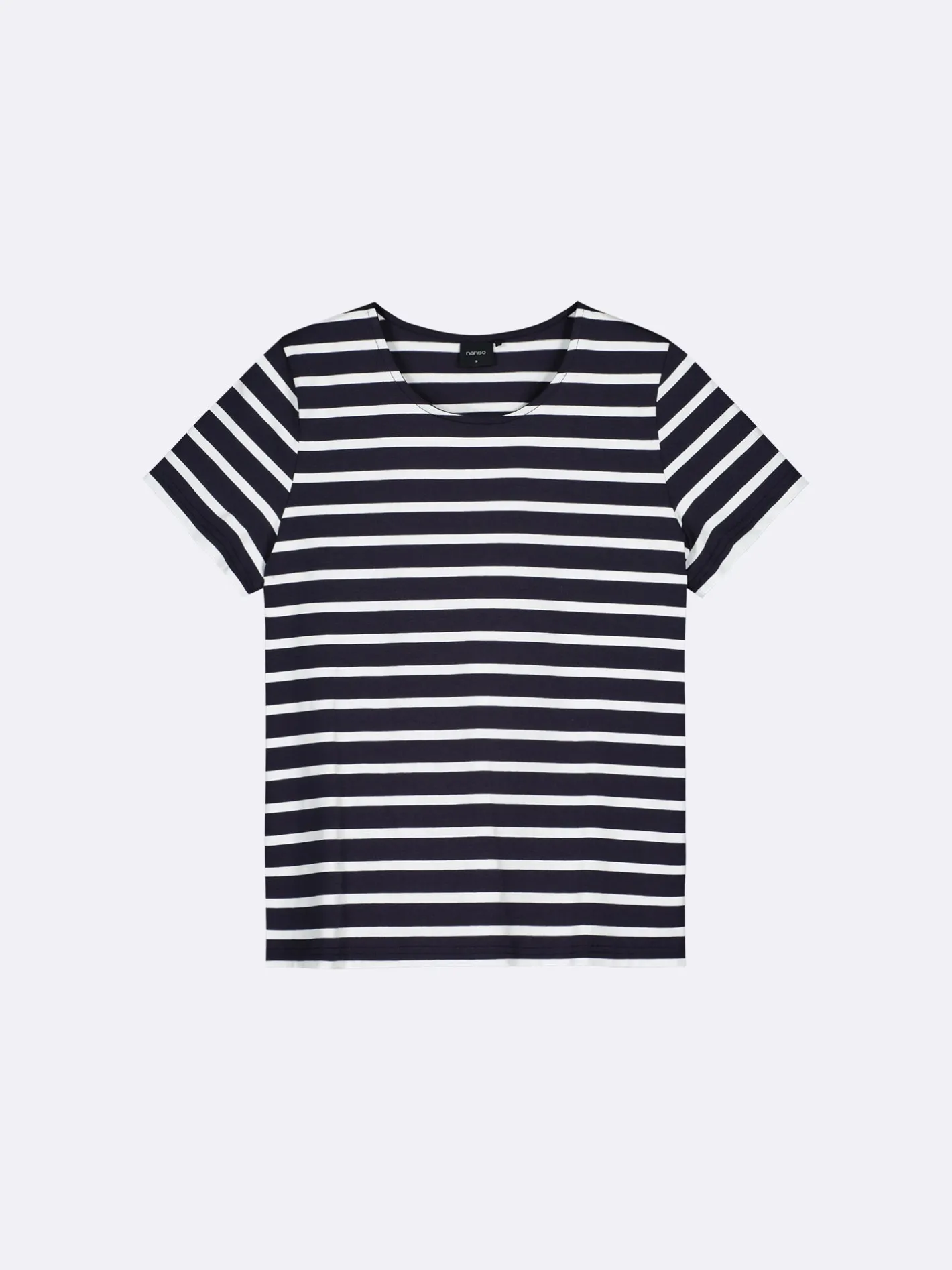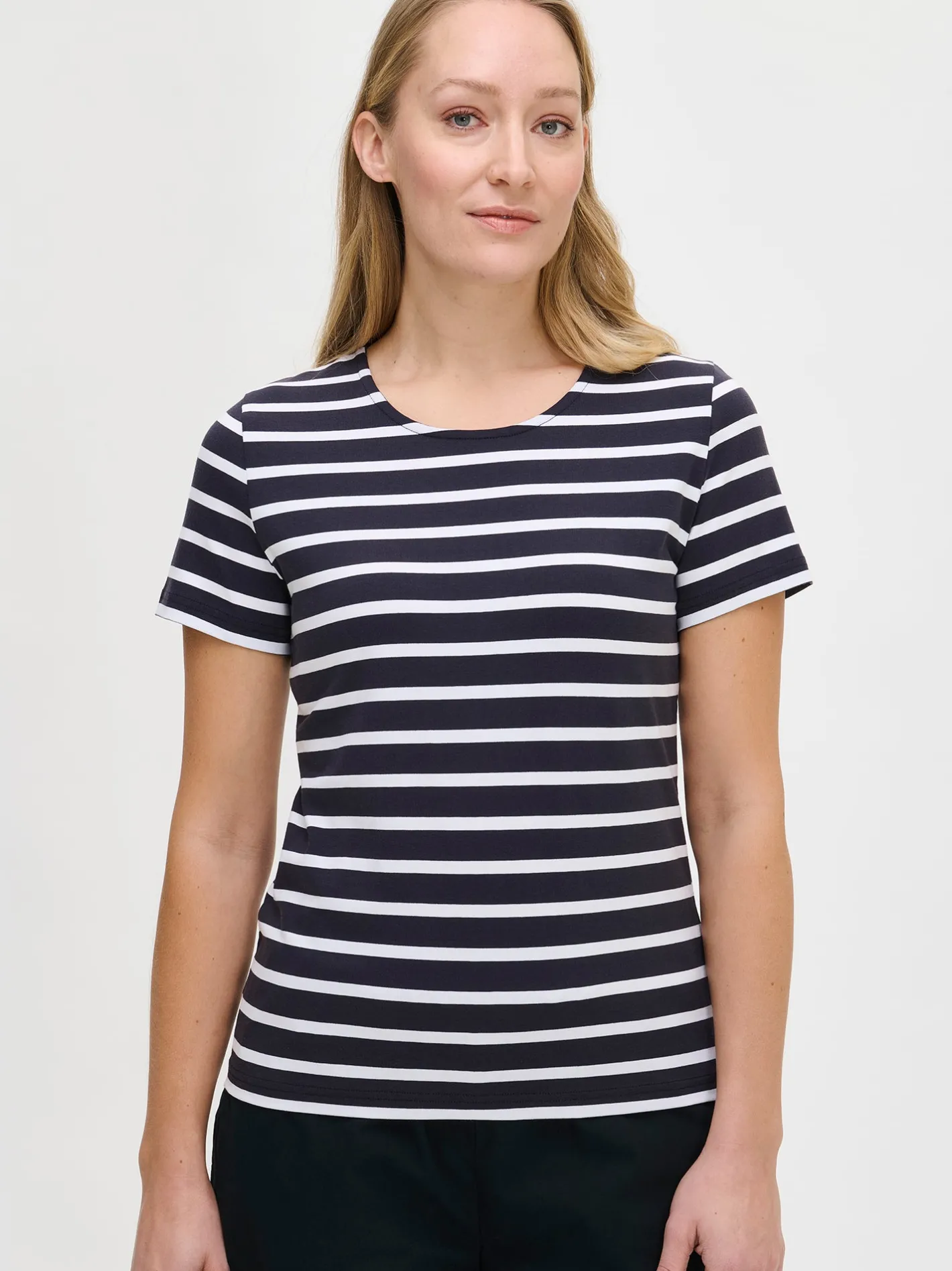 Naisten tummansininen raidallinen Marianne- t-paita. Suoralinjaisessa t-paidassa on kantilla viimeistelty avara pyöreä pääntie ja lyhyet hihat. T-paidan pituus koossa M on noin 65 cm. Materiaali on laadukasta ja helppohoitoista puuvilla-elastaani-neulosta, joka pysyy hyvänä pesusta toiseen. Raidallinen Marianne-t-paita tuo raikkautta arkeen ja tarjoaa huolettoman tyylin, joka yhdistää mukavuuden ja monikäyttöisyyden.