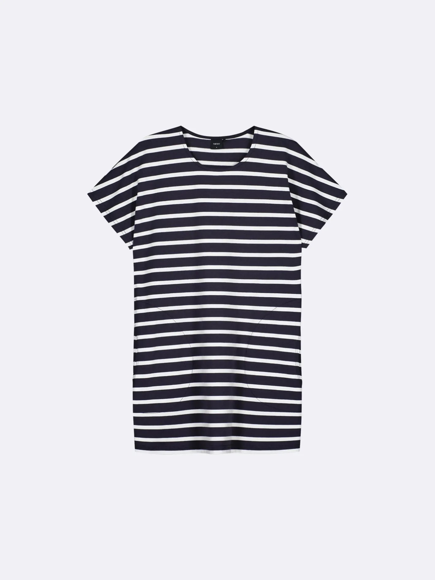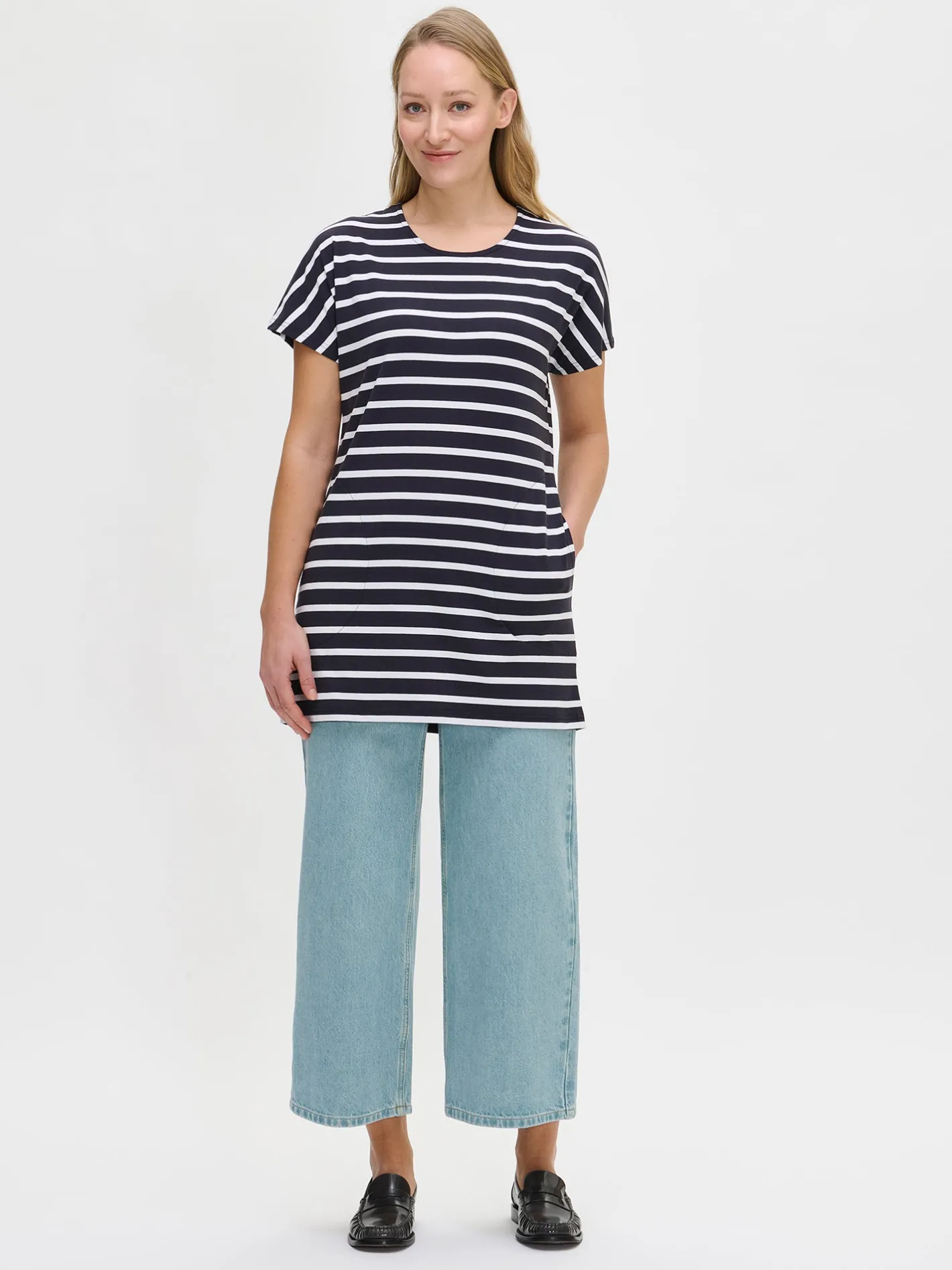 Naisten tummansininen raidallinen Marianne-tunika. Suoralinjaisessa tunikassa on kantilla viimeistelty avara pyöreä pääntie, sivuissa taskut ja holkkihihat. Tunikan pituus koossa M on noin 80 cm. Materiaali on laadukasta ja helppohoitoista puuvilla-elastaani-neulosta, joka pysyy hyvänä pesusta toiseen. Tämä kauniisti laskeutuva tunika tuo rentoutta ja tyylikkyyttä päivittäisiin asuihin, täydellinen valinta kesäpäiviin tai rennolle päivälle kaupungilla.