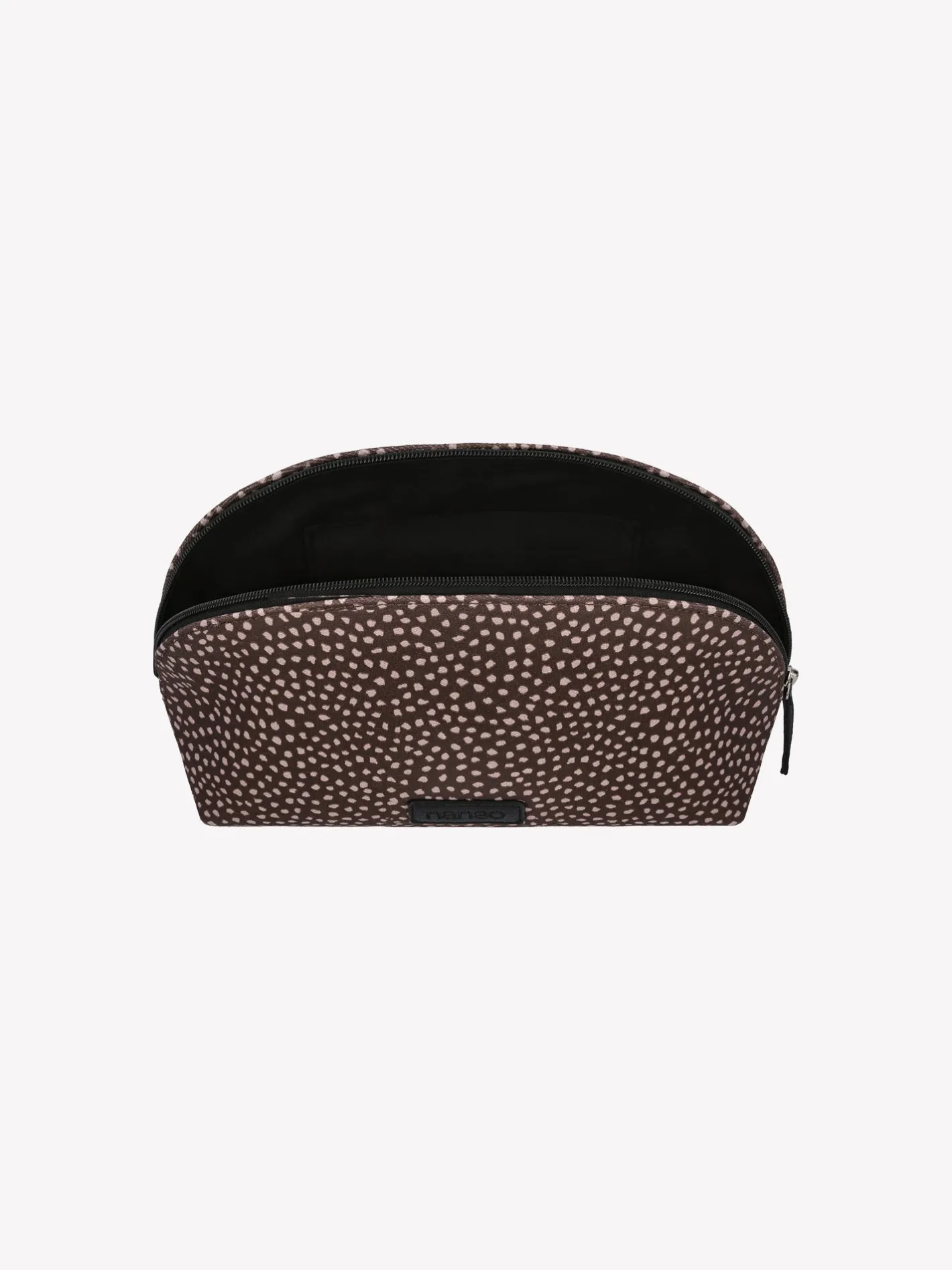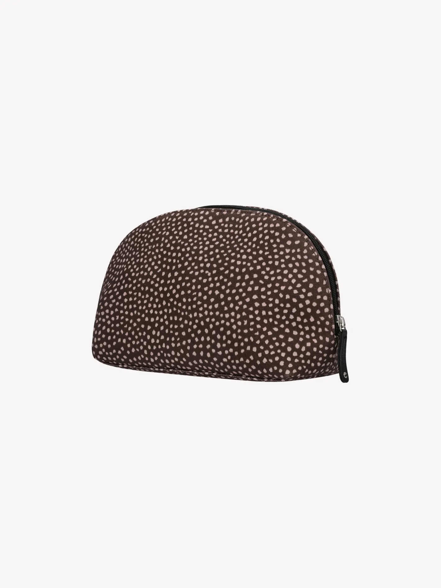 Nanson punaruskea Muru-kosmetiikkalaukku ihastuttavalla sirolla pilkkukuviolla. Muru-meikkipussin päällinen on jämäkkää puuvillaviskoosikangasta ja sisäpuolella on yksivärinen polyestervuorikangas. Kosmetiikkalaukun sisäpuolella on tasku ja päällä vetoketju. Kosmetiikkalaukun koko on noin 25 x 17 x 10 cm.