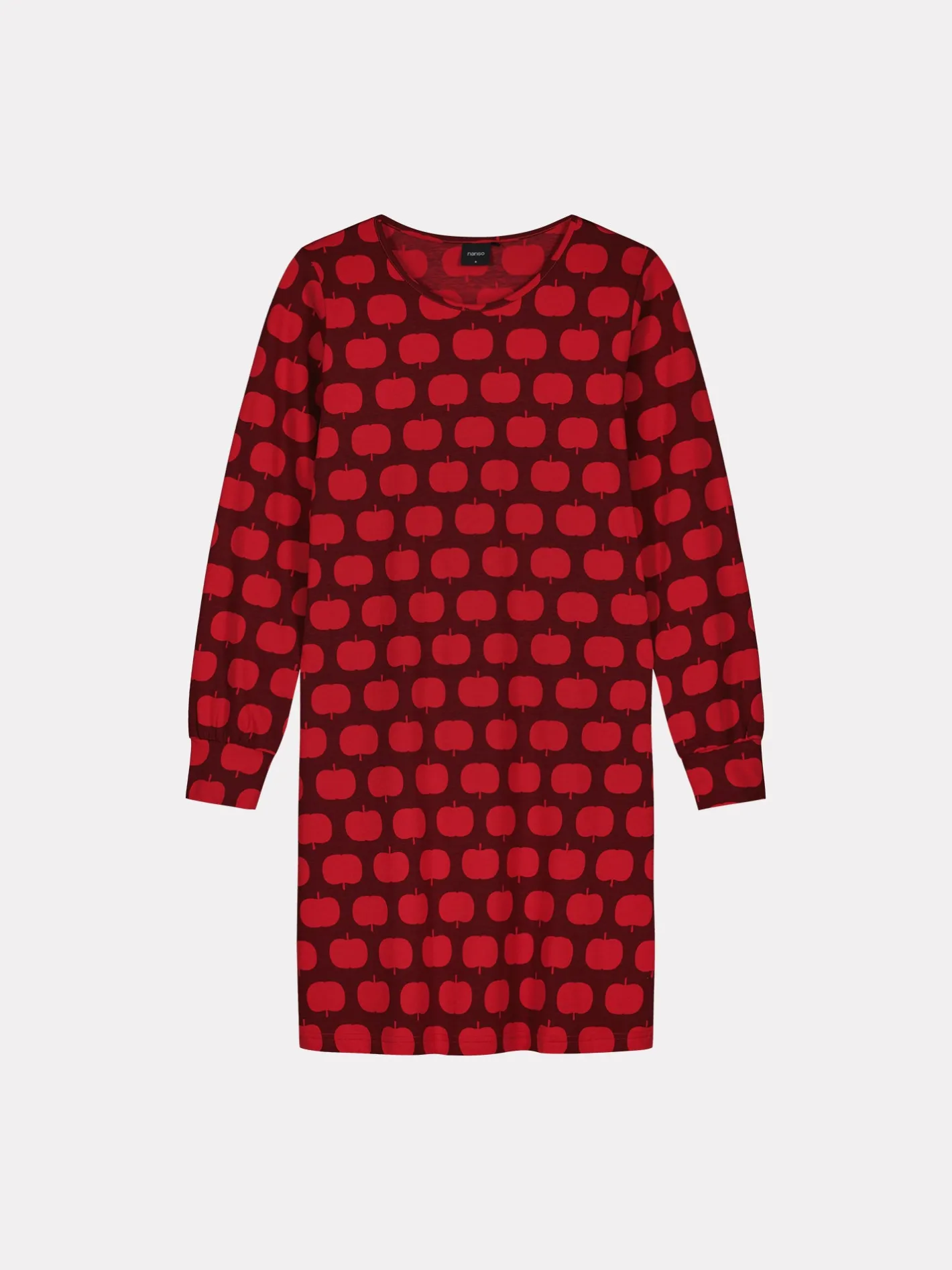 Naisten kauniskuosinen punainen Omppu-yöpaita pitkillä hihoilla ja pyöreällä pääntiellä. Hihat poimuttuvat kauniisti hihansuun leveän kaiteleen yläpuolelle. Yöpaidan pituus koossa M on noin 95 cm. Materiaali on laadukasta, iholla miellyttävän pehmeältä tuntuvaa ja helppohoitoista puuvilla-elastaania, joka pysyy hyvänä pesusta toiseen.