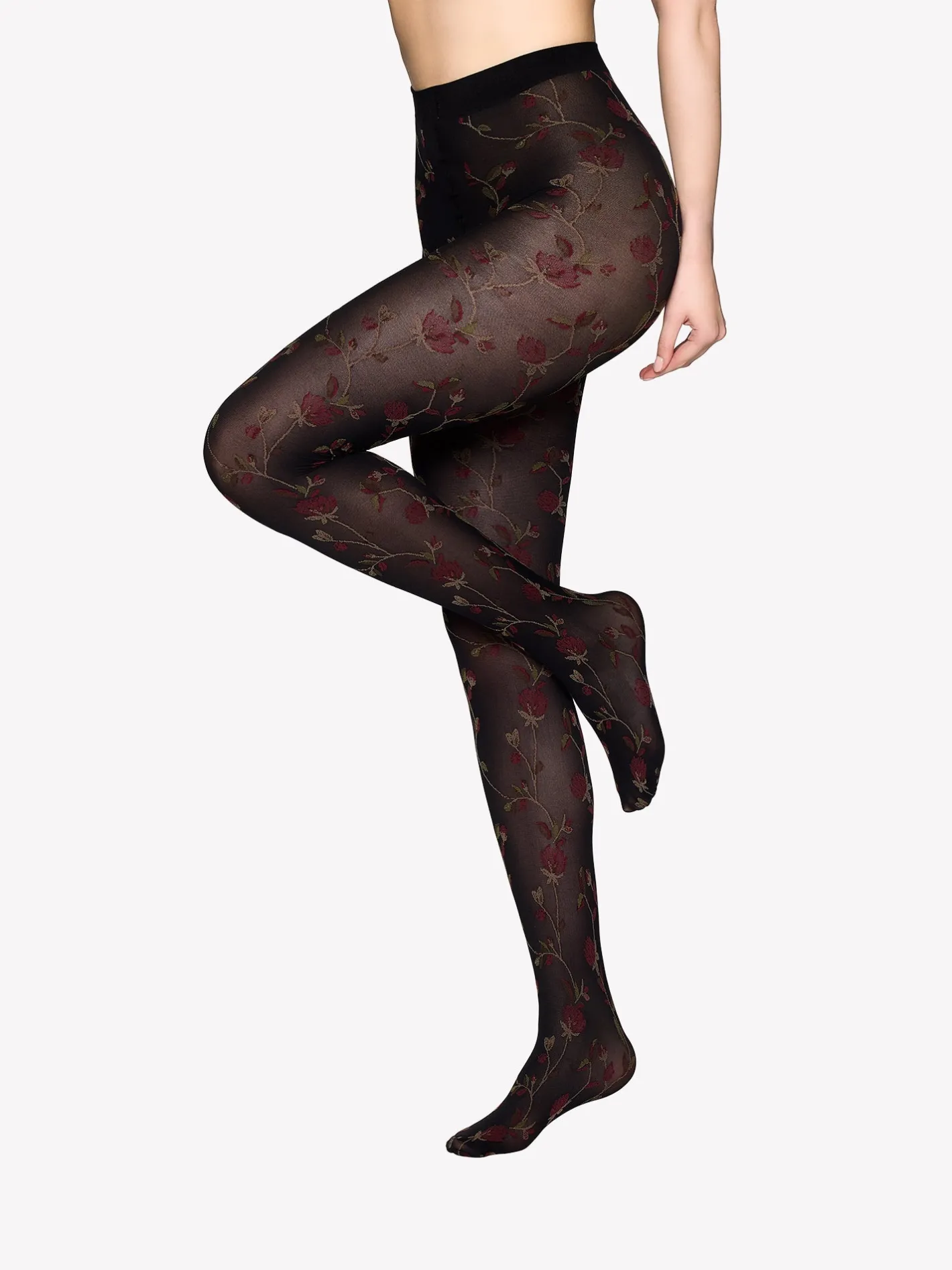 Voguen 50 denierin mustat sukkahousut kukkakuviolla. Tyylikäs punainen kukkakuvio toimii katseenvangitsijana ja viimeistelee muodikkaan asusi. Sukkahousuissa on rajaton housuosa.