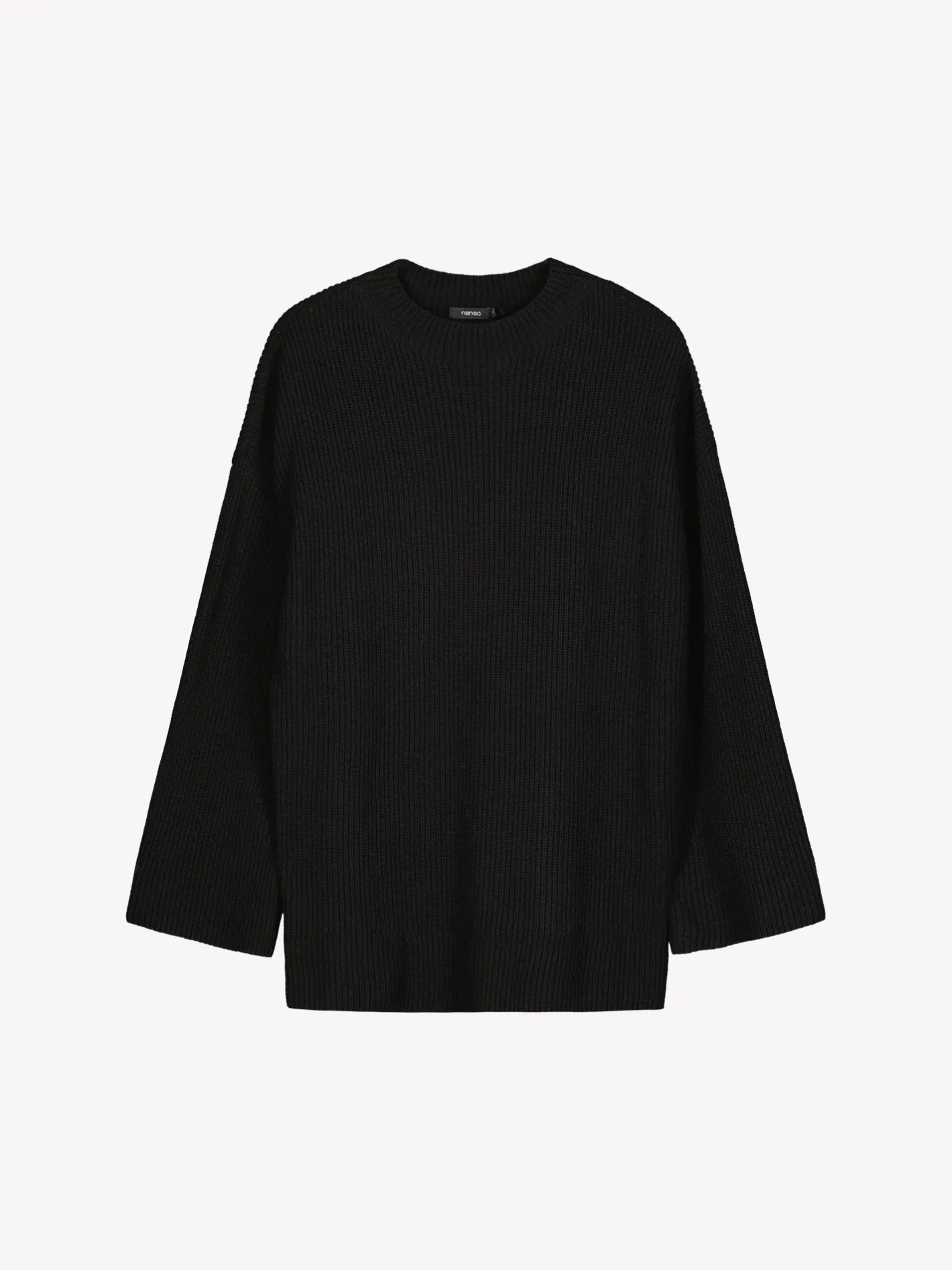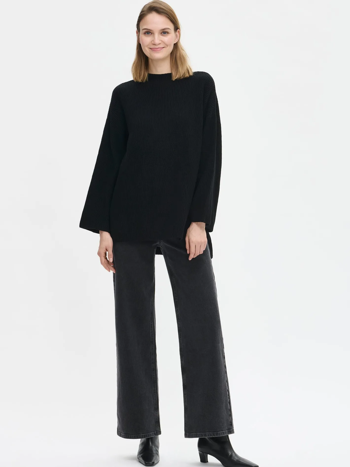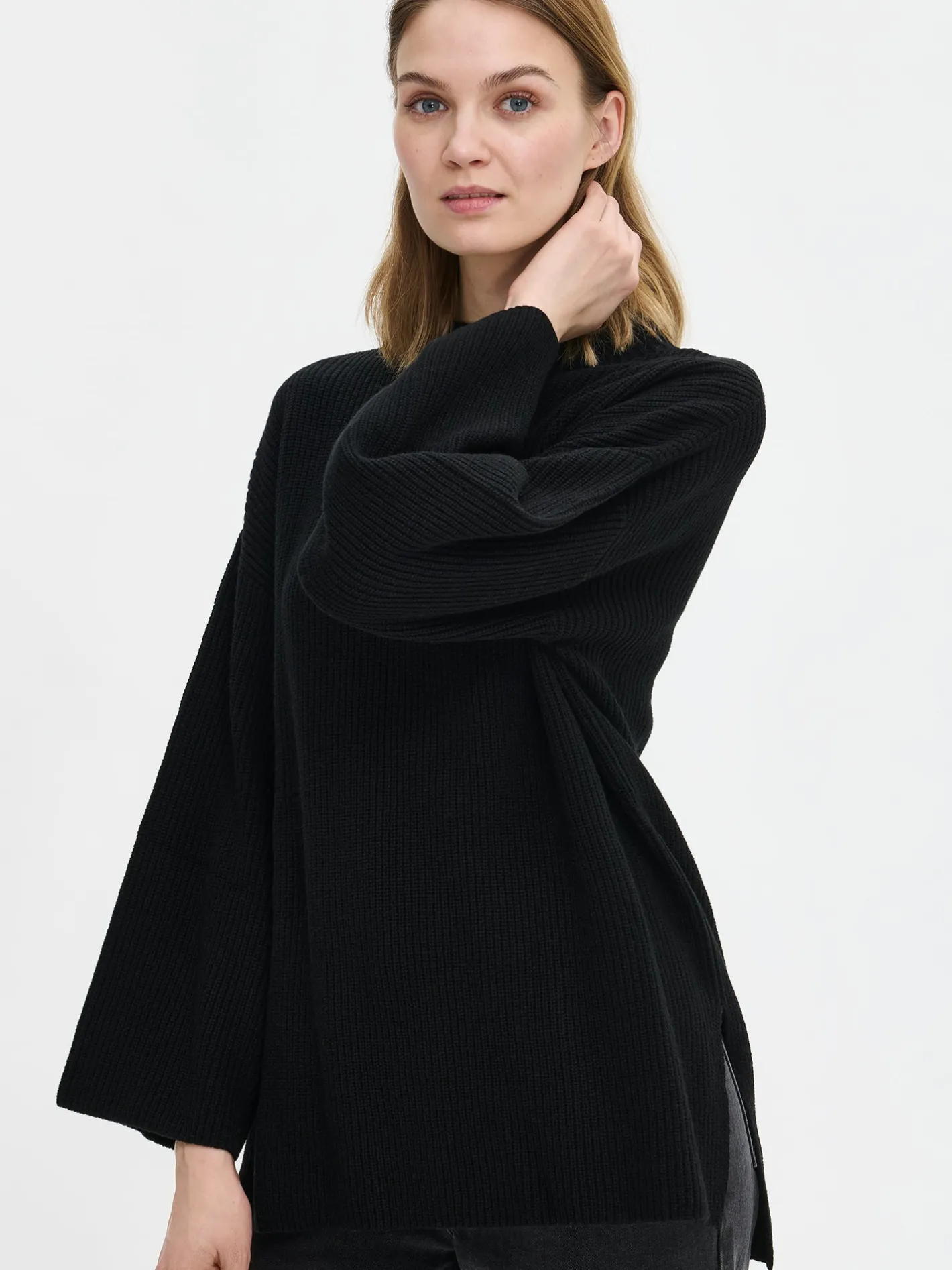 Naisten rento musta Pamela-neuletunika. Tyylikkäässä yksivärisessä tunikassa on hieman korotettu pääntie, pudotettu olkalinja ja leveät täyspitkät hihat. Tunikan helma on takaa 6 cm pidempi ja helmassa sivuissa on halkiot. Neulepuseron pituus koossa M on noin 70 cm edestä, 76 cm takaa. Neulepusero on puolipatenttineulosta. Neulos on pehmeän ja miellyttävän tuntuista villa-viskoosi-polyamidi sekoitetta. Tuotteen valmistuksessa on käytetty sertifioitua villaa.