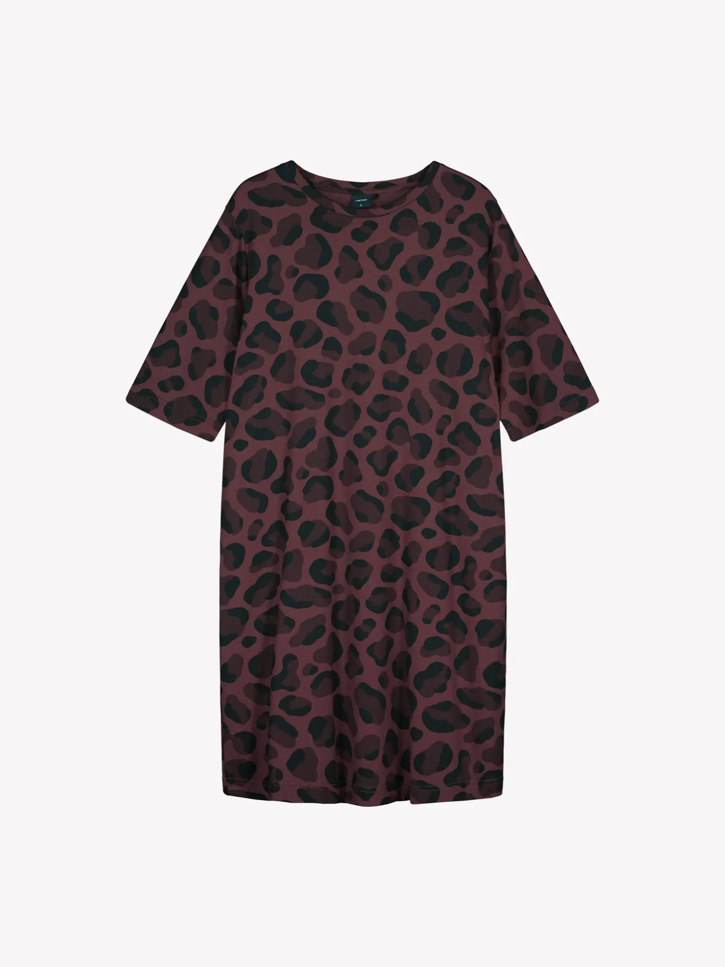 Naisten kuosillinen ruskea suoralinjainen Pantteri-yöpaita puoli pitkillä hihoilla ja pyöreällä pääntiellä. Yöpaidan pituus koossa M on noin 95 cm. Materiaali on laadukasta, iholla miellyttävän pehmeältä tuntuvaa ja helppohoitoista puuvilla-modaalia, joka pysyy hyvänä pesusta toiseen. Mukava ja rento valinta rauhallisiin kotihetkiin tai levollisiin uniin. Näyttävä Pantteri-kuosi tuo pehmeyden keskelle iloa.
