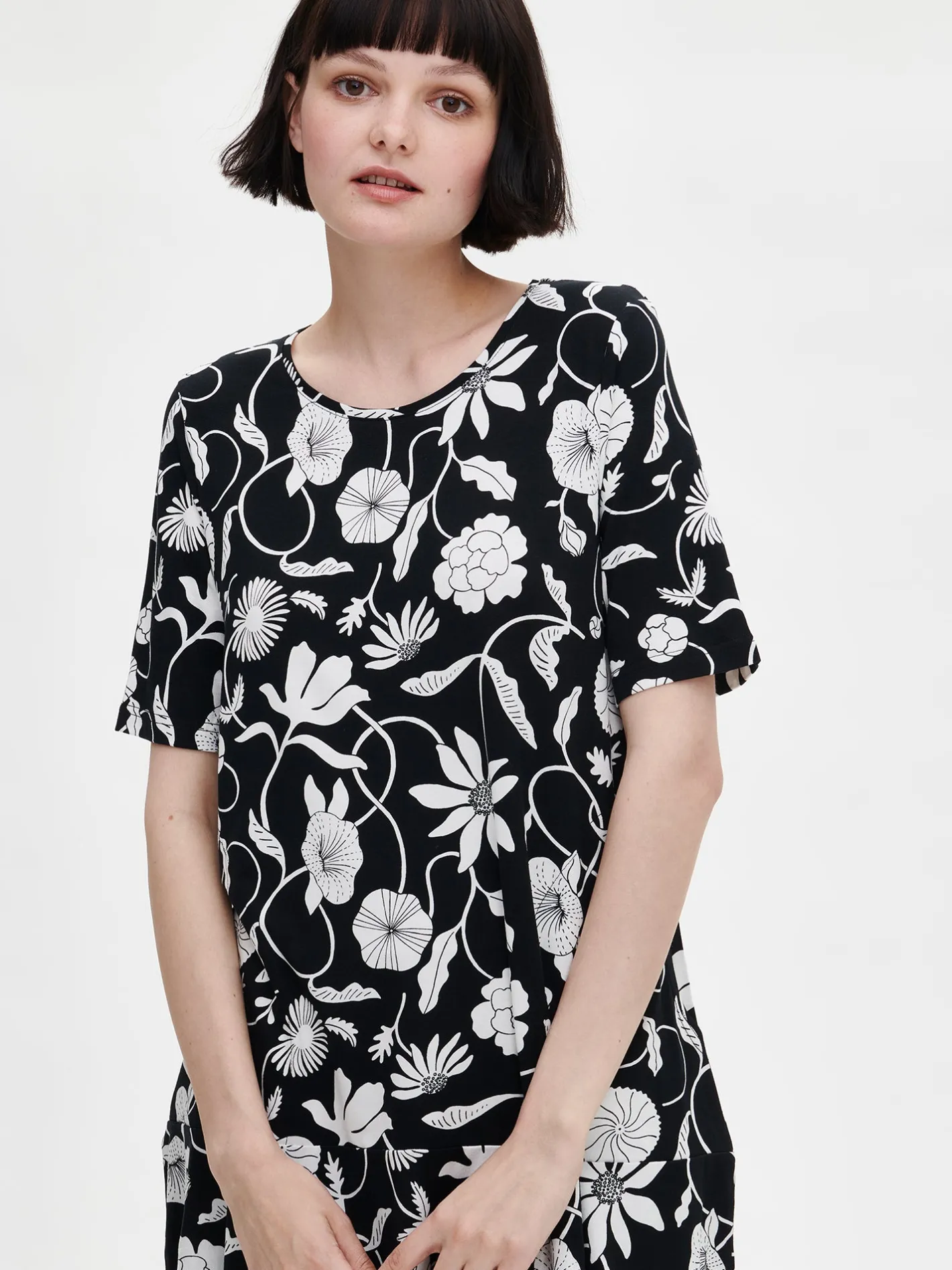 Naisten kuosillinen mustavalkoinen Pieni Linokukka-tunika. Tunikassa on tereellä viimeistelty pyöreä pääntie ja 2/4 pituiset hihat. Tunikan sivuissa on taskut ja helma on kellotettu. Tunikan pituus koossa M on noin 85 cm. Kauniisti laskeutuvan tunikan materiaali on laadukasta ja miellyttävän tuntuista viskoosi-elastaani-neulosta. Viskoosineulos on sähköistymätöntä ja helppohoitoista. Tuote on valmistettu vastuullisemmasta LENZING™ ECOVERO™ -viskoosista. Materiaalille on ominaista 3-5% kutistuminen ensimmäisessä pesussa.