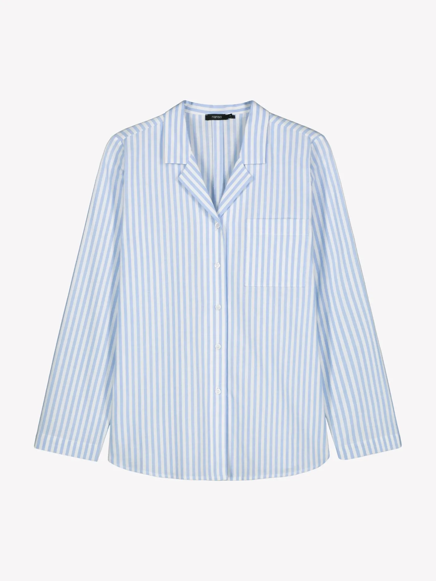 Naisten raidallinen Polka-pyjamapaita vaaleansinisessä värissä. Pitkähihaisessa pyjamapaidassa on kauniisti muotoiltu kaulus, nappilista ja pyöristetty helma. Puseron pituus koossa M on noin 70 cm. Materiaali on pehmeää ja miellyttävän tuntuista puuvillaflanellikangasta. Materiaalille on ominaista 3-5% kutistuminen ensimmäisessä pesussa.