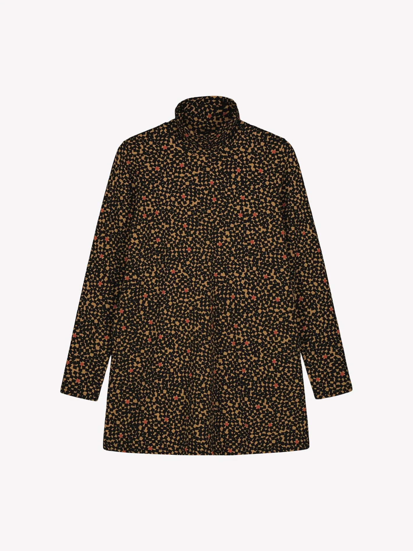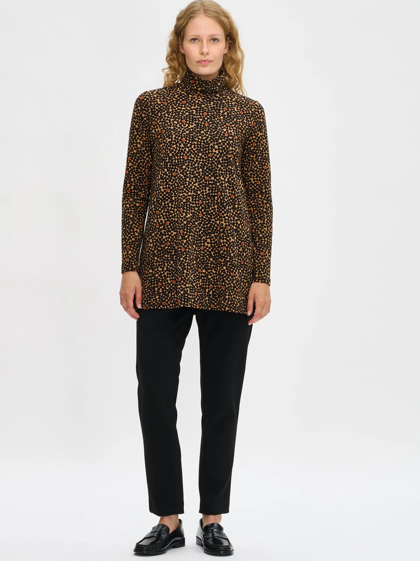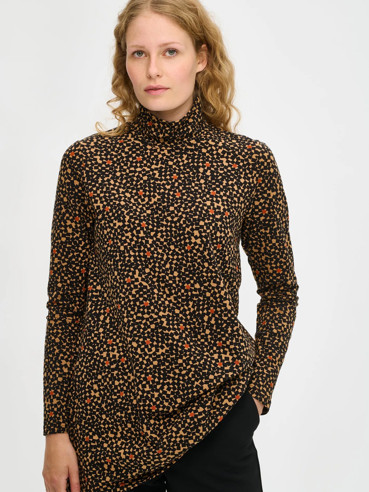Naisten kuviollinen ruskea Polku-tunika. A-linjaisessa tunikassa on matala poolokaulus, täyspitkät hihat ja sivutaskut. Tunikan pituus koossa M on noin 80 cm. Materiaali on miellyttävän tuntuista ja helppohoitoista puuvilla-elastaani-neulosta.