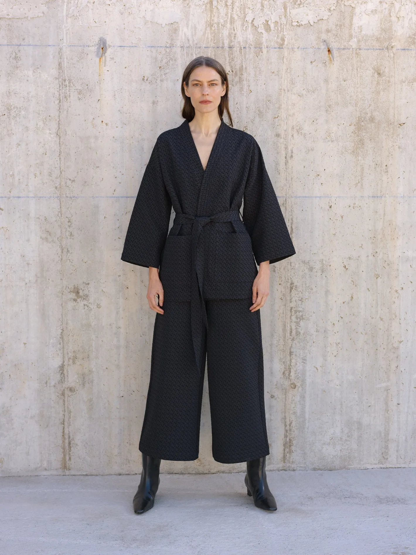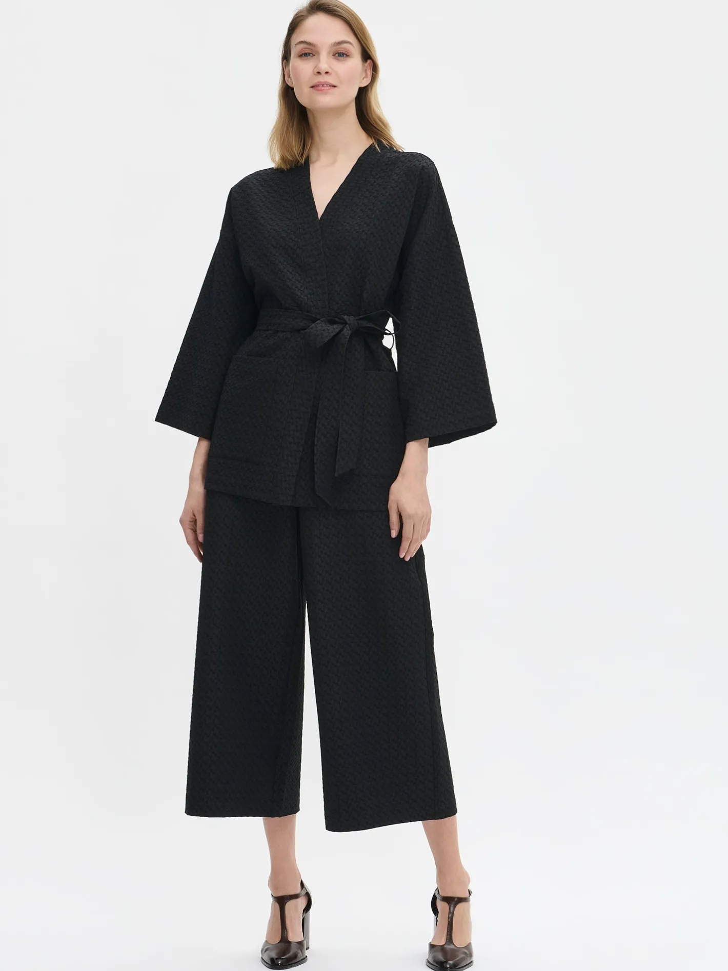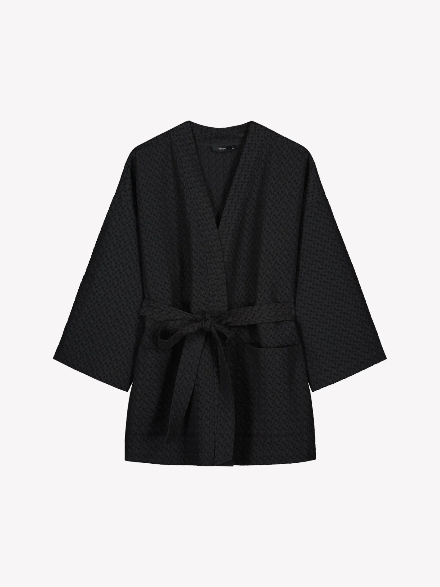 Naisten musta Reliefi-takki kauniilla struktuuripinnalla ja vyöllä. Ihana kimonotakki sopii niin juhlaan kuin arkeen – yhdistä se vaikkapa samanvärisen Reliefi-hameeseen tai mekkoon. Kimonomallisen takin pääntie ja miehustan reunat on viimeistelty leveällä listalla. Takissa on pudotettu olkalinja ja suoralinjaiset hihat. Edessä on päälle ommellut taskut ja vyötäröllä vyölenkeillä kiinnitetty vyö. Takin pituus koossa M on noin 77 cm. Materiaali on miellyttävän tuntuista kudottua polyesteri-viskoosi-elastaani-kangasta, jossa on kaunis pintastruktuuri. Materiaalille on ominaista 3-5 % kutistuminen ensimmäisessä pesussa. Suosittelemme tuotteen pesua ennen käyttöä, koska tuotteesta saattaa irrota väriä ennen ensimmäistä pesua.