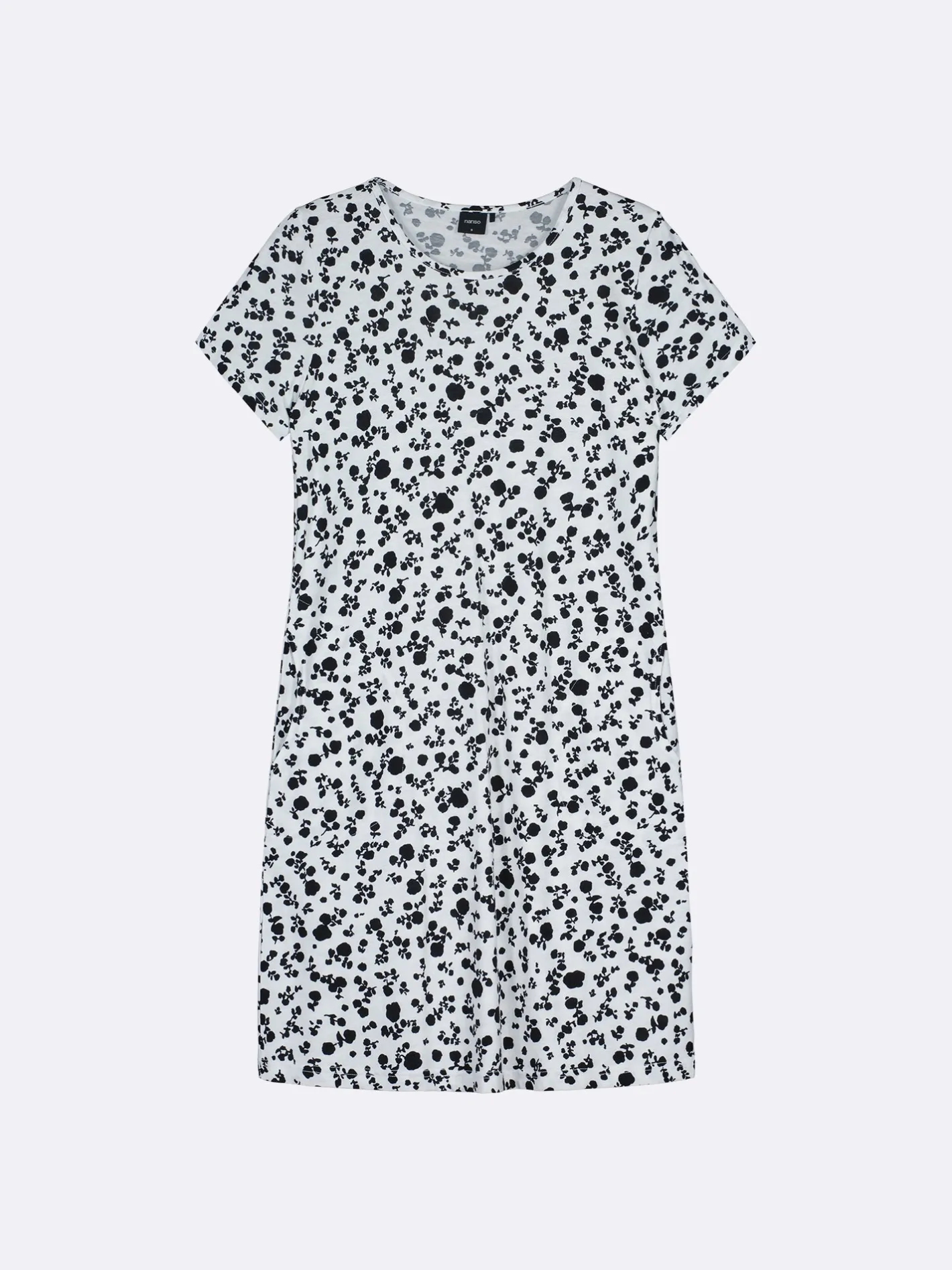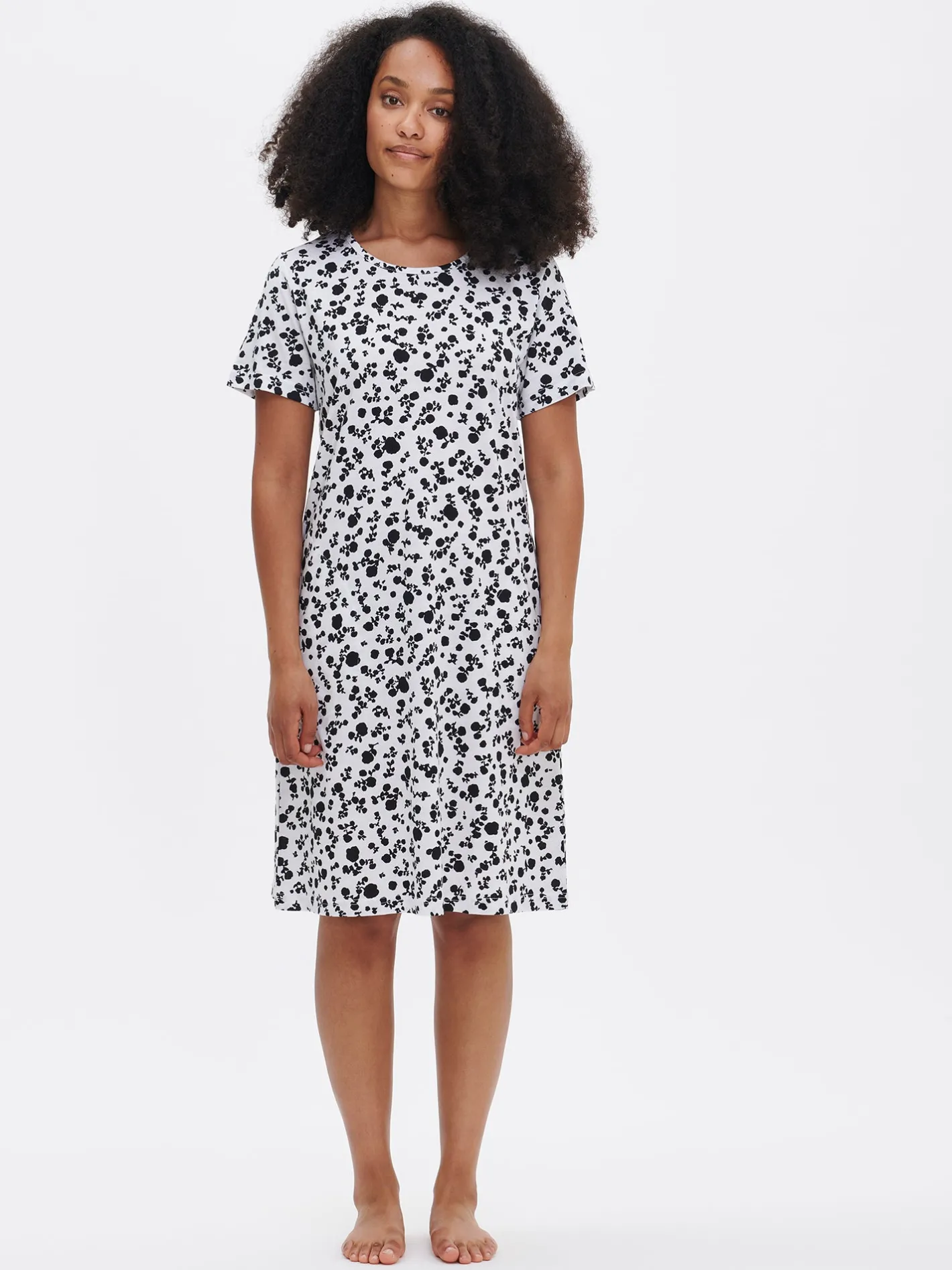 Naisten kuosillinen mustavalkoinen Roosa-yöpaita lyhyillä hihoilla, sivutaskuilla ja pyöreällä pääntiellä. Yöpaidan pituus koossa M on noin 95 cm. Materiaali on laadukasta, iholla miellyttävän pehmeältä tuntuvaa ja helppohoitoista puuvilla-modaalia, joka pysyy hyvänä pesusta toiseen. Ihastuttava siro kuosi ja käytännölliset taskut tekevät tästä yöpaidasta täydellisen valinnan rentoihin hetkiin, tuoden raikkautta ja tyyliä jokaiseen yöhön.