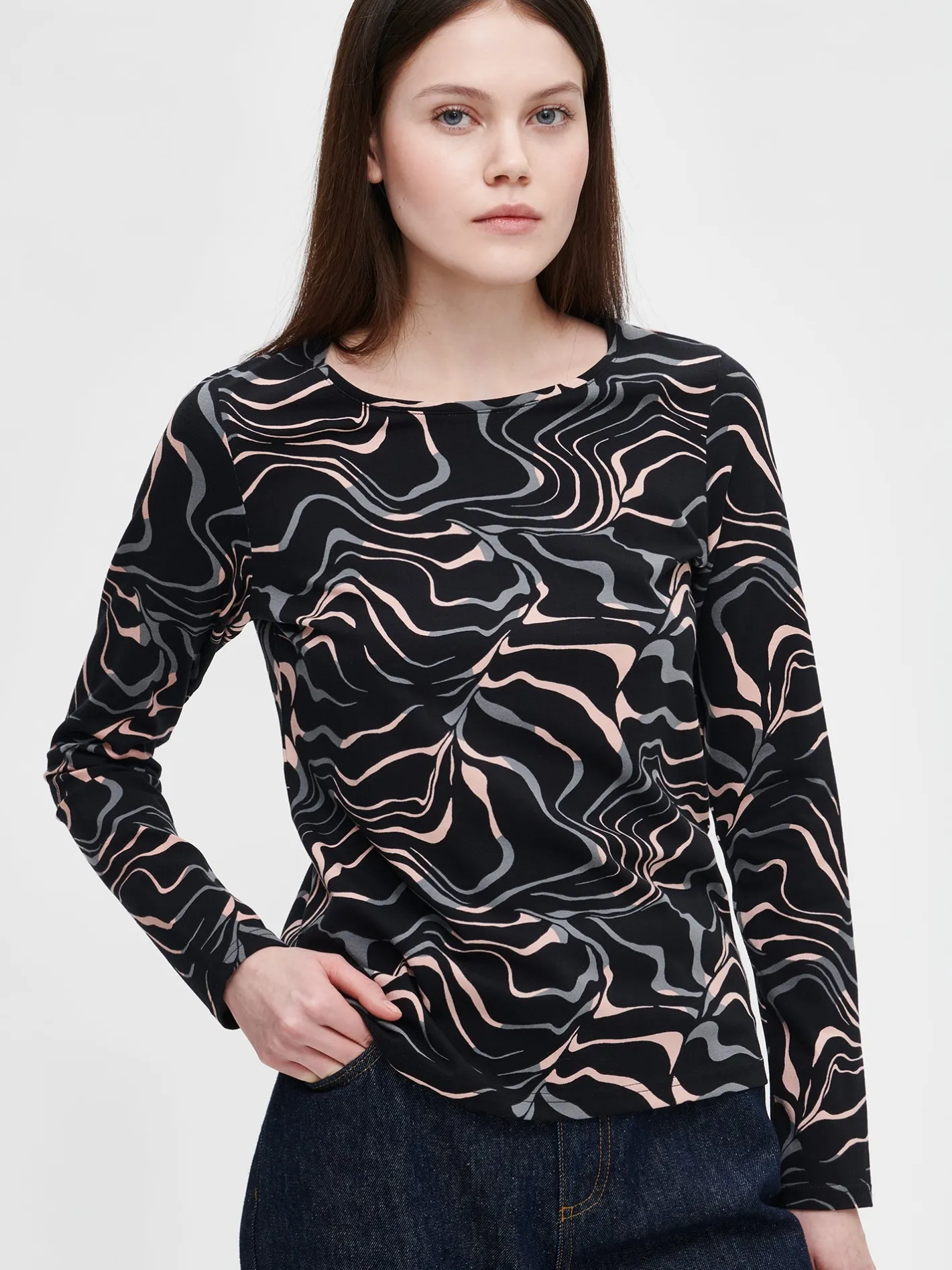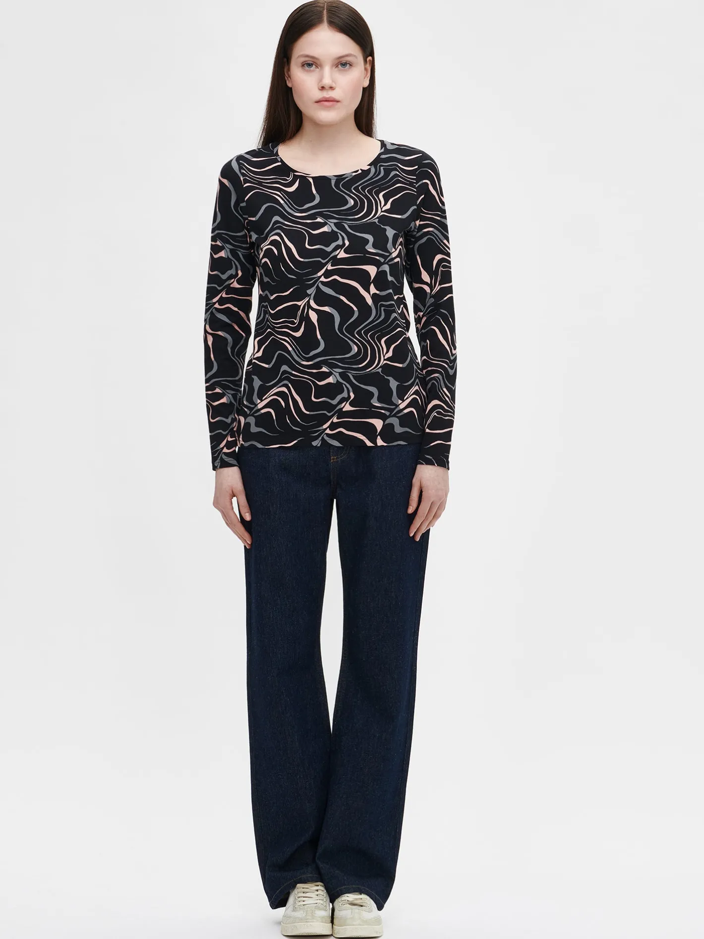 Naisten musta Saara-pusero kauniilla kuosilla ja pitkillä hihoilla. Yksinkertaisen tyylikäs ja mukava pusero on arjen luottovaate. Istuvassa puserossa on tereellä viimeistelty pyöreä pääntie ja täyspitkät hihat. Puseron pituus koossa M on noin 65 cm. Materiaali on miellyttävän tuntuista ja helppohoitoista puuvilla-elastaani-neulosta.