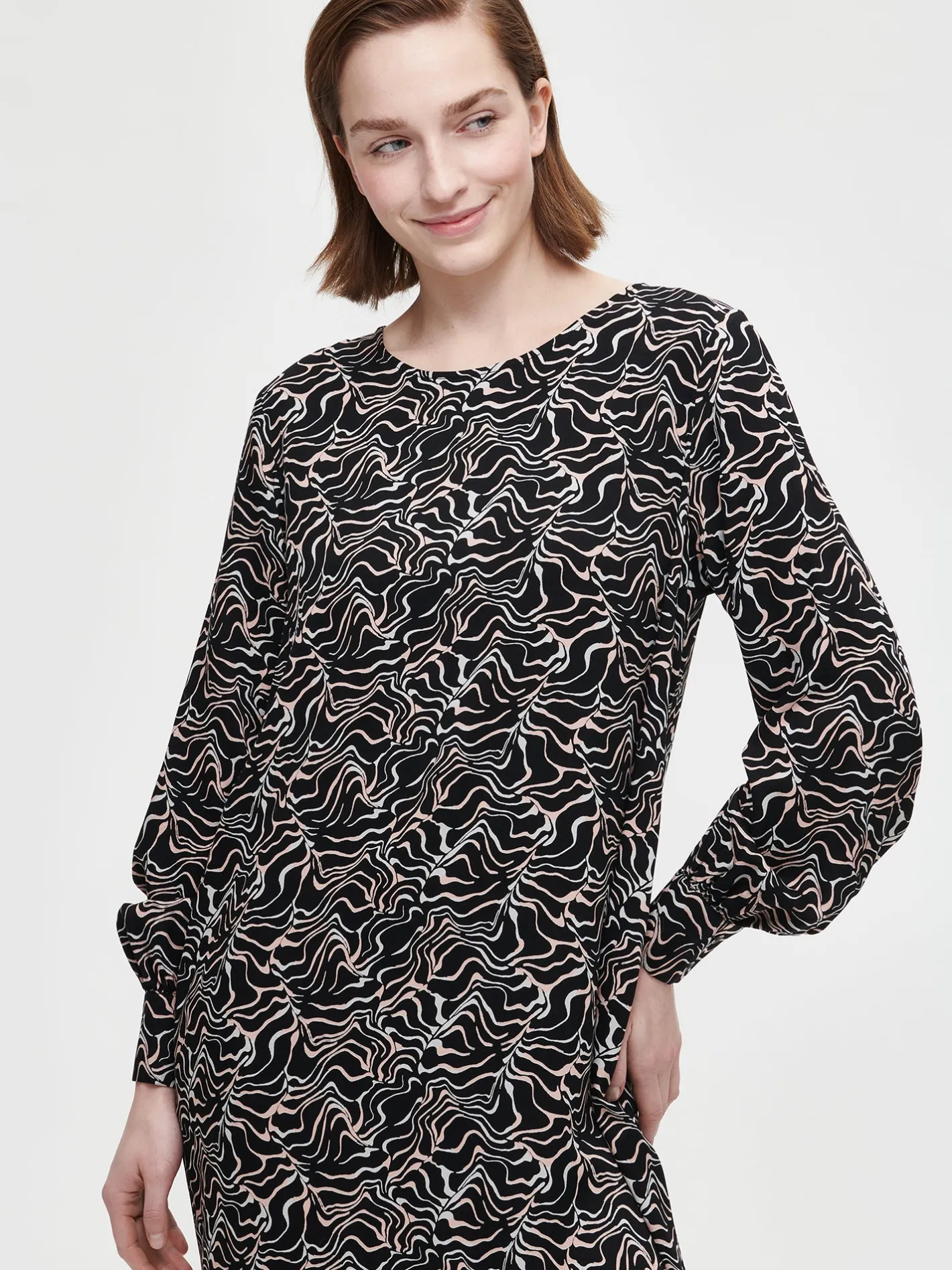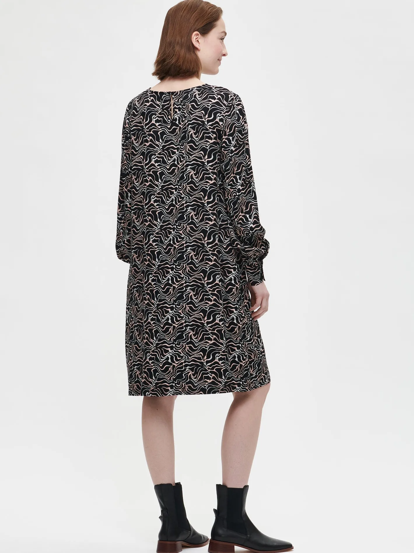 Naisten musta kuosillinen Sara-mekko pitkillä hihoilla. Tyylikäs midimittainen kangasmekko on helppo valinta arkeen. Mekossa on pyöreä pääntie, jossa takana pisaran muotoinen nappihalkio sekä sivutaskut ja suora helma. Täyspitkät hihat poimuttuvat hihansuun leveän nappikalvosimen yläpuolelle. Mekon pituus koossa 38 on noin 100 cm. Materiaali on kauniisti laskeutuvaa twillisidoksista viskoosikangasta. Materiaalille on ominaista 3-5% kutistuminen ensimmäisessä pesussa.