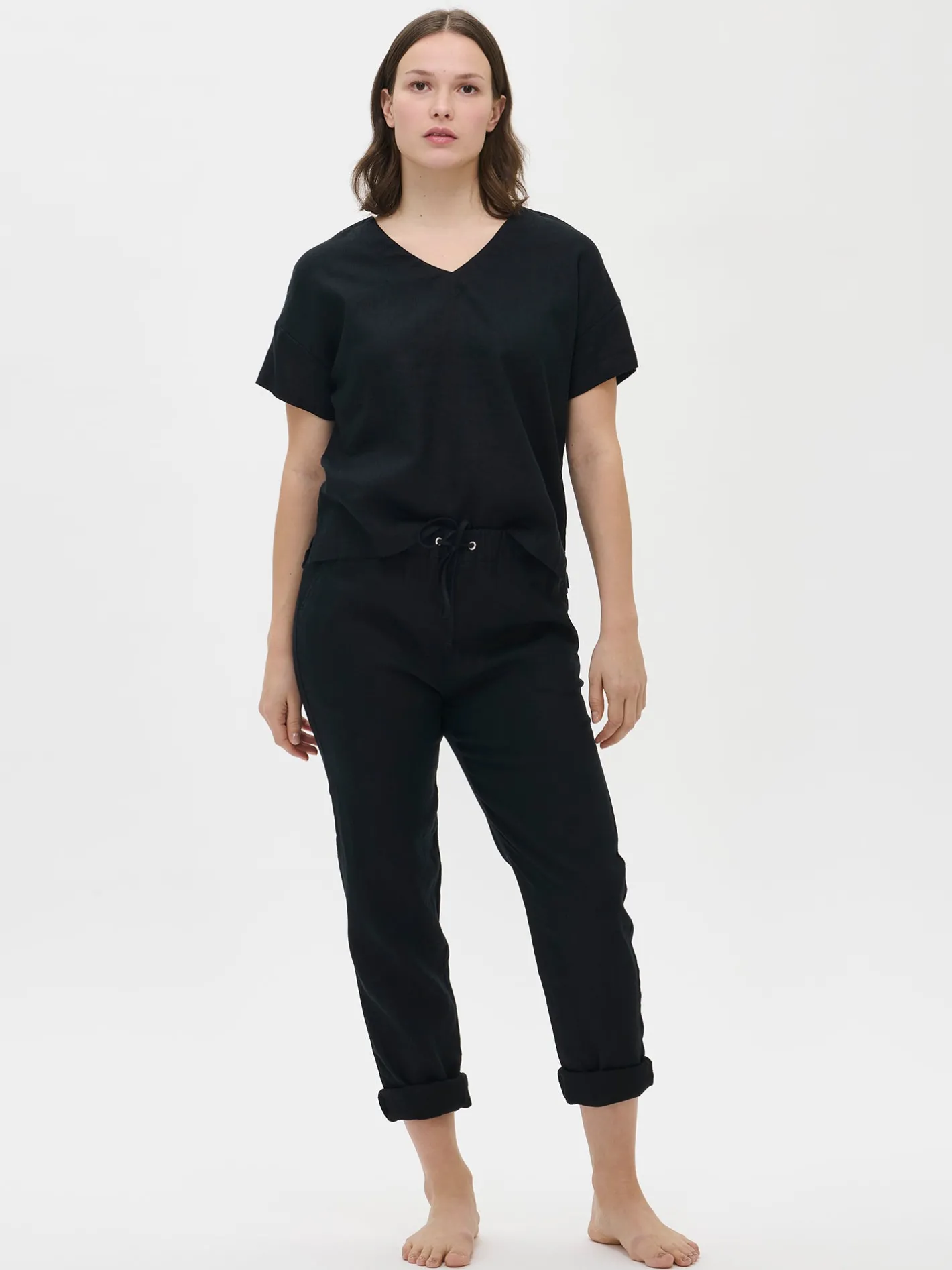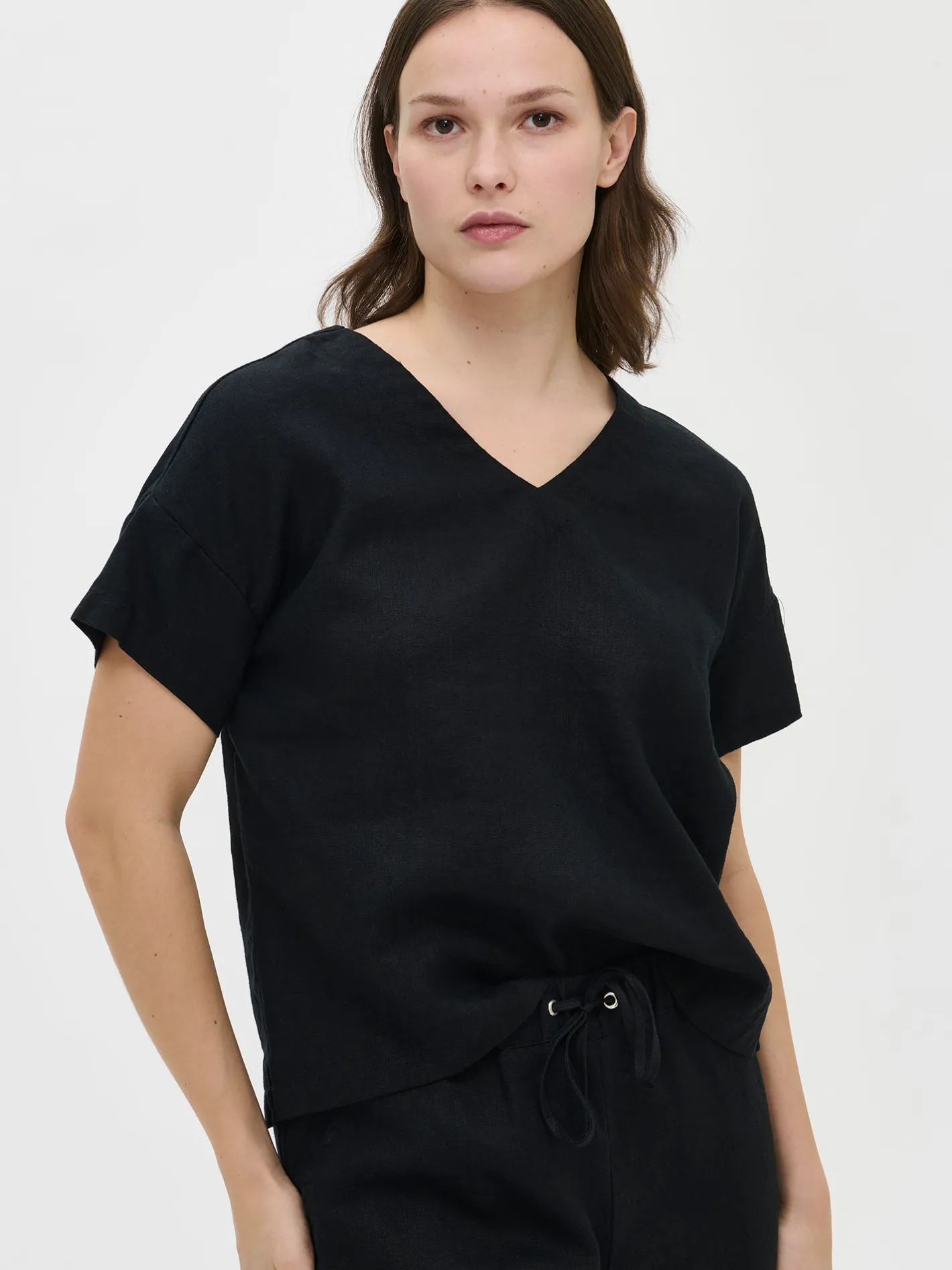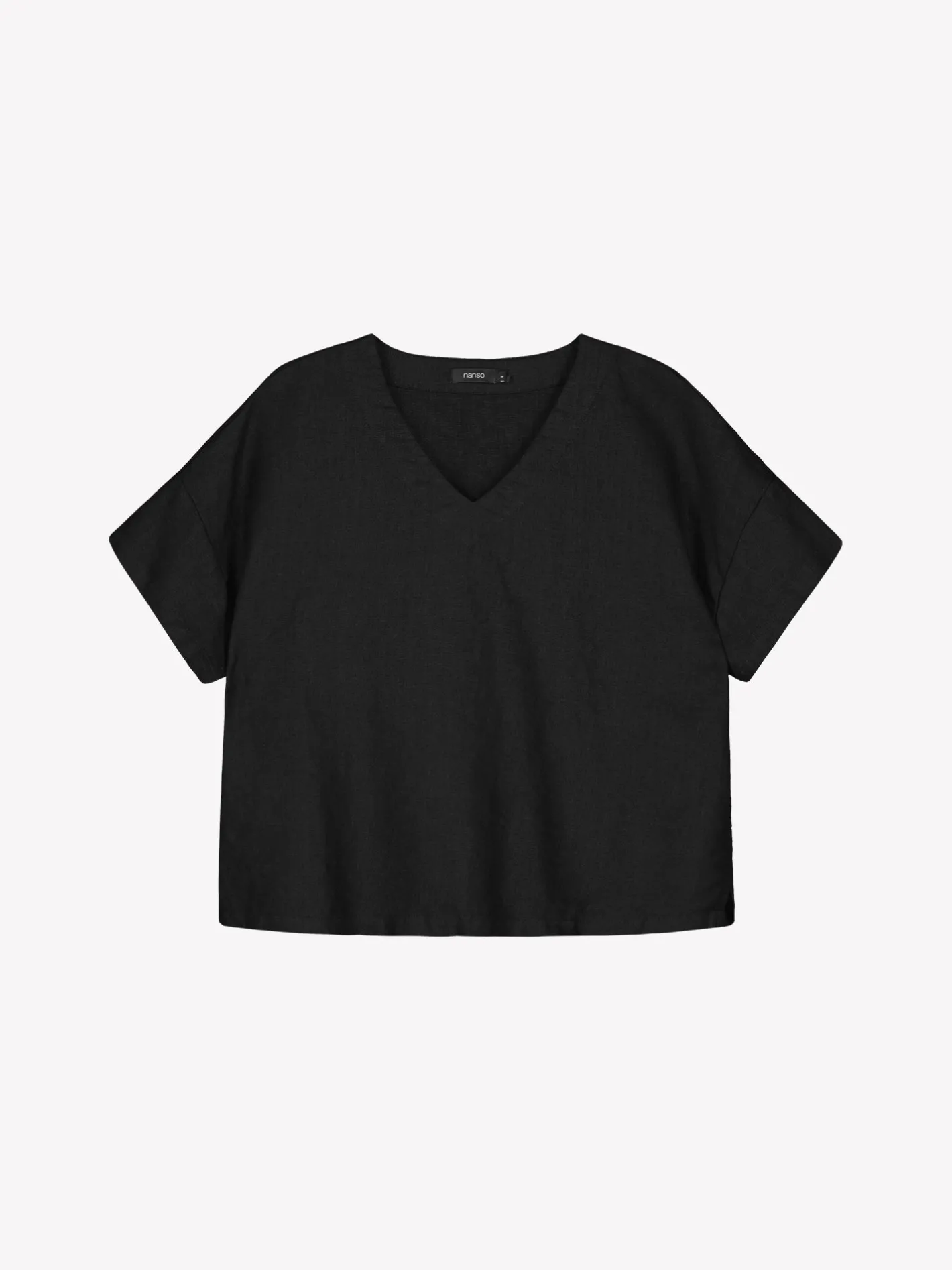 Naisten rento musta yksivärinen Sarastus-pusero. Laatikkomaisessa puserossa on alavaralla viimeistelty V-pääntie, lyhyet hihat, suora helma ja halkiot sivuissa. Puseron pituus koossa M on noin 61 cm. Materiaali on kudottua pellavakangasta, joka on kestävää ja hengittävää. Pellavan miellyttävä ja kevyt tuntuma tekevät puserosta täydellisen valinnan rentoon ja huolettomaan oleiluun. Pellavalle on ominaista luonnollinen pieni rypistyminen. Tuote on esipesty tuotannossa, joten se ei kutistu ensimmäisessä pesussa.