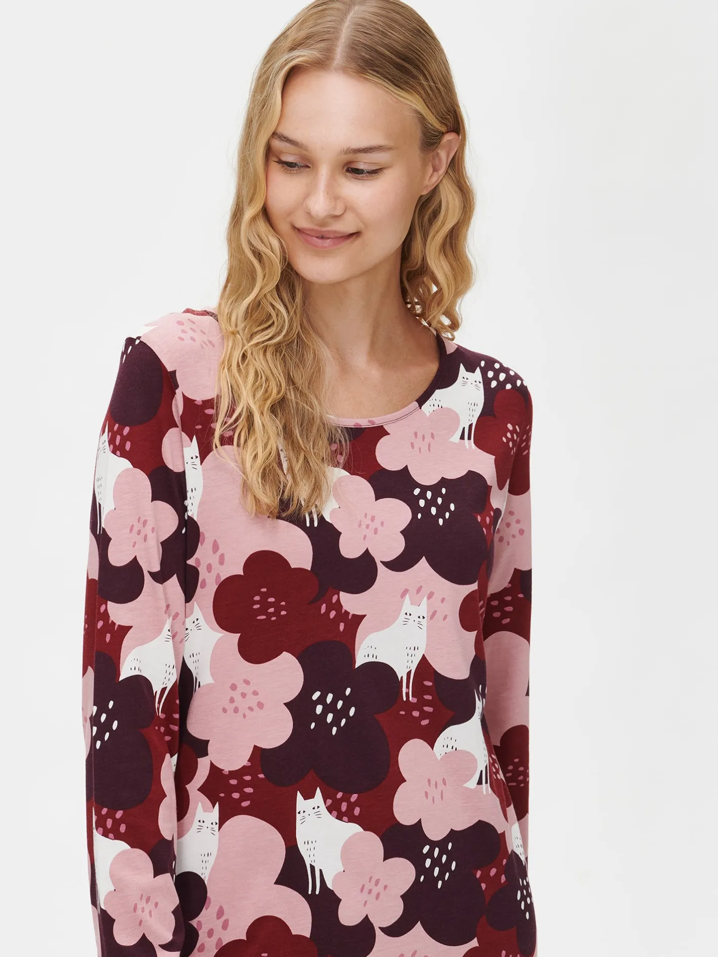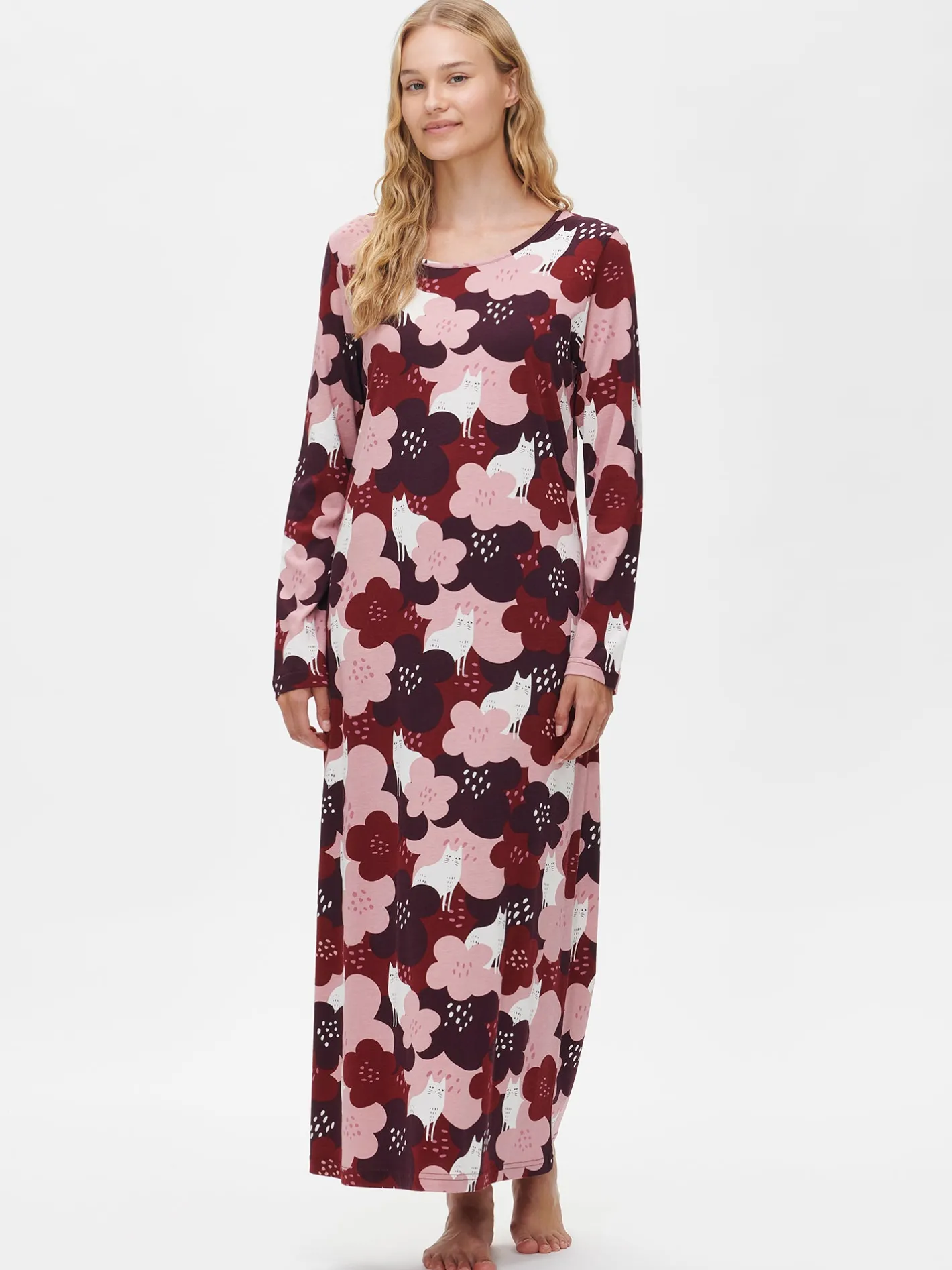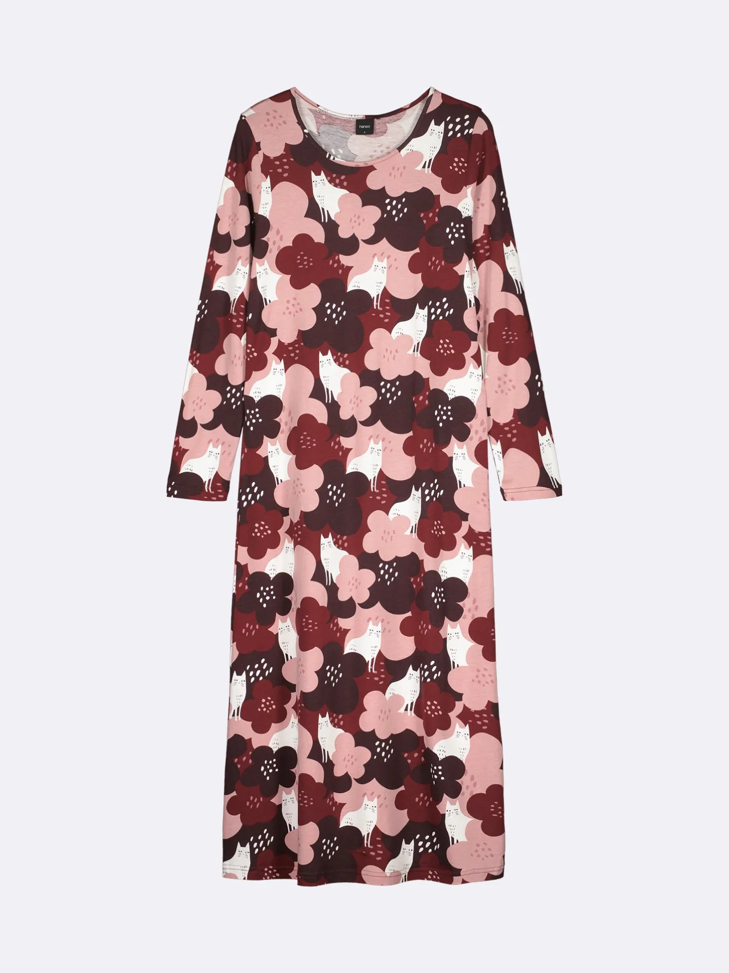 Naisten kuosillinen punasävyinen Sylvi-yöpaita pitkillä hihoilla ja pyöreällä pääntiellä. Yöpaidan pituus koossa M on noin 130 cm. Materiaali on laadukasta, iholla miellyttävän pehmeältä tuntuvaa ja helppohoitoista puuvilla-modaalia, joka pysyy hyvänä pesusta toiseen.