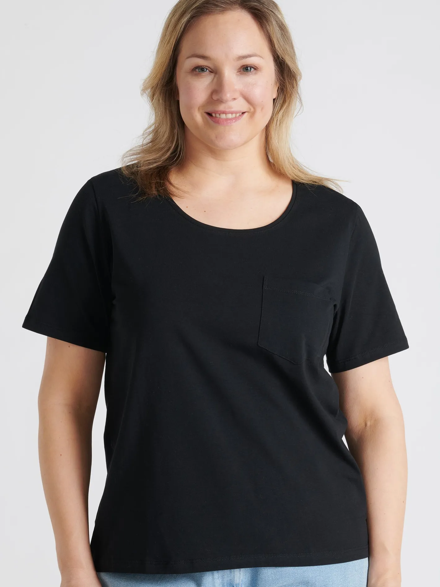 Naisten tyylikäs valkoinen Tasku t-paita pyöreällä pääntiellä. Klassiseen t-paitaan voi aina luottaa, sillä se sopii vaivattomasti jokaiseen asuun. Hihat ovat lyhyet ja paidassa on rintatasku. T-paidan pituus koossa M on noin 65 cm. Materiaali on miellyttävää ja joustavaa puuvilla-elastaani-neulosta.
