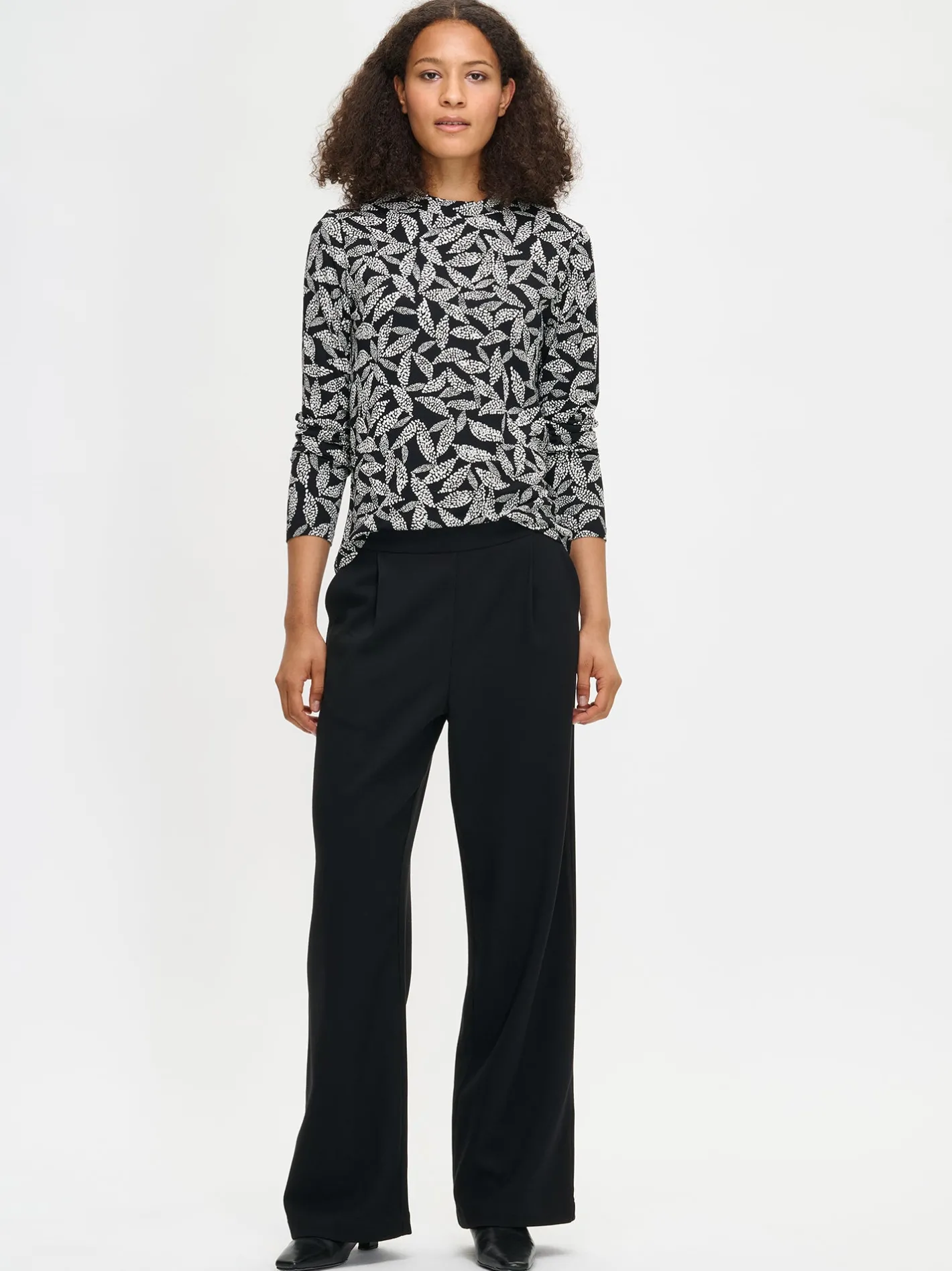 Naisten kuosillinen mustavalkoinen Triine-pusero pienellä pystykauluksella. Suoralinjaisessa puserossa on täyspitkät hihat. Puseron pituus koossa M on noin 65 cm. Materiaali on laadukasta ja miellyttävän tuntuista, ohutta viskoosi-elastaani-neulosta. Viskoosineulos on sähköistymätöntä ja helppohoitoista. Tuote on valmistettu LENZING™ ECOVERO™ -viskoosista. Materiaalille on ominaista 3-5 % kutistuminen ensimmäisessä pesussa.