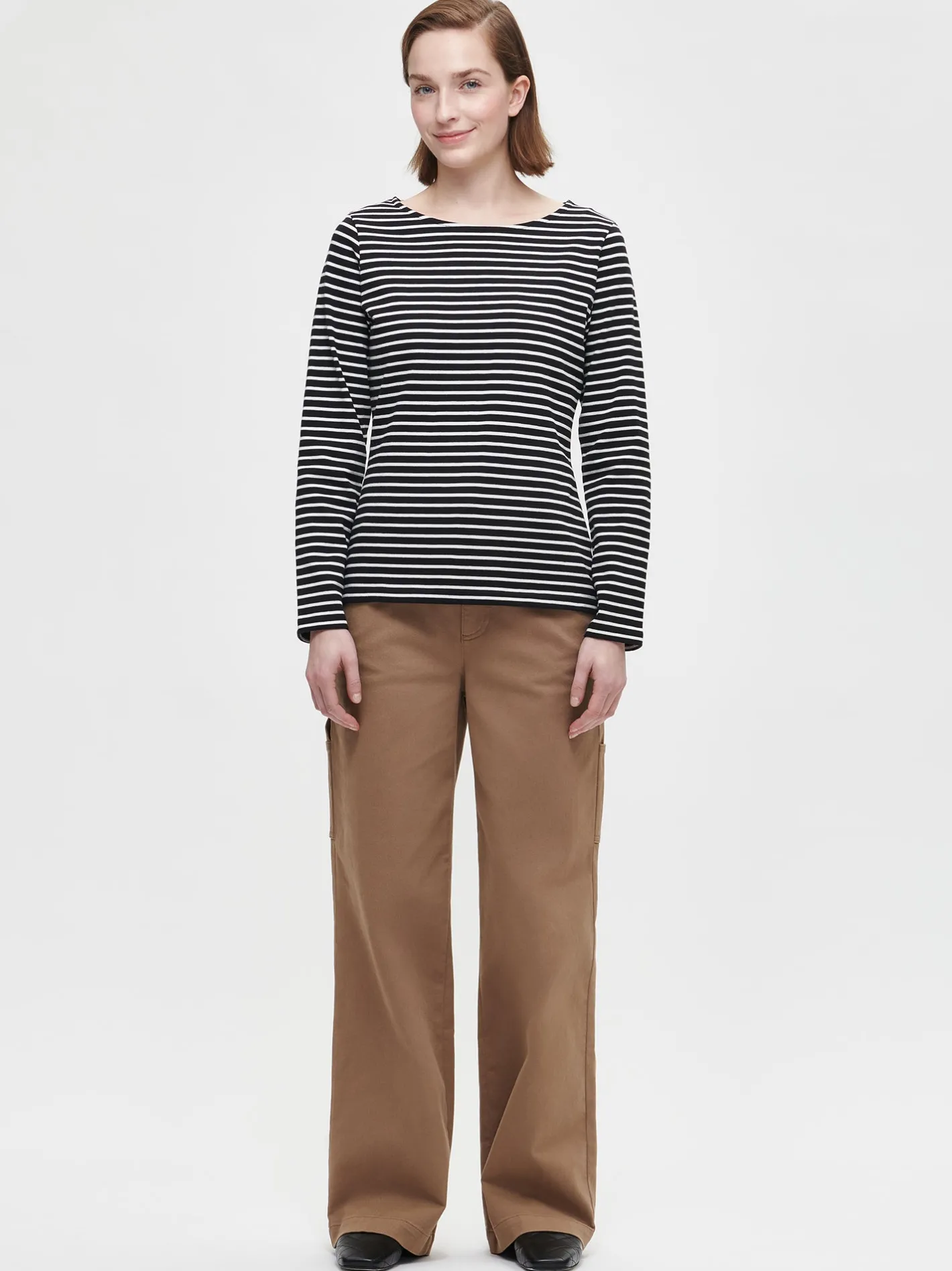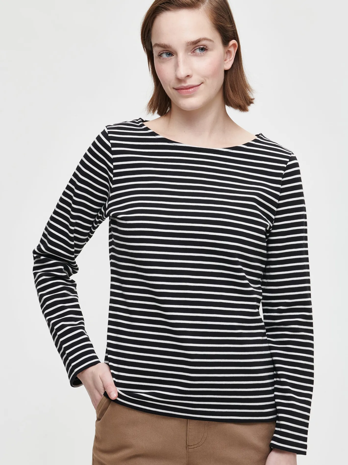 Naisten pitkähihainen raidallinen mustavalkoinen Vaaka-pusero. Istuvassa puserossa on kantilla viimeistelty venepääntie ja täyspitkät hihat. Puseron pituus koossa M on noin 65 cm. Materiaali on miellyttävän tuntuista ja helppohoitoista puuvillaneulosta. Materiaalille on ominaista 3-5% kutistuminen ensimmäisessä pesussa. Pesun jälkeen muotoile tuote kosteana.