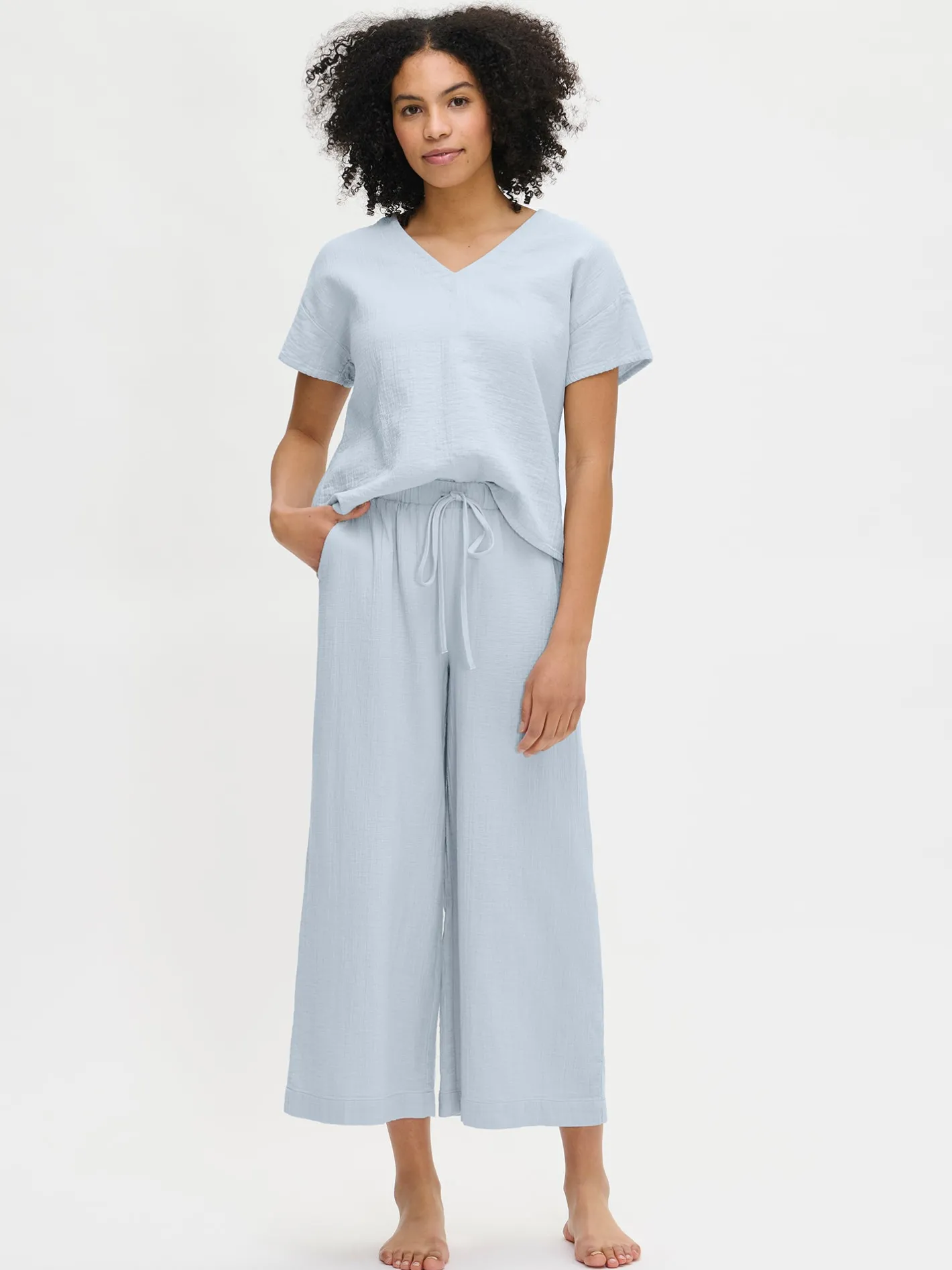 Naisten yksiväriset vaaleansiniset Aamu-housut sivutaskuilla. Vyötäröllä on mukava kuminauharakenne kiristysnauhalla. Rennot, leveälahkeiset housut ovat tyylikkäästi 7/8-pituiset. Materiaali on kevyttä kaksikerroksista pintastruktuurillista puuvillamusliini-kangasta. Nämä housut tarjoavat täydellisen yhdistelmän rentoutta ja käytännöllisyyttä. Sivutaskut lisäävät mukavuutta ja tekevät niistä ihanan valinnan päivittäisiin, kiireettömiin hetkiin kotona.