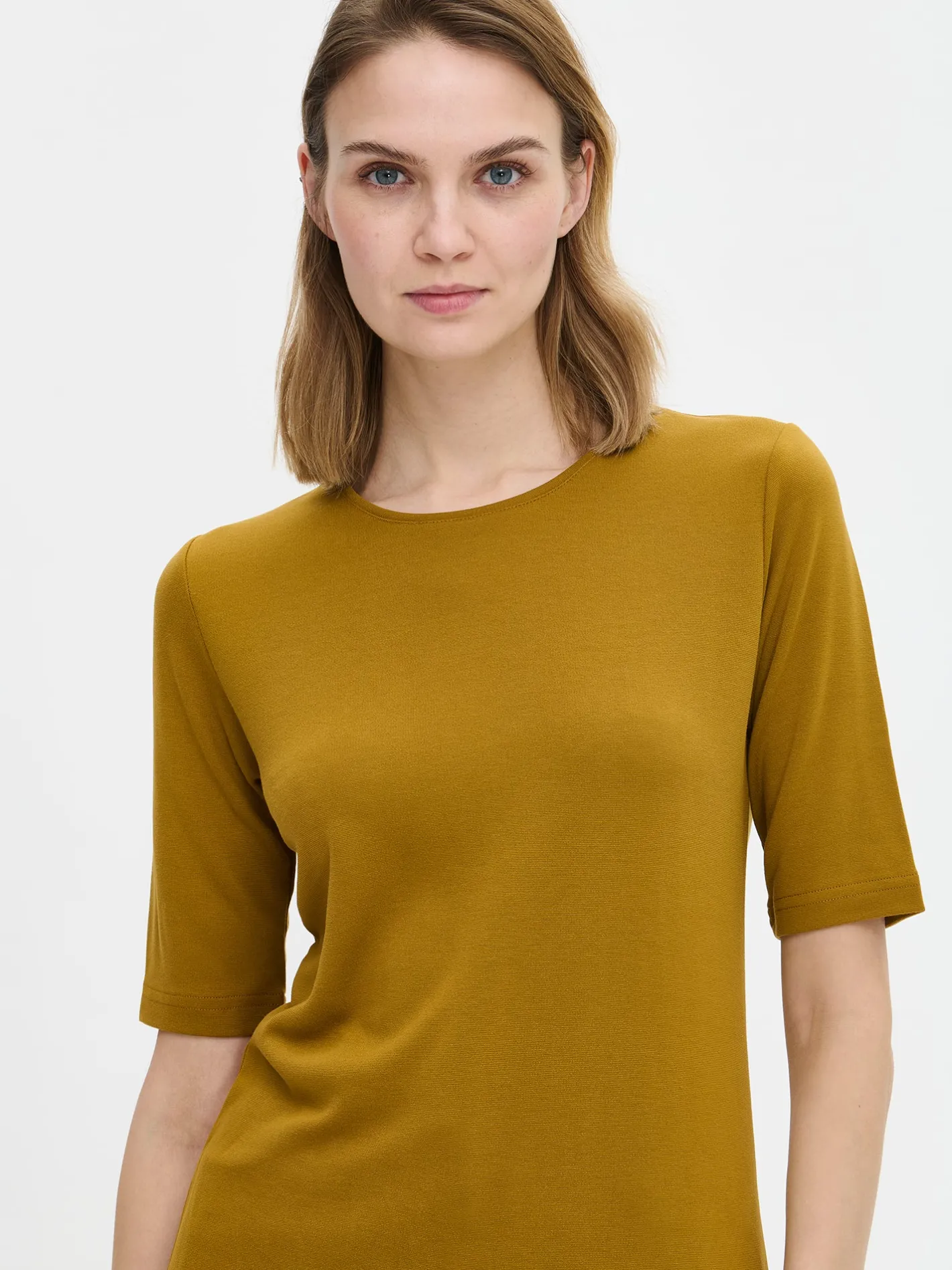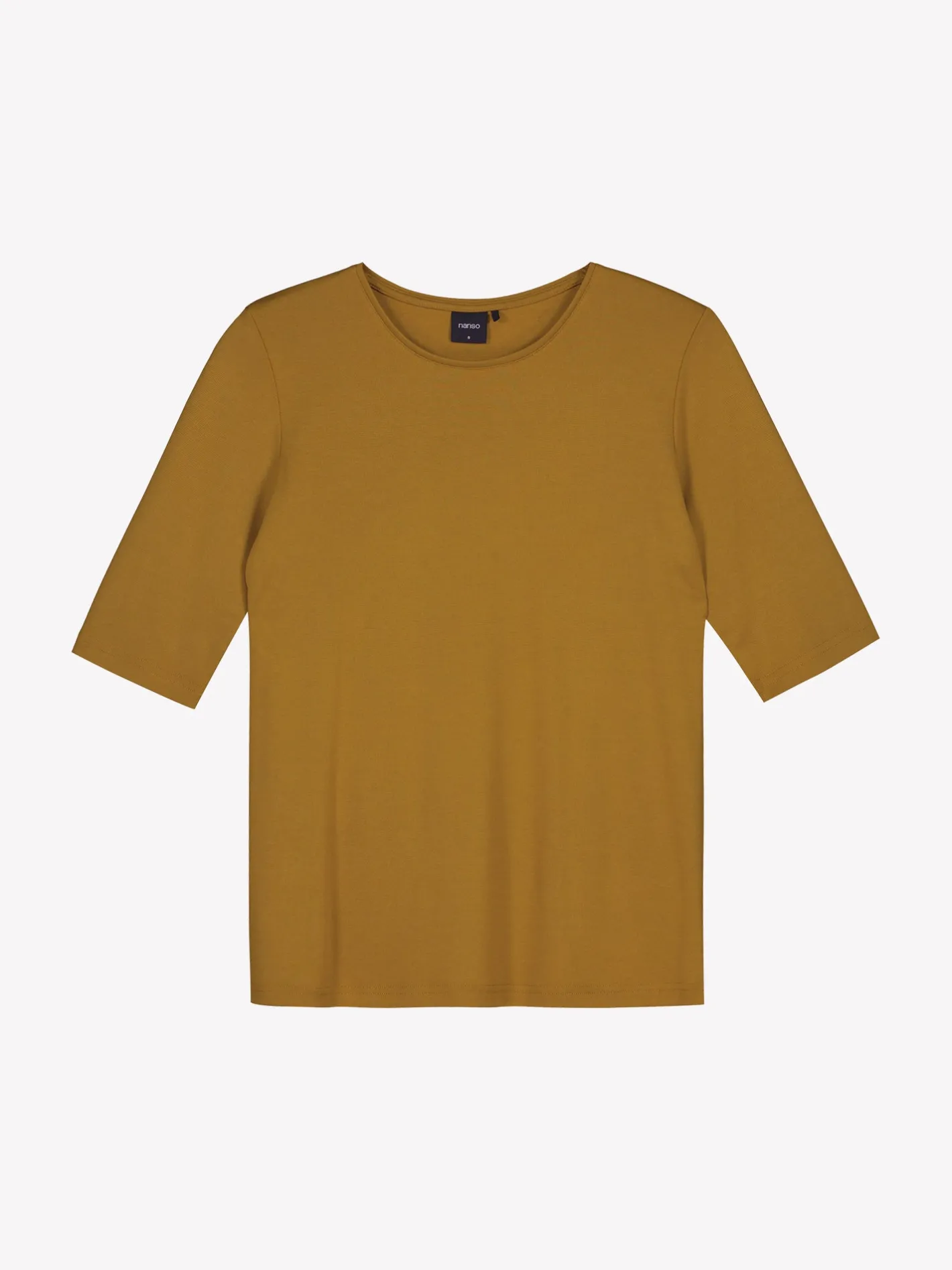 Naisten tyylikäs vaalea ruskea Aina T-paita. Klassinen t-paita on arjen monipuolinen luottovaate, johon on aina helppo pukeutua. Istuvassa T-paidassa on tereellä viimeistelty pyöreä pääntie. Hihat ovat 2/4 -mittaiset. T-paidan pituus koossa M on noin 62 cm. Materiaali on miellyttävän tuntuista, paksumpaa interlock-neulosta.