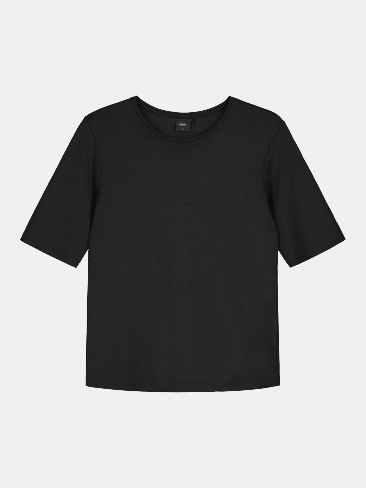 Naisten tyylikäs musta Aina T-paita. Klassinen t-paita on arjen monipuolinen luottovaate, johon on aina helppo pukeutua. Istuvassa T-paidassa on tereellä viimeistelty pyöreä pääntie. Hihat ovat 2/4 -mittaiset. T-paidan pituus koossa M on noin 62 cm. Materiaali on miellyttävän tuntuista, paksumpaa interlock-neulosta.