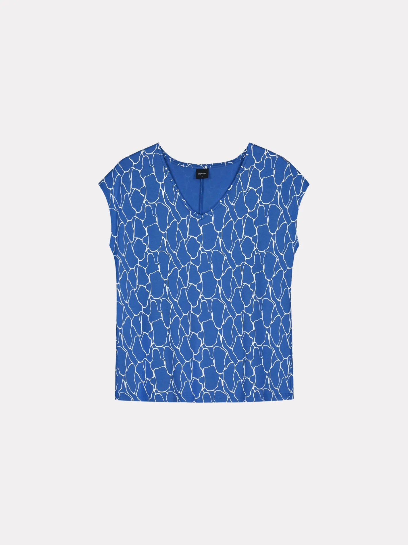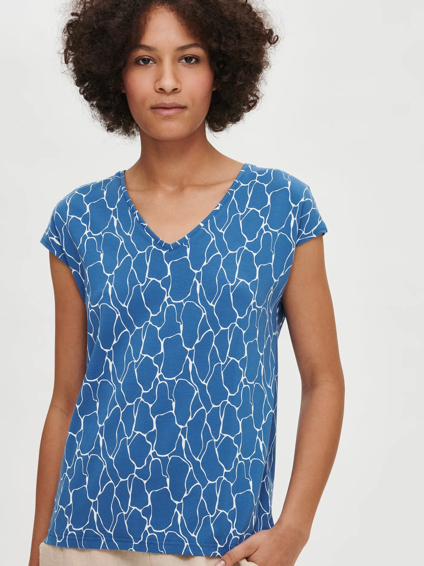 Naisten kuosillinen sininen Allas-pusero. Rento pusero sopii moniin eri asukokonaisuuksiin. Puserossa on tereellä viimeistelty v-pääntie ja holkkihihat. Puseron pituus koossa M on noin 65 cm. Materiaali on laadukasta ja helppohoitoista puuvilla-elastaani-neulosta, joka pysyy hyvänä pesusta toiseen.