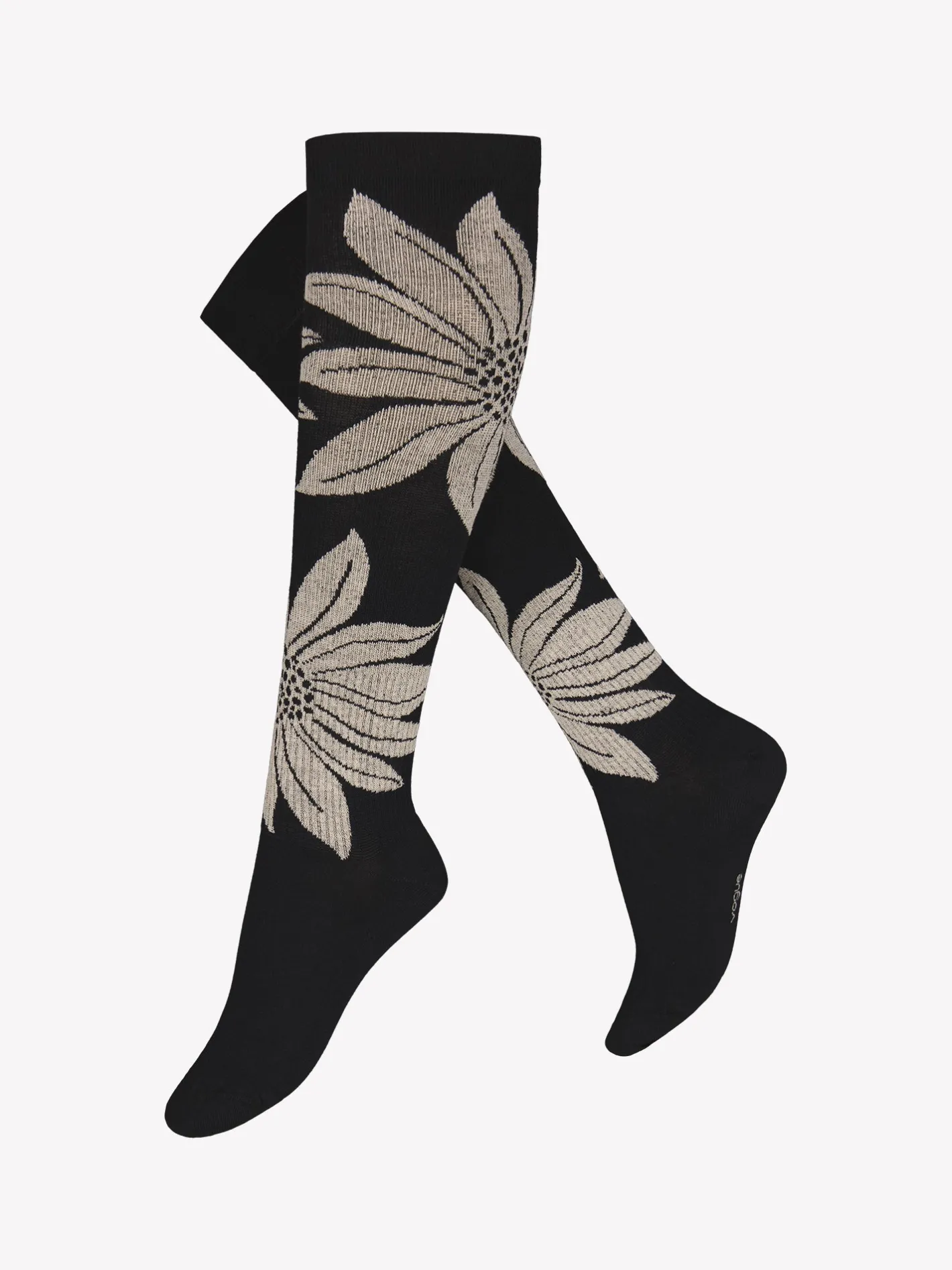 Voguen laadukkaat puuvillasta valmistetut tukisukat voimakkaalla tuella. Sukkien tarjoaman lisätuen myötä jalkasi pysyvät virkeinä ja tuntuvat kevyiltä päivän päätteeksi huolimatta päivän aikana suoritetuista aktiviteeteista. Polvisukkia koristavat beiget kukkakuviot.