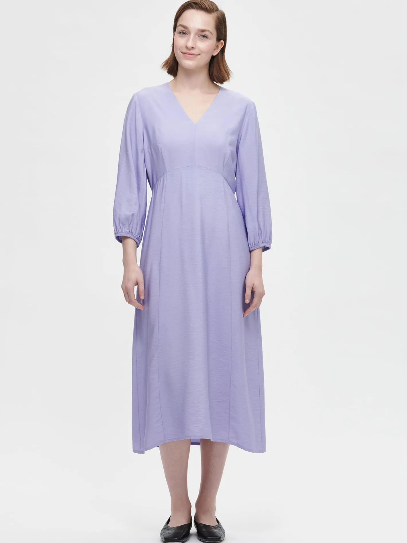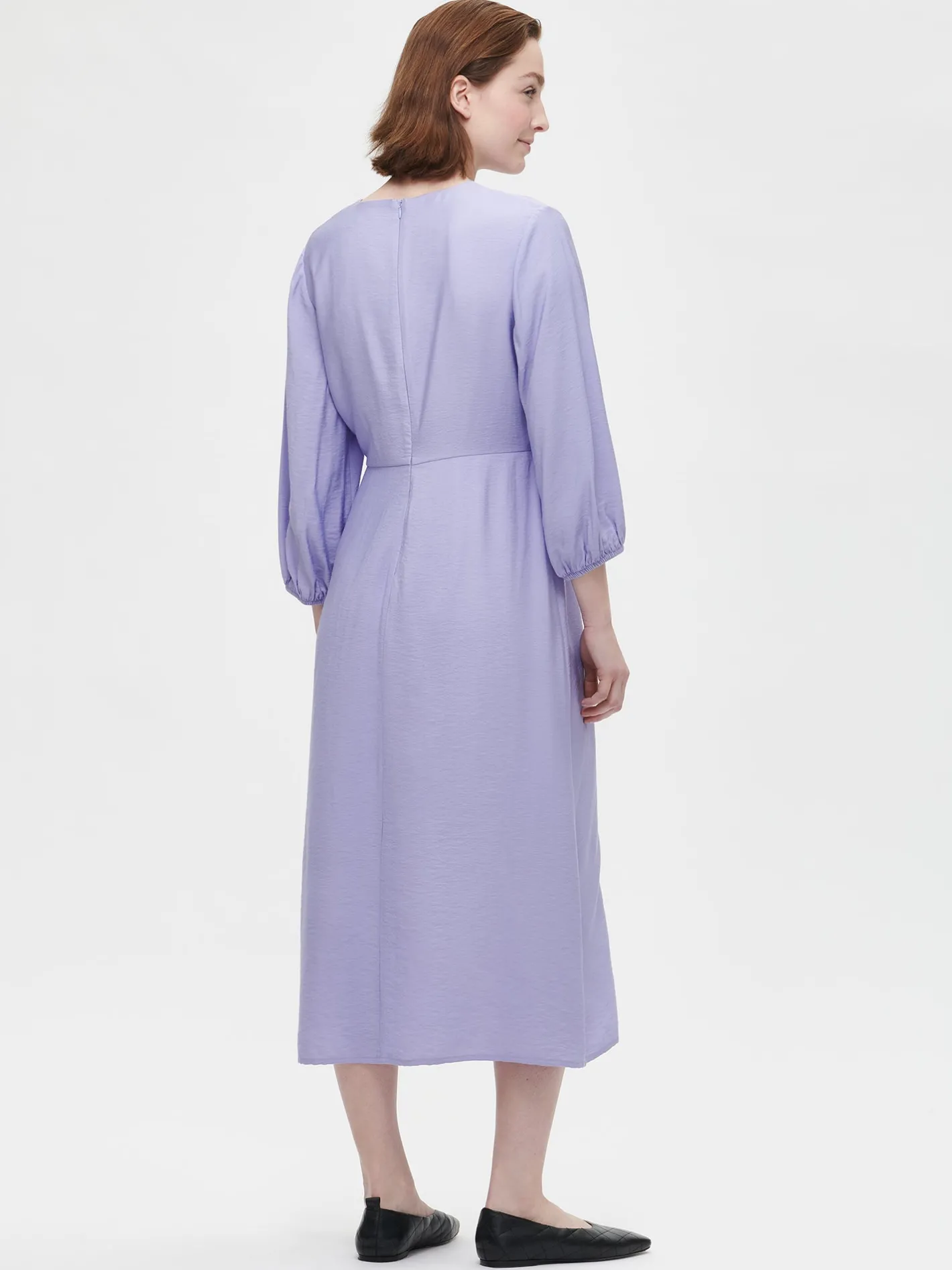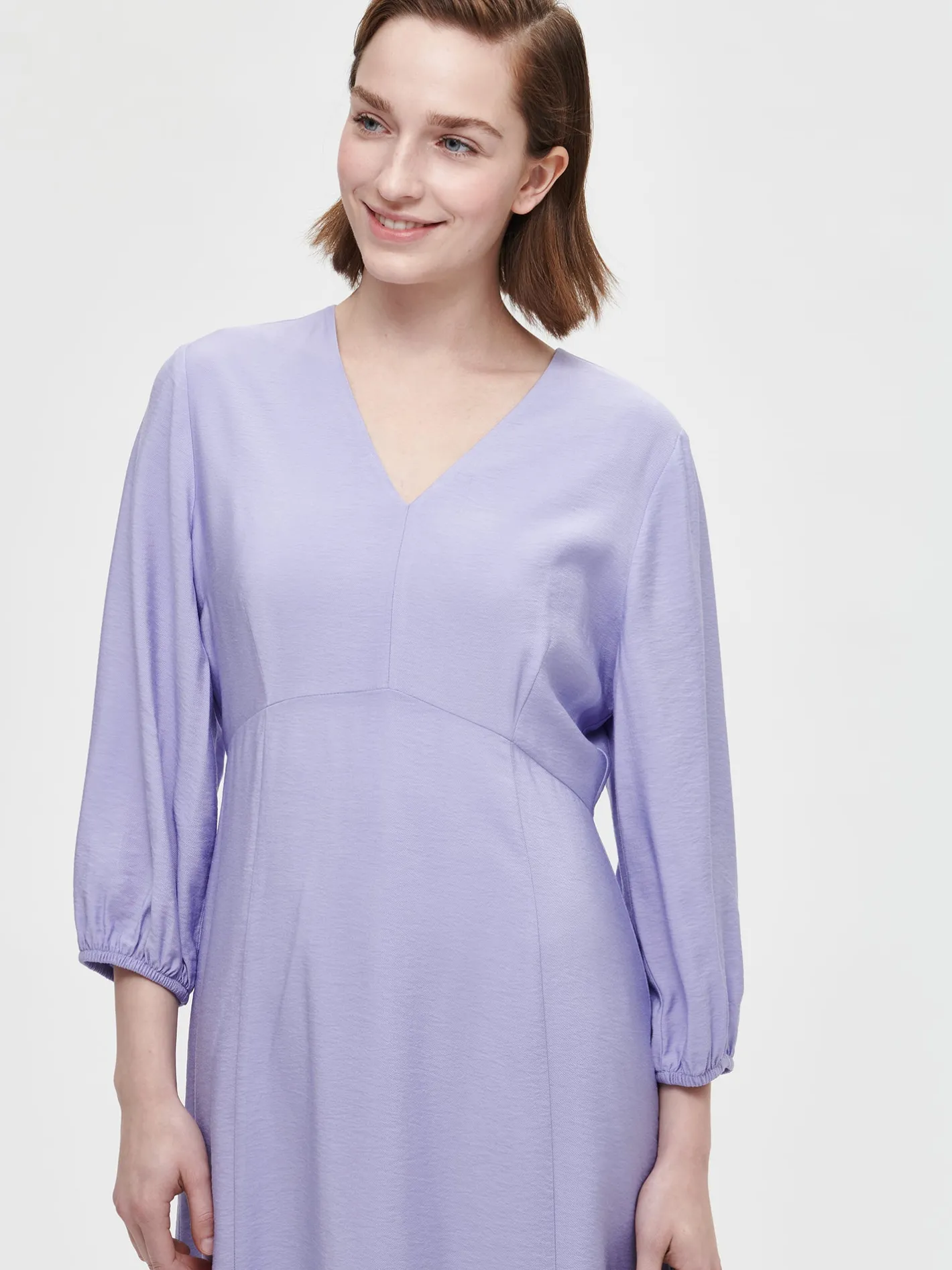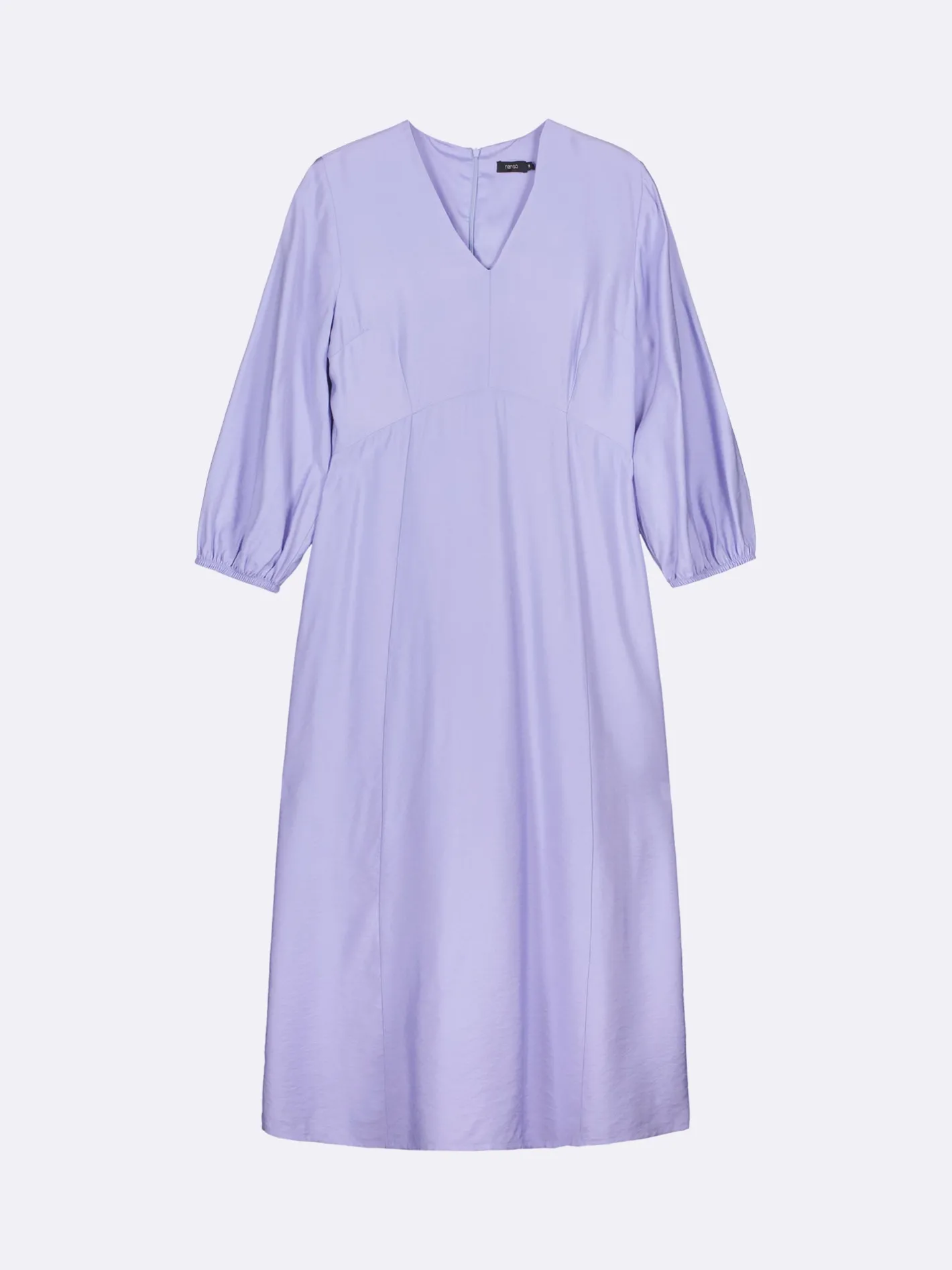 Naisten vaalea lila Antonia-mekko v-pääntiellä. Kauniisti laskeutuva ja istuva mekko on tyylikäs valinta arkeen tai juhlaan. Upeassa mekossa on V-pääntie ja takana piilovetoketju. Mekko on yläosasta istuva ja helma kellottuu kauniisti. 3/4-pituiset hihat poimuttuvat hihansuun kuminauhakäänteen yläpuolelle. Mekon pituus koossa 38 on noin 125 cm. Materiaali on kauniisti laskeutuvaa ja kevyttä viskoosi-polyamidi sekoitekangasta. Materiaalin viskoosi on LENZING™ ECOVERO™ -viskoosia. Materiaalille on ominaista 3-5% kutistuminen ensimmäisessä pesussa. Mekossa on polyesterivuori.