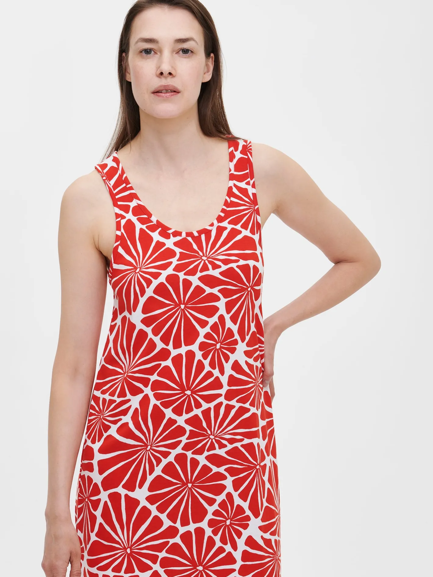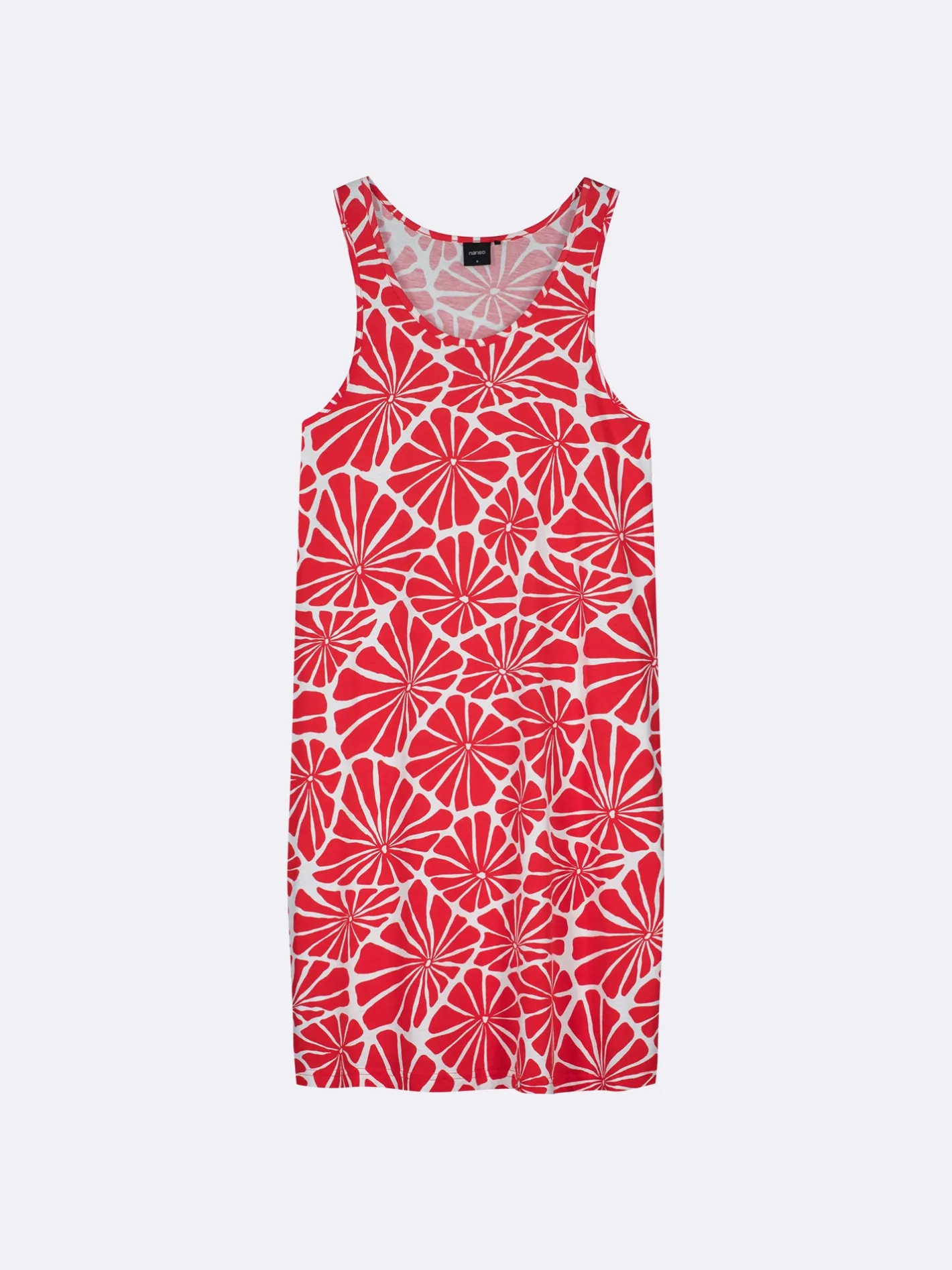 Naisten kuosillinen punainen Aralia-yöpaita pyöreällä pääntiellä. Hihattoman mekon pituus koossa M on noin 95 cm. Materiaali on laadukasta, iholla miellyttävän pehmeältä tuntuvaa ja helppohoitoista puuvilla-modaalia, joka pysyy hyvänä pesusta toiseen.