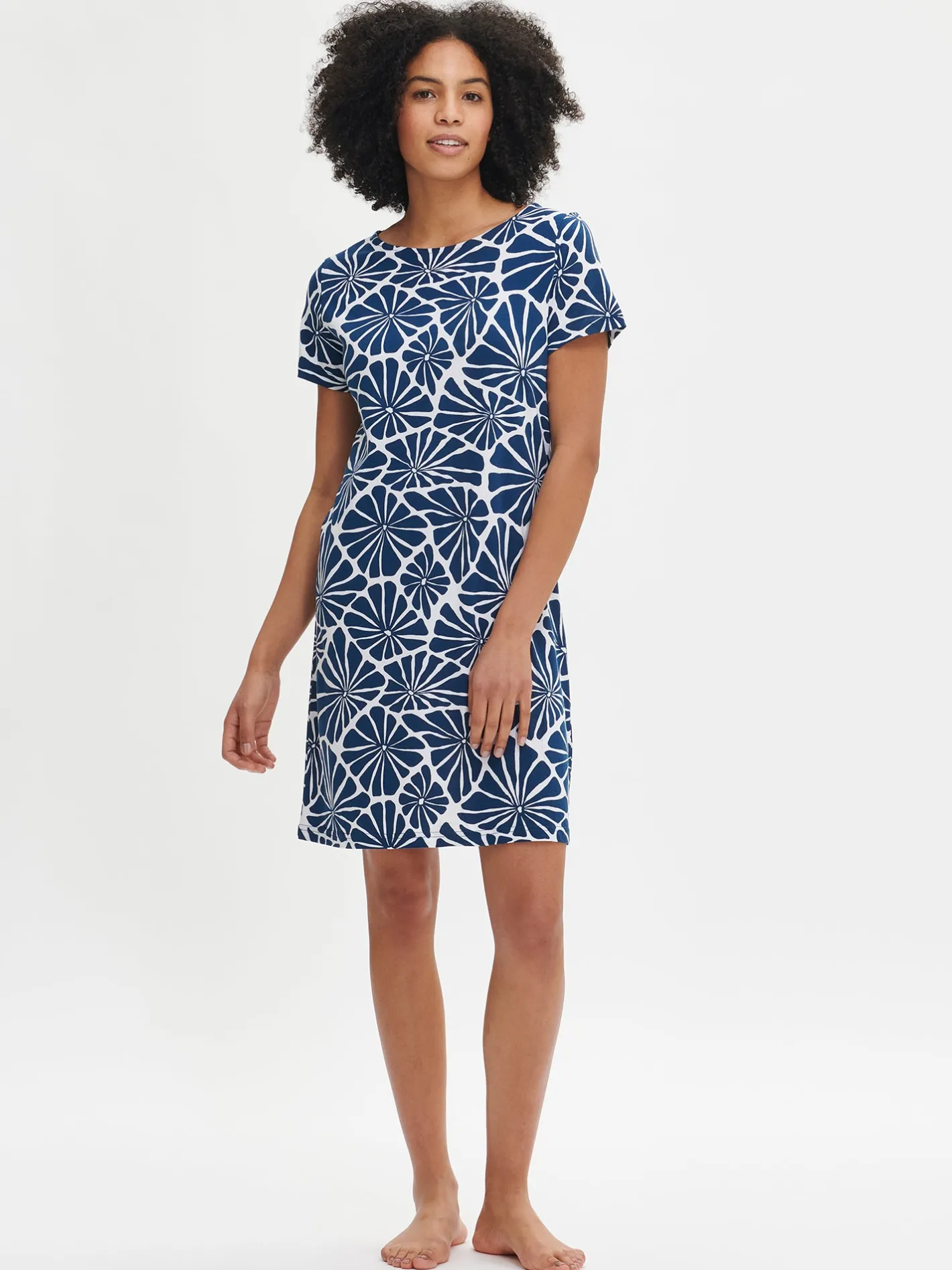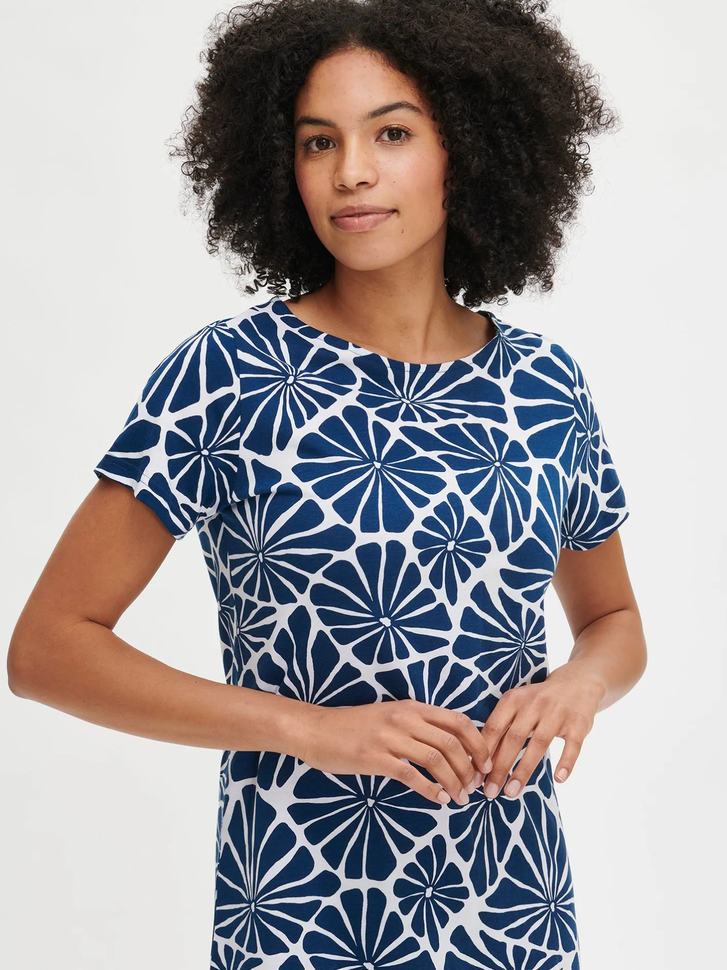 Naisten kuosillinen tummansininen Aralia-yöpaita lyhyillä hihoilla ja ovaalilla pääntiellä. Yöpaidan pituus koossa M on noin 95 cm. Materiaali on laadukasta, iholla miellyttävän pehmeältä tuntuvaa ja helppohoitoista puuvilla-modaalia, joka pysyy hyvänä pesusta toiseen.