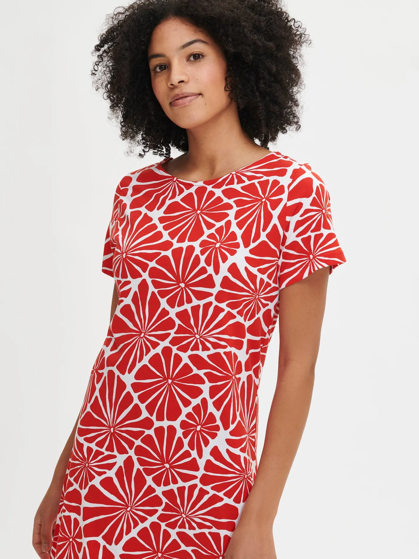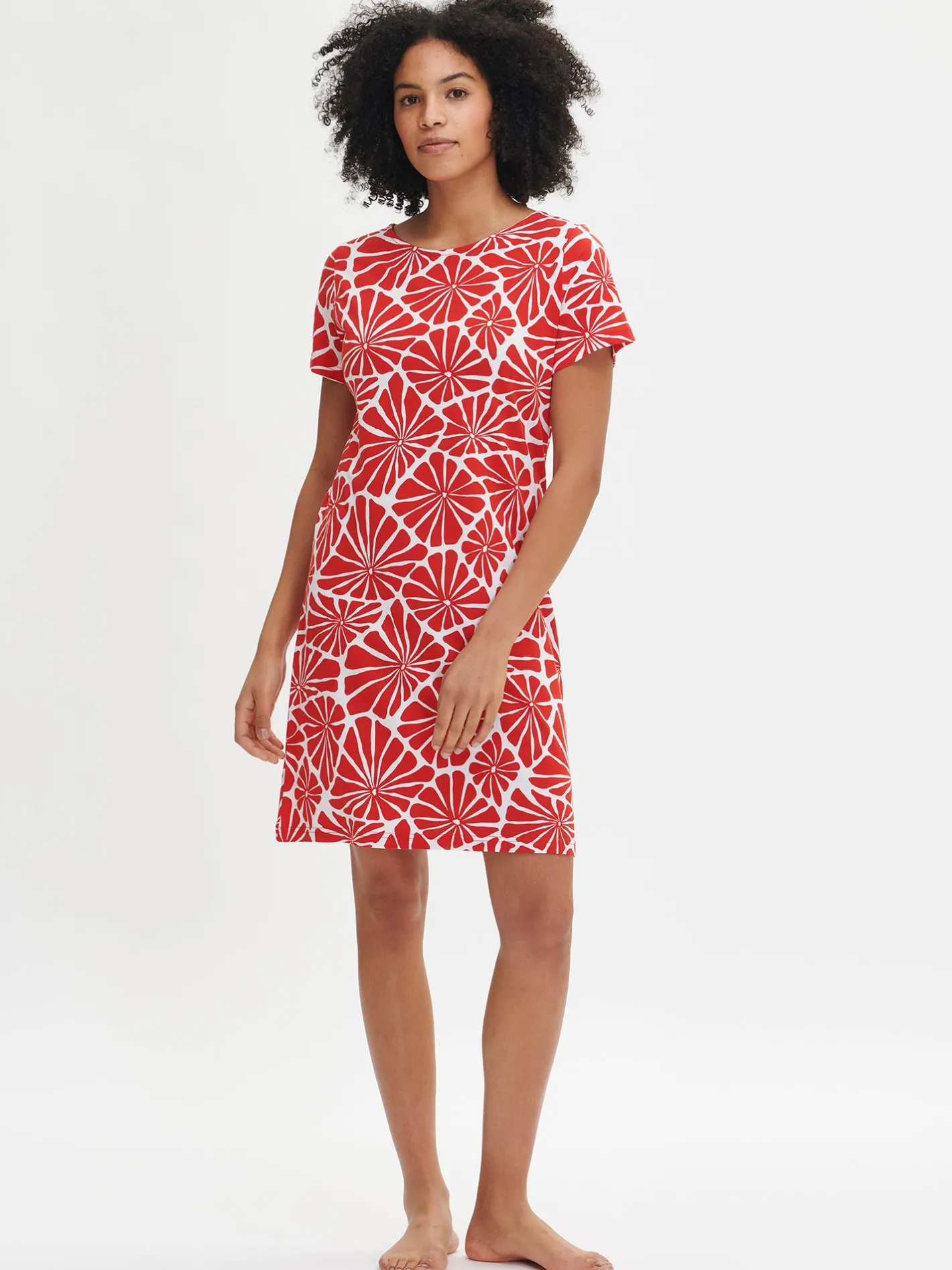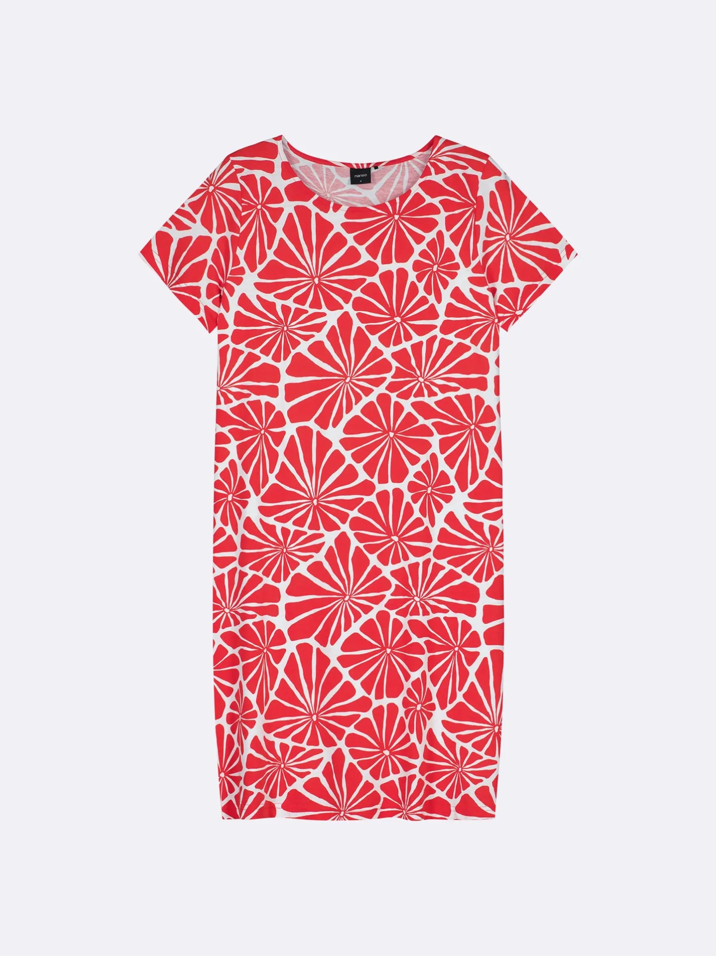 Naisten kuosillinen punainen Aralia-yöpaita lyhyillä hihoilla ja ovaalilla pääntiellä. Yöpaidan pituus koossa M on noin 95 cm. Materiaali on laadukasta, iholla miellyttävän pehmeältä tuntuvaa ja helppohoitoista puuvilla-modaalia, joka pysyy hyvänä pesusta toiseen.