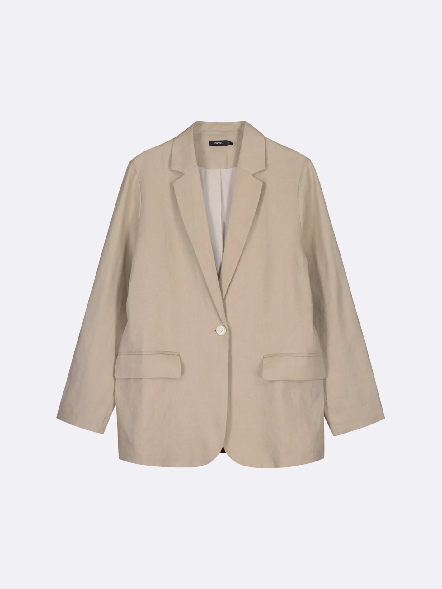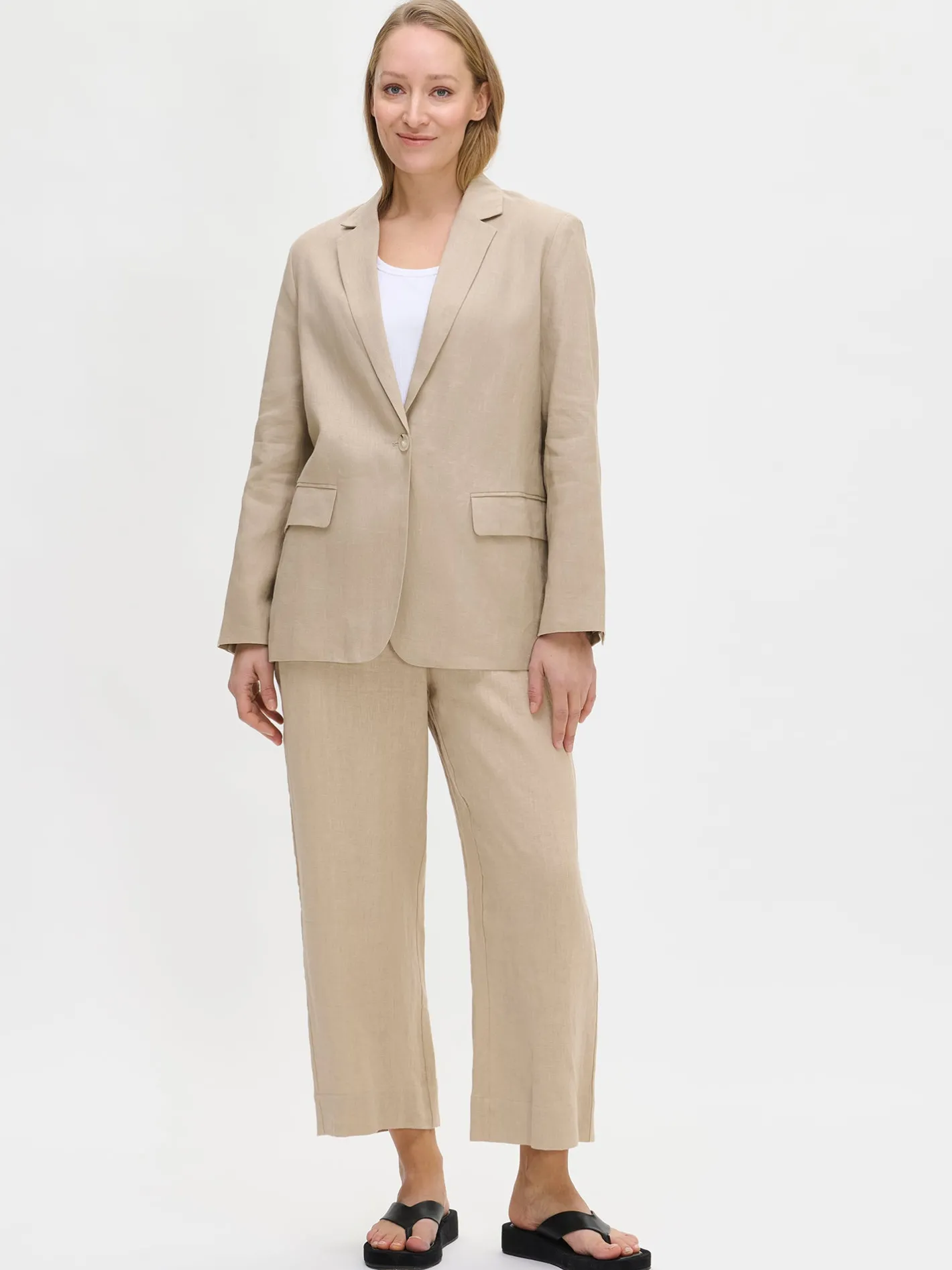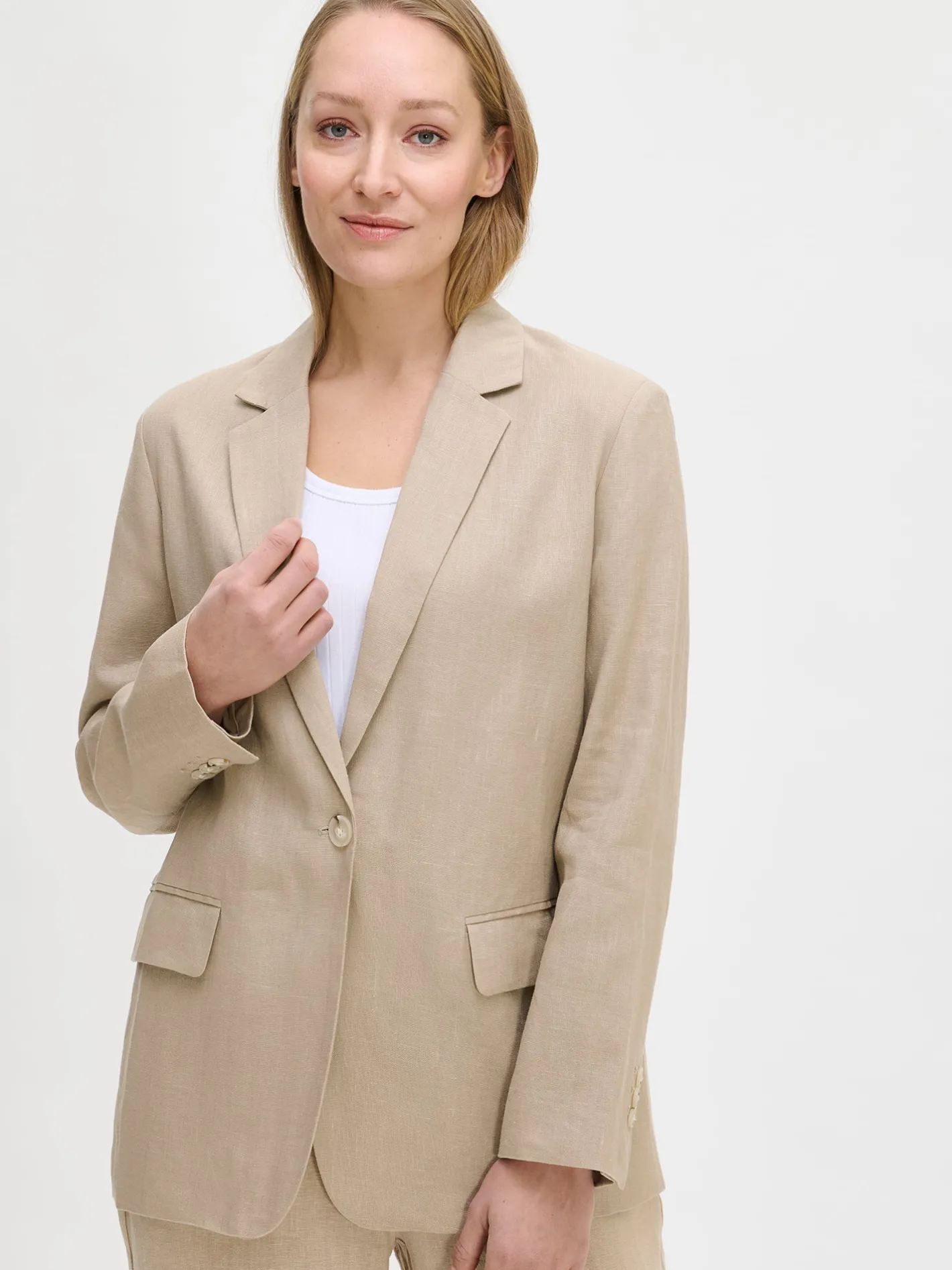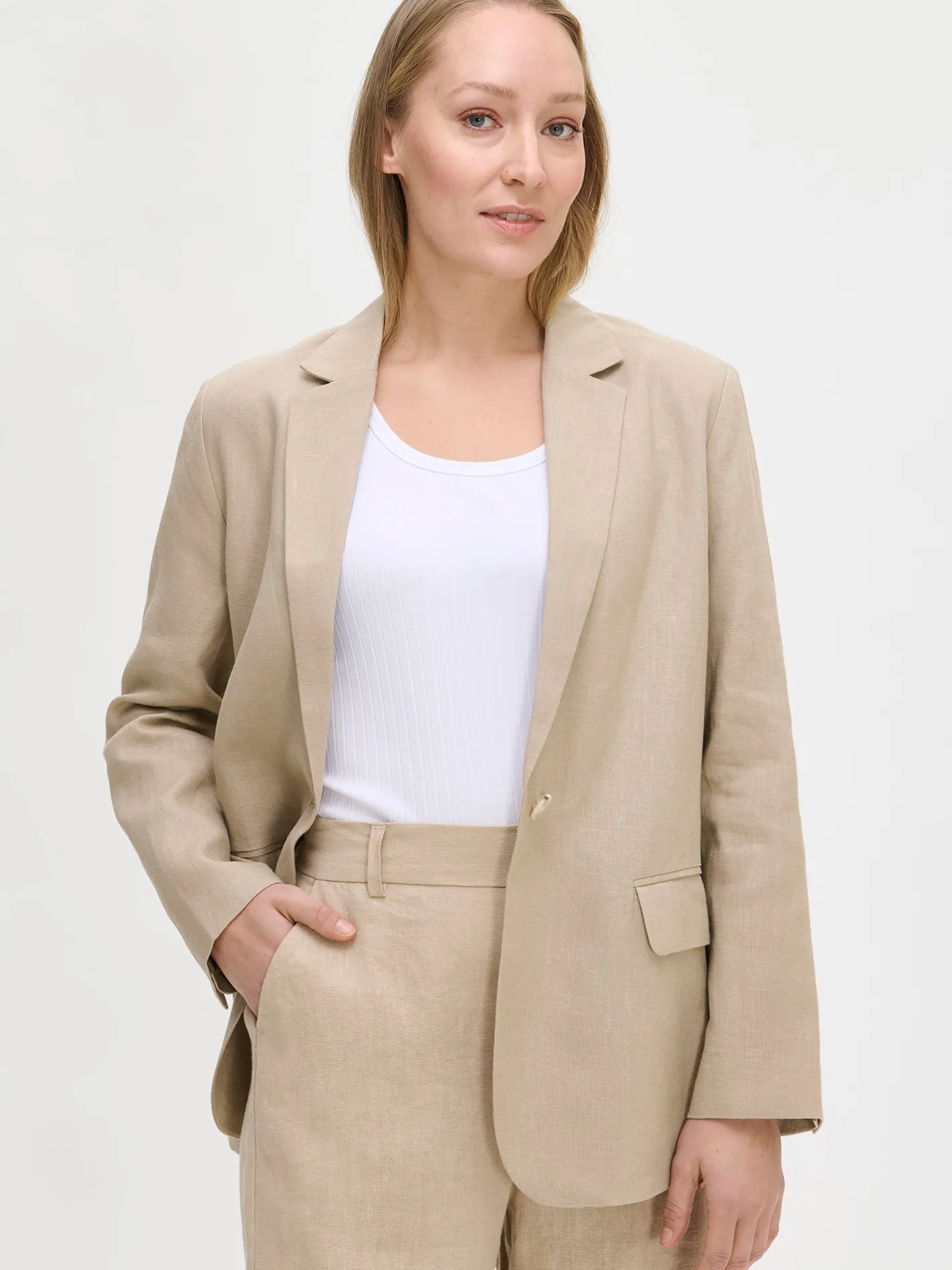 Naisten tyylikäs beige Arles-bleiseri pellavasta. Ajaton bleiseri on todellinen vaatekaapin kulmakivi, sillä se sopii vaivattomasti eri asuihin ja eri tilanteisiin. Siisti pellavajakku on aina muodissa ja siihen on ihana pukeutua koko vuoden ympäri. Yksivärisessä Arles-bleiserissä on kaulukset, kiinnitys yhdellä napilla ja rintamuotolaskokset. Vuoritetussa bleiserissä on edessä läppä taskut ja takana halkio. Täyspitkissä hihoissa on kolme nappia hihansuissa. Jakun pituus koossa M on noin 75 cm. Päällimateriaali on pellavakangasta ja vuori puuvillaa.