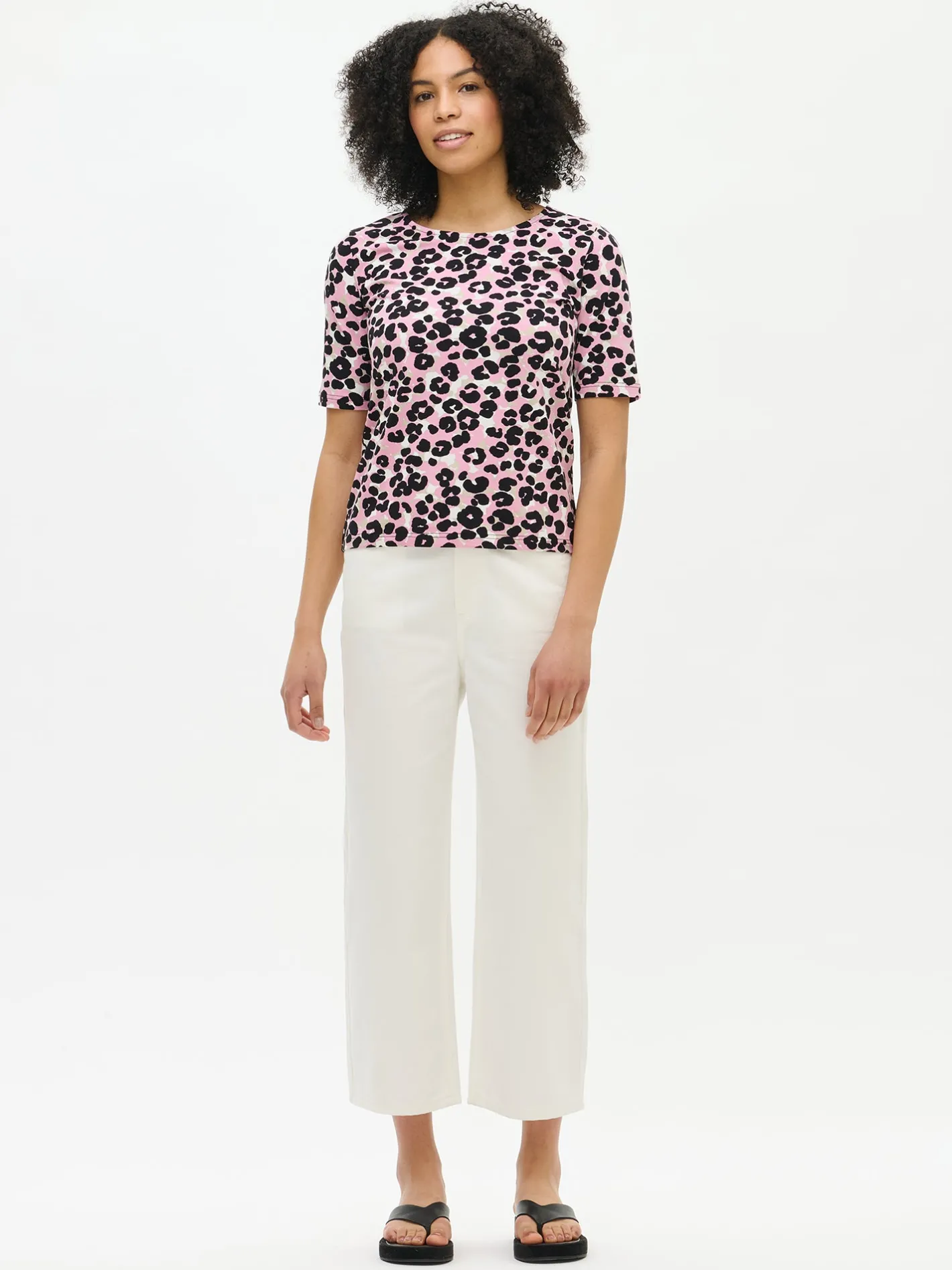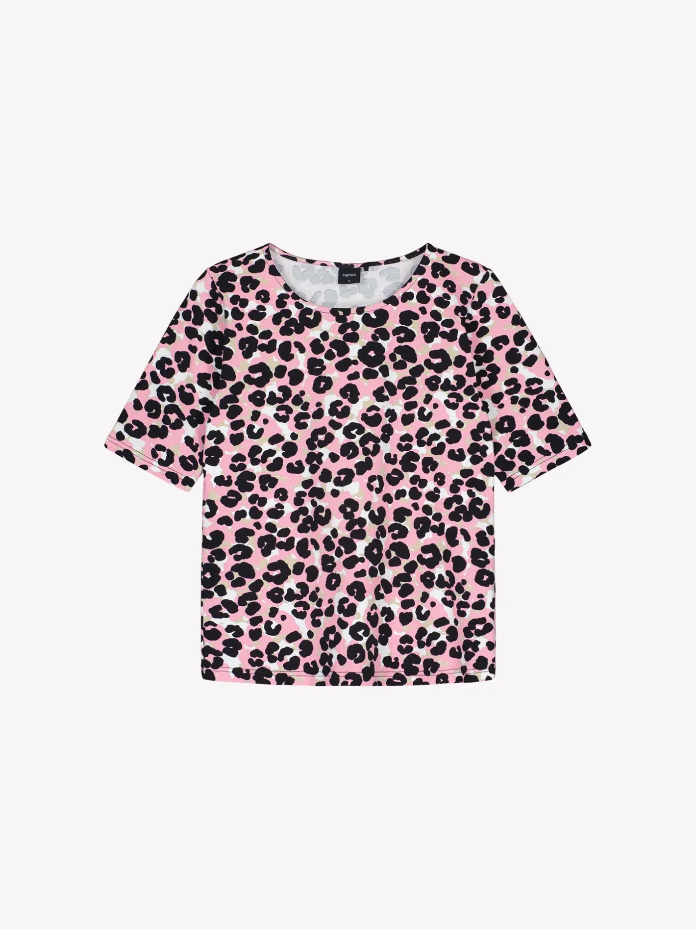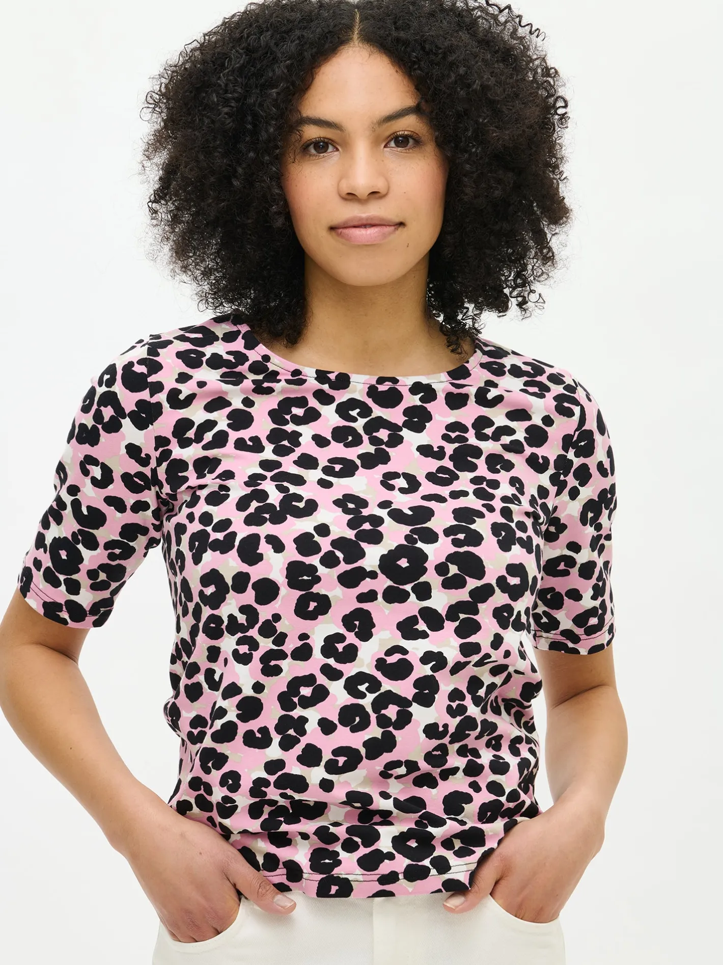 Naisten kuosillinen vaaleanpunainen Babette-pusero. T-paidassa on kantilla viimeistelty pyöreä pääntie. Puserossa on 2/4 pituiset hihat ja helma on suora. Puseron pituus koossa M on noin 64 cm. Materiaali on miellyttävää ja joustavaa puuvilla-elastaani-neulosta.