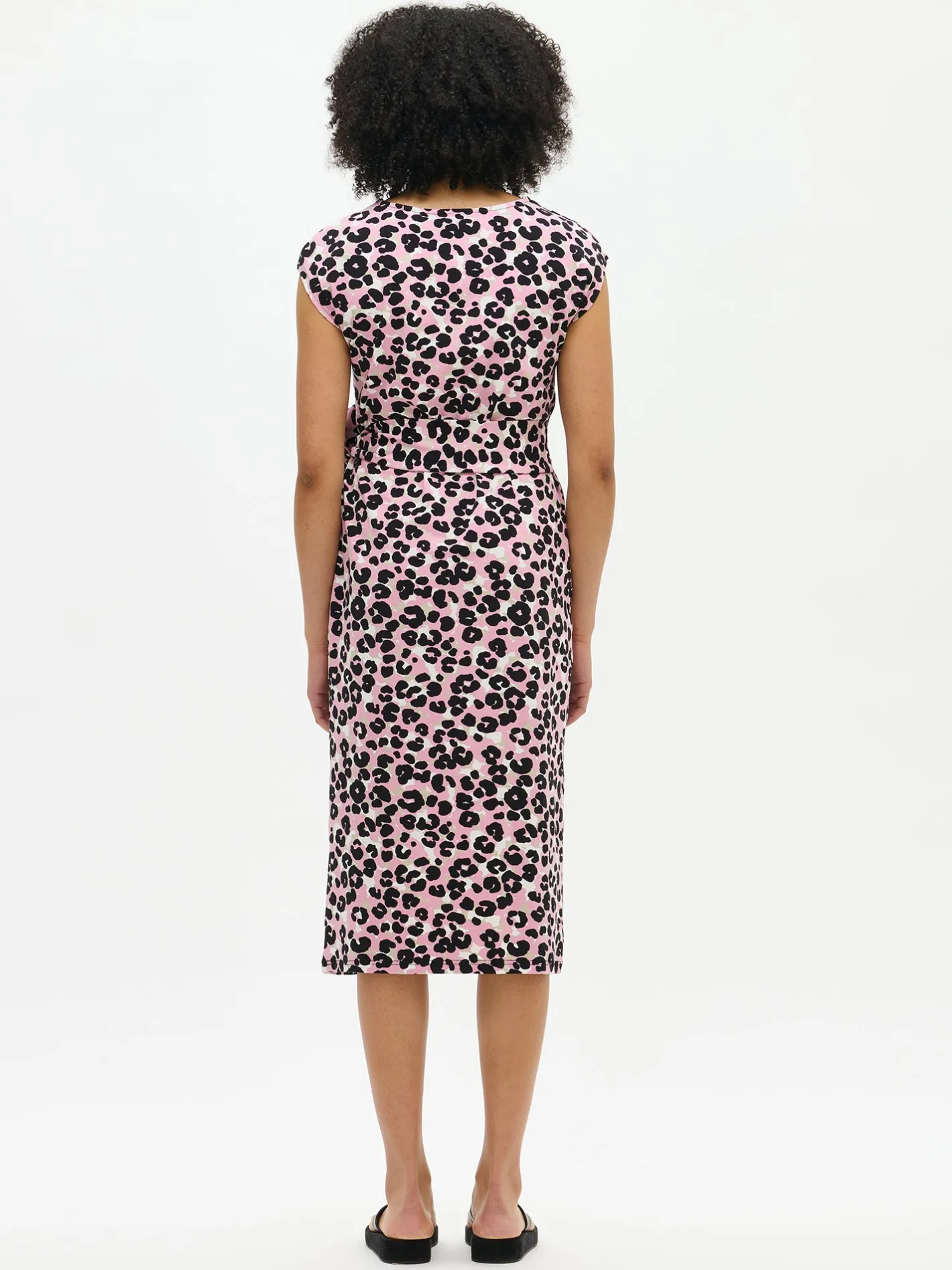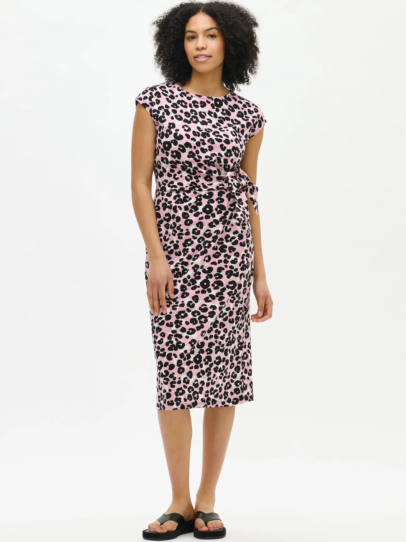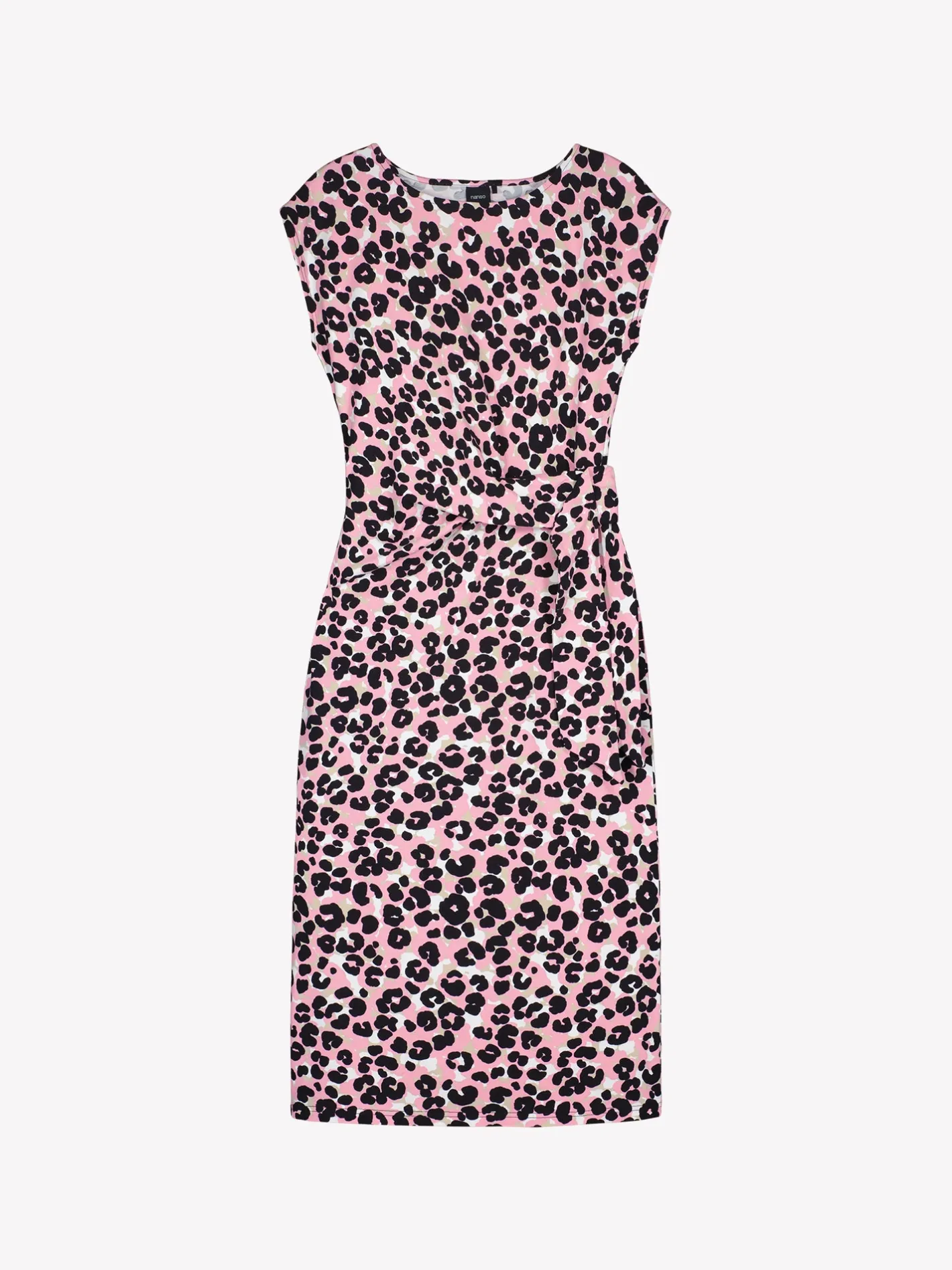 Naisten vaaleanpunainen Babette-mekko leopardikuviolla. Mekossa on kantilla viimeistelty venepääntie ja holkkihihat. Suoralinjaisessa mekossa on kauniina yksityiskohtana vyötärölle muotoa tuova nauhoilla solmittava solmuke. Mekon pituus koossa M on noin 120 cm. Materiaali on laadukasta ja helppohoitoista puuvilla-elastaani-neulosta, joka pysyy hyvänä pesusta toiseen.