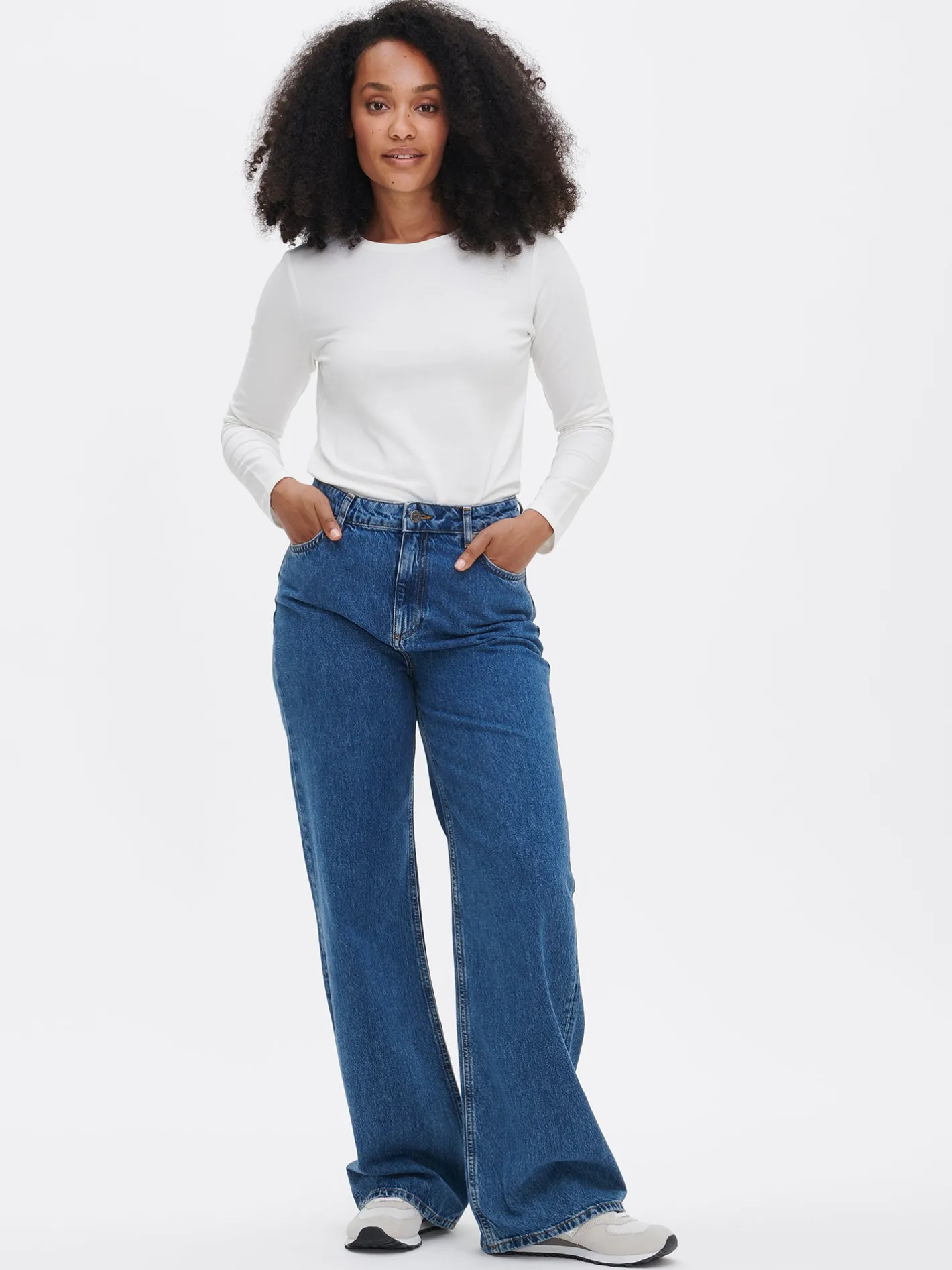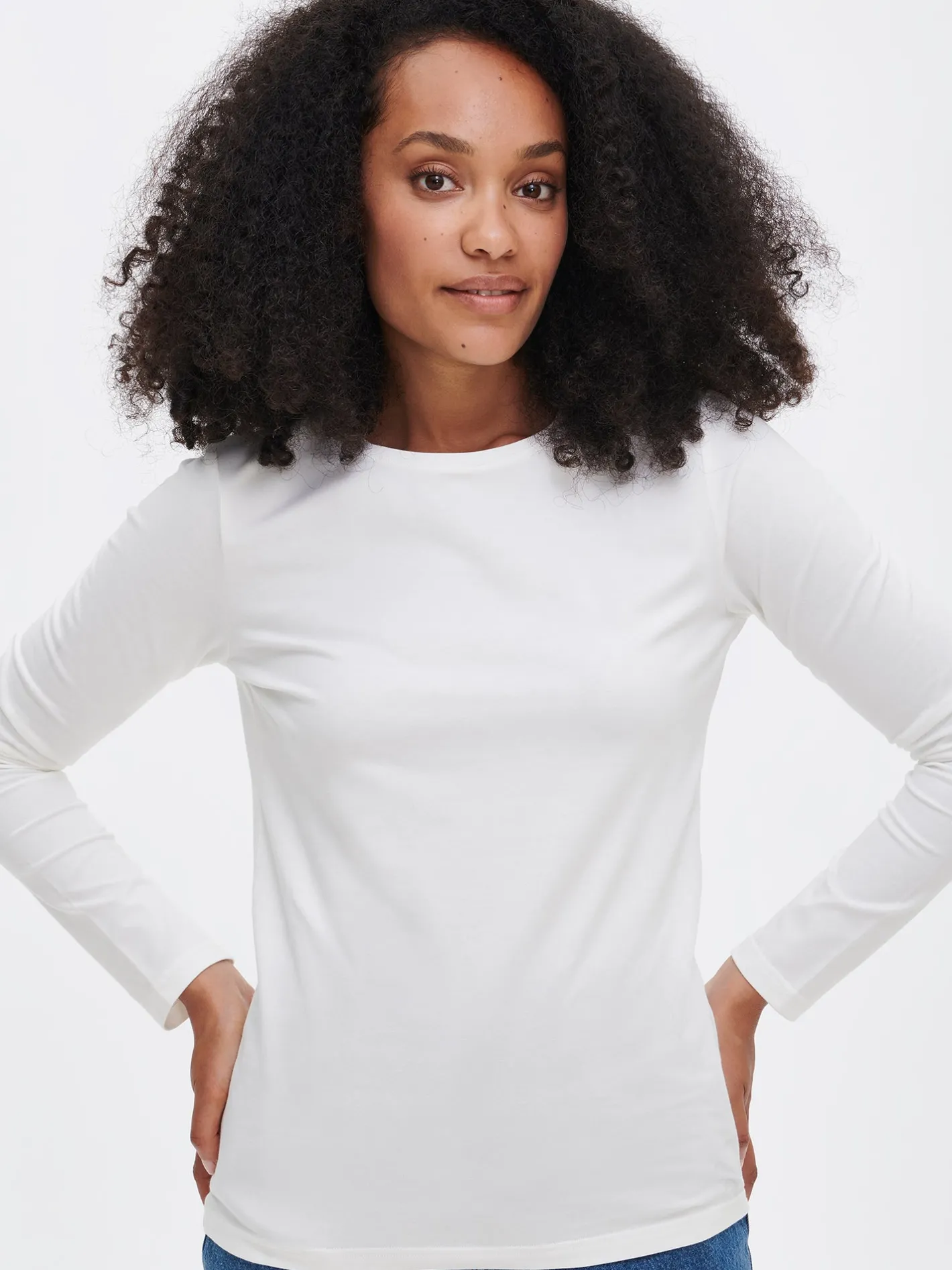 Naisten klassinen, luonnonvalkoinen pitkähihainen Basic-pusero pyöreällä pääntiellä. Yksivärinen pitkähihainen pusero on monikäyttöinen arjessa – yhdistä se mukavien housujen pariksi tai kerrosta neuleen tai lyhythihaisen paidan alle. Puseron pituus koossa M on noin 65 cm. Materiaali on miellyttävää ja joustavaa luomupuuvilla-elastaani-neulosta.