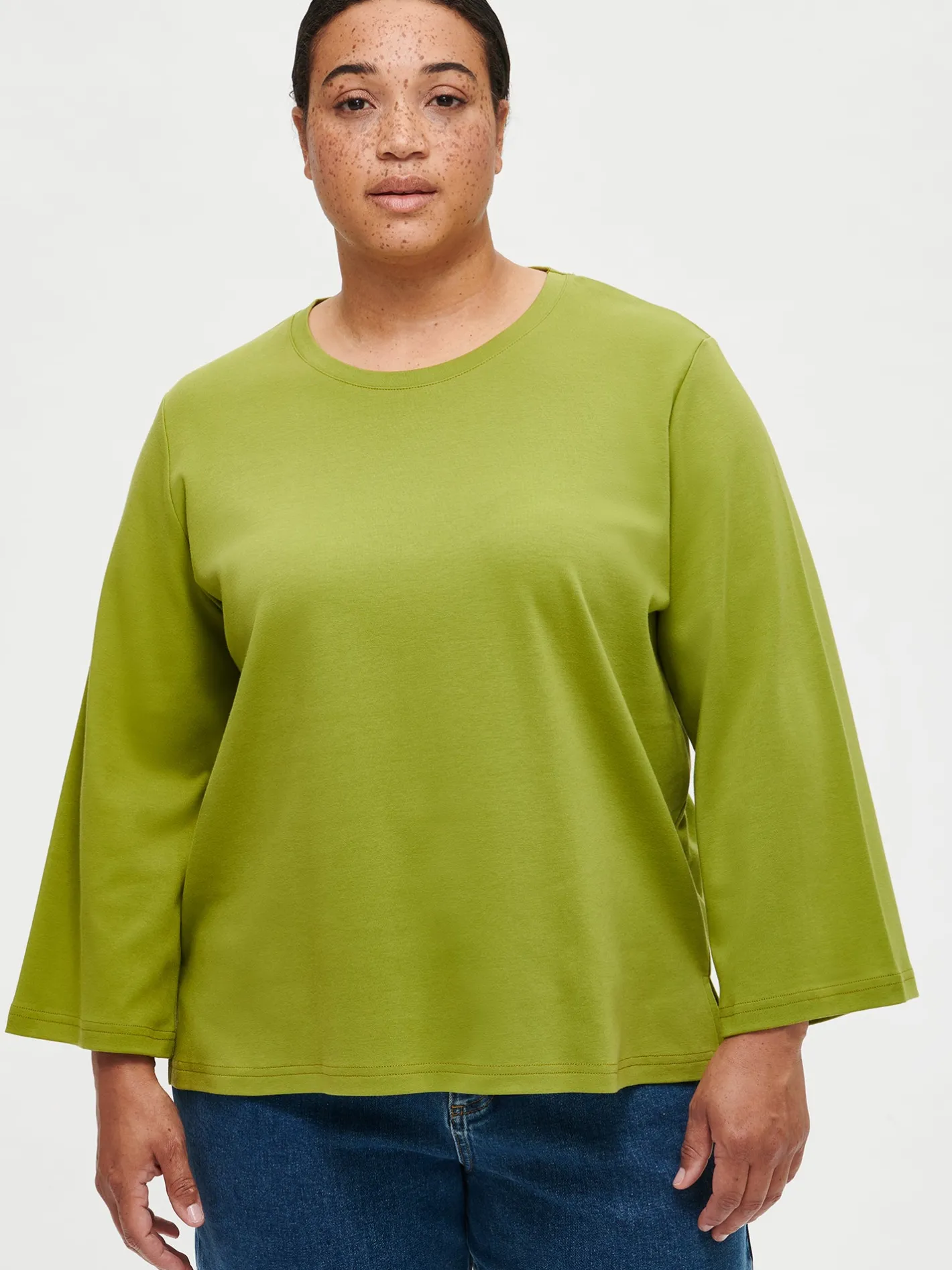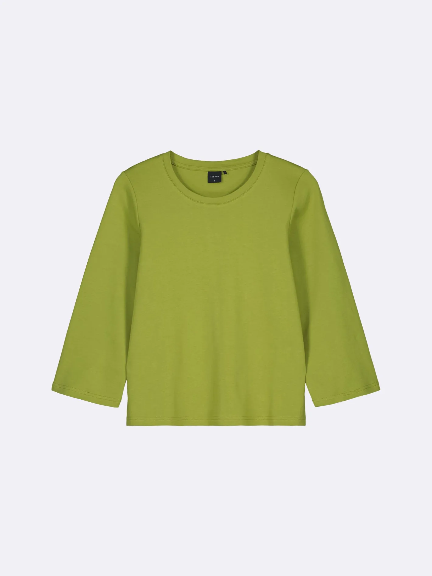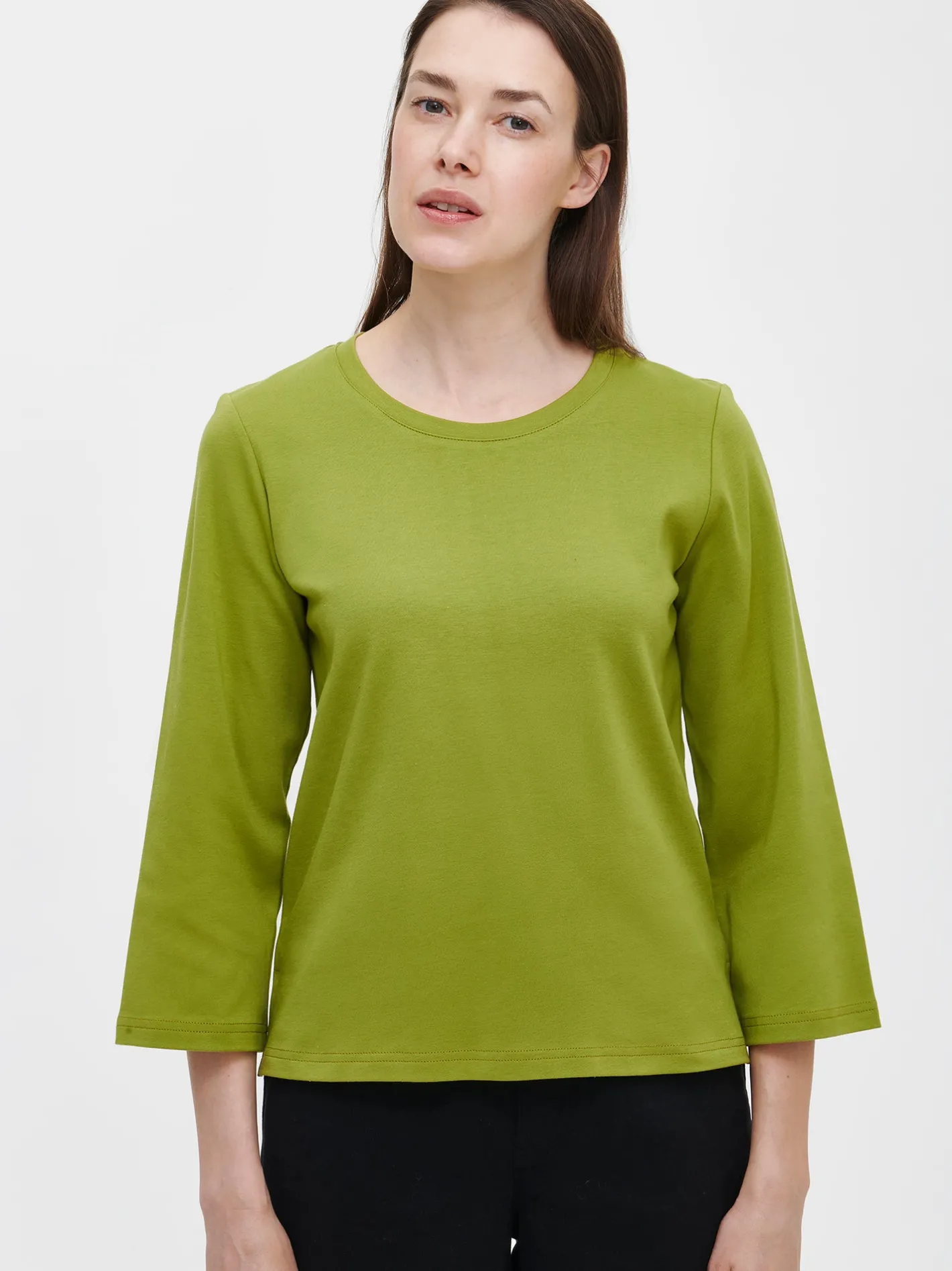 Naisten yksivärinen vihreä Blokki-pusero. Puserossa on sivuilla pienet halkiot ja leveällä tereellä viimeistelty pyöreä pääntie ja 3/4 pituiset hihat. Puseron pituus koossa M on noin 60 cm. Materiaali on 100 % puuvillaa, jämäkämpää interlock-neulosta.