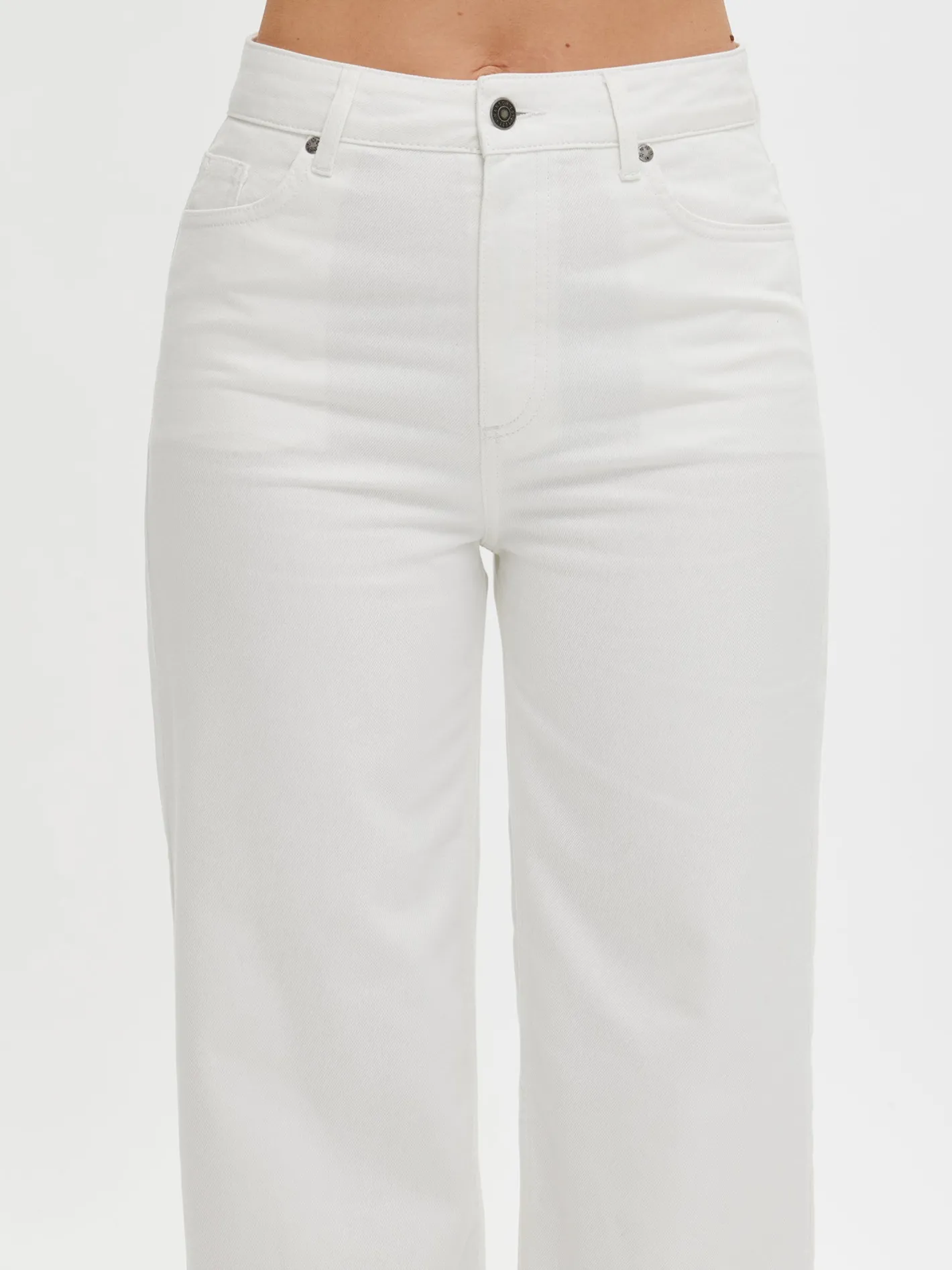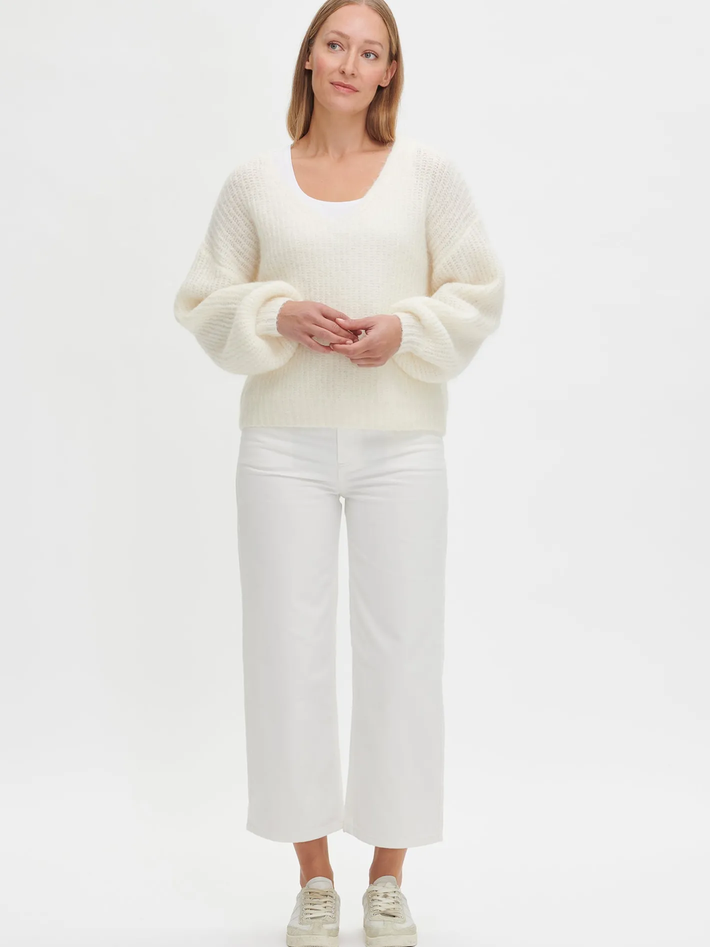 Naisten trendikkäät luonnonvalkoiset Cropped Levee-farkut, joissa on normaalikorkuinen vyötärö. Trendikkäästi vajaamittaiset Levee-farkut ovat helppo ja tyylikäs valinta arkeen. Farkuissa on vyötärökaitale, edessä vetoketju ja nappikiinnitys. Rennoissa farkuissa on taskut edessä ja takana sekä levenevät, vajaamittaiset lahkeet. Lahkeen sisäpituus koossa 38 on noin 65 cm. Materiaali on kudottua twillsidoksista puuvilla-denimkangasta. 20% kankaaseen käytetystä puuvillasta on kierrätettyä.