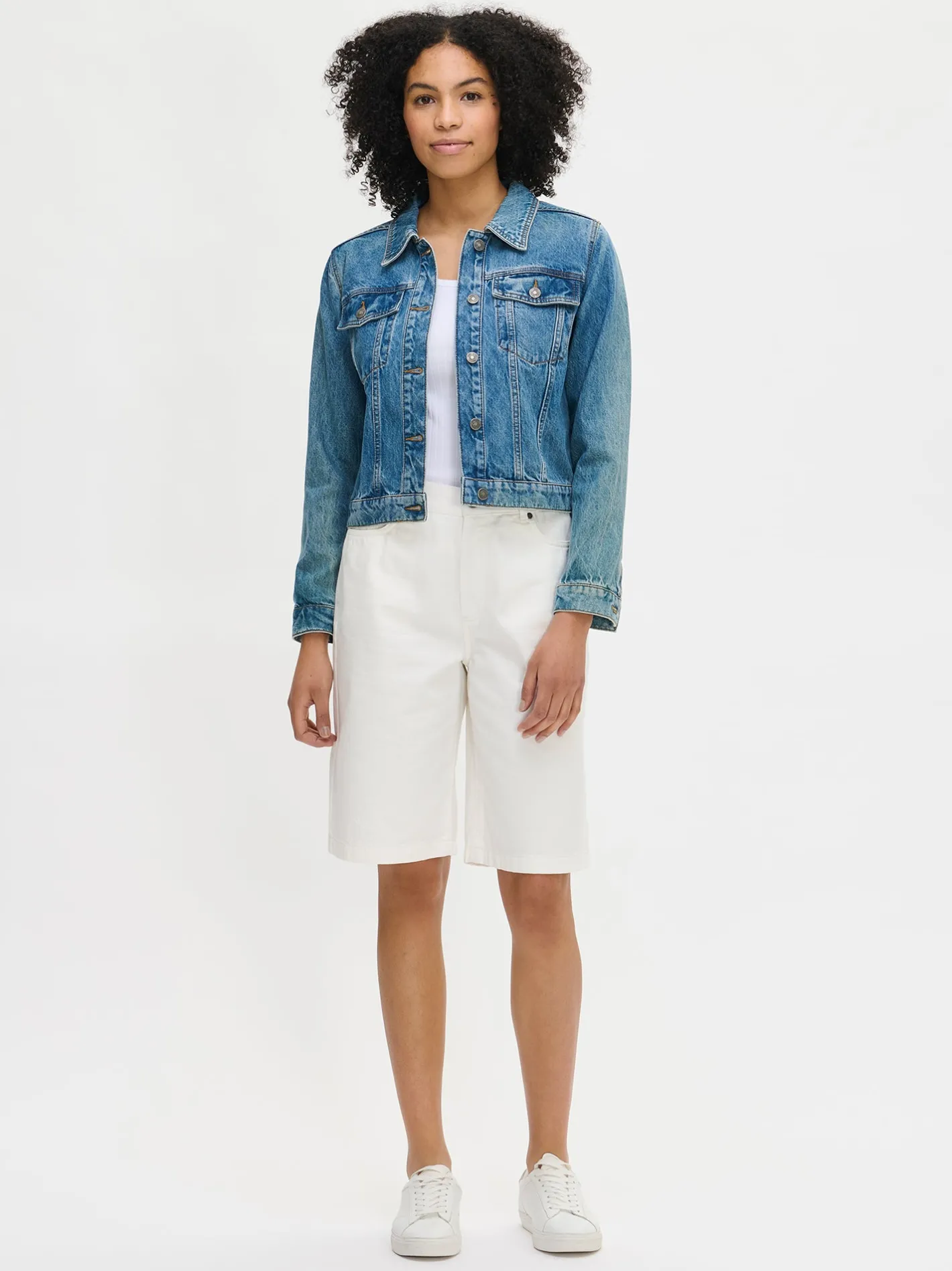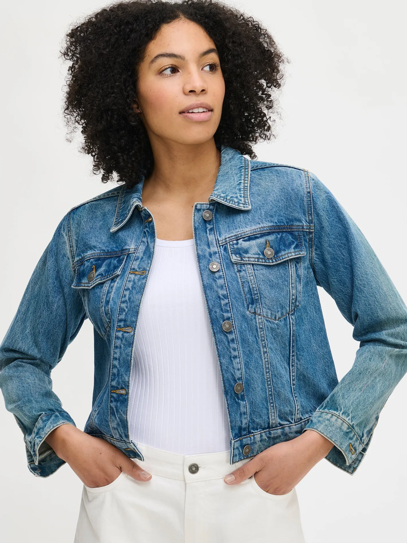 Naisten klassisen sininen Denim- farkkutakki. Rento ja tyylikäs farkkutakki on aina muodissa. Farkkutakki ihastuttaa monikäyttöisyydellään, sillä se sopii jokaiseen asuun. Ajattomassa Denim-farkkutakissa on klassiset yksityiskohdat: kaulus ja nappikiinnitys. Takissa on läpälliset rintataskut ja helmassa sivuilla säätömahdollisuus kahdella napilla. Hihat ovat täyspitkät ja hihansuissa on kalvosin napit. Farkkutakin pituus koossa 38 on noin 53 cm. Twill-sidoksisen puuvillakankaan materiaalista 20 % on kierrätettyä puuvillaa.
