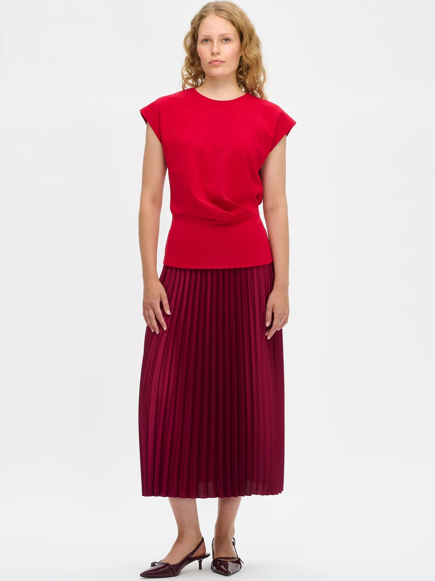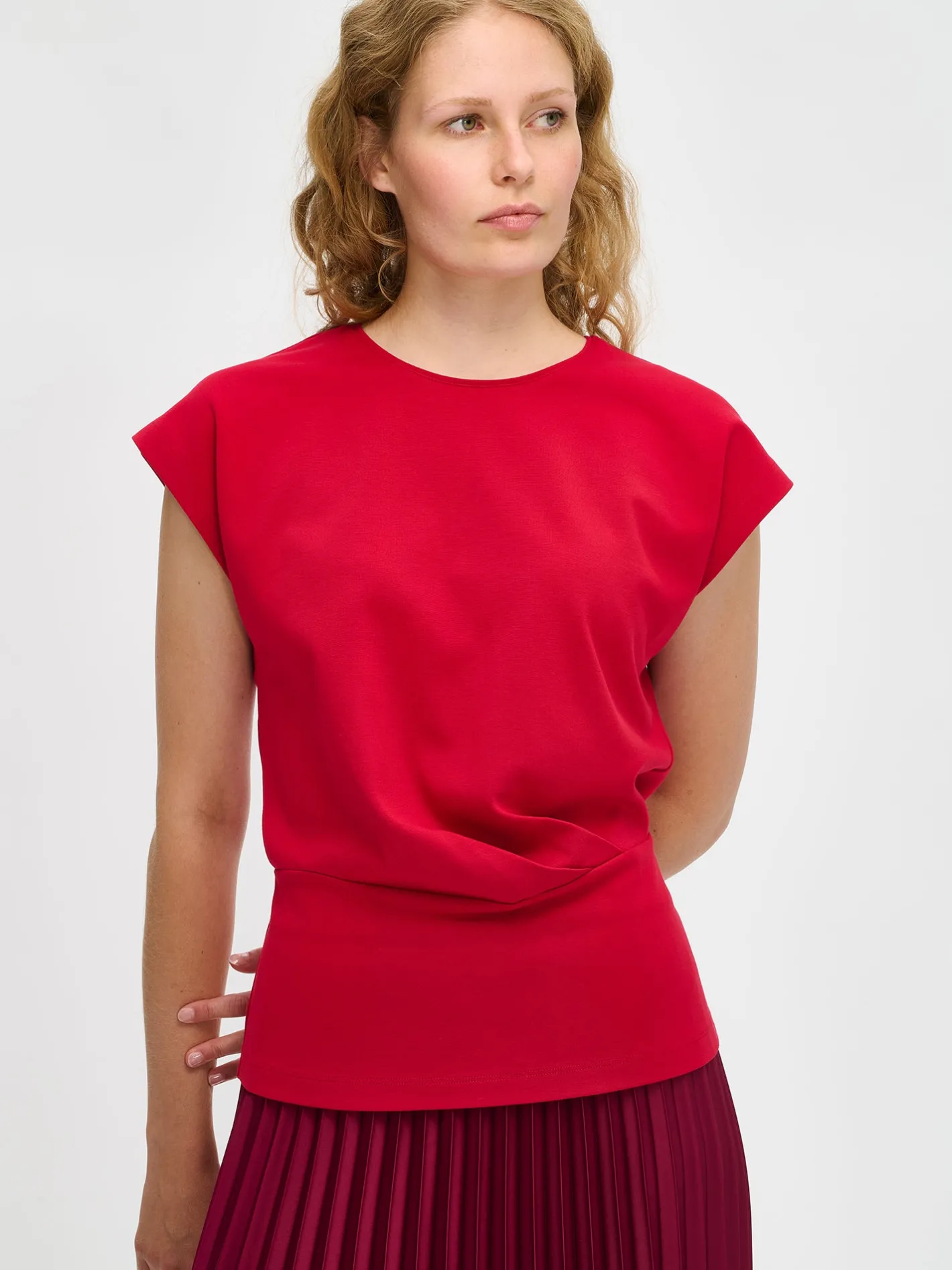 Naisten ajaton punainen Elegia-paita. Elegia-pusero on tyylikäs valinta arkeen ja juhlaan – yhdistä se vaikkapa kauniiseen Taite-hameeseen tai klassisiin suoriin housuihin. Paidassa on pyöreä pääntie, holkkihihat ja edessä vyötäröllä laskokset. Paidan pituus koossa M on noin 62 cm. Materiaali on miellyttävän tuntuista interlock-neulosta.