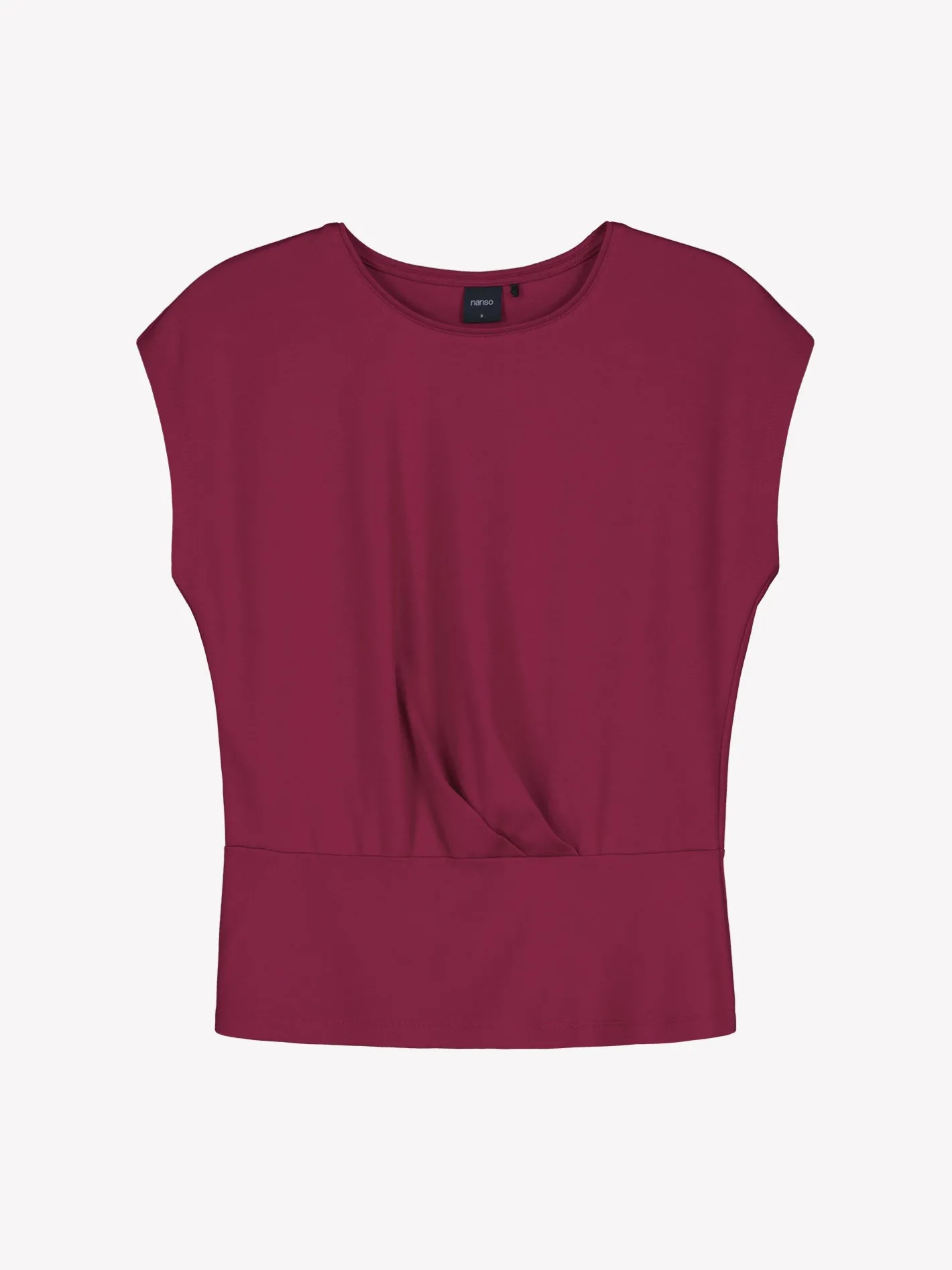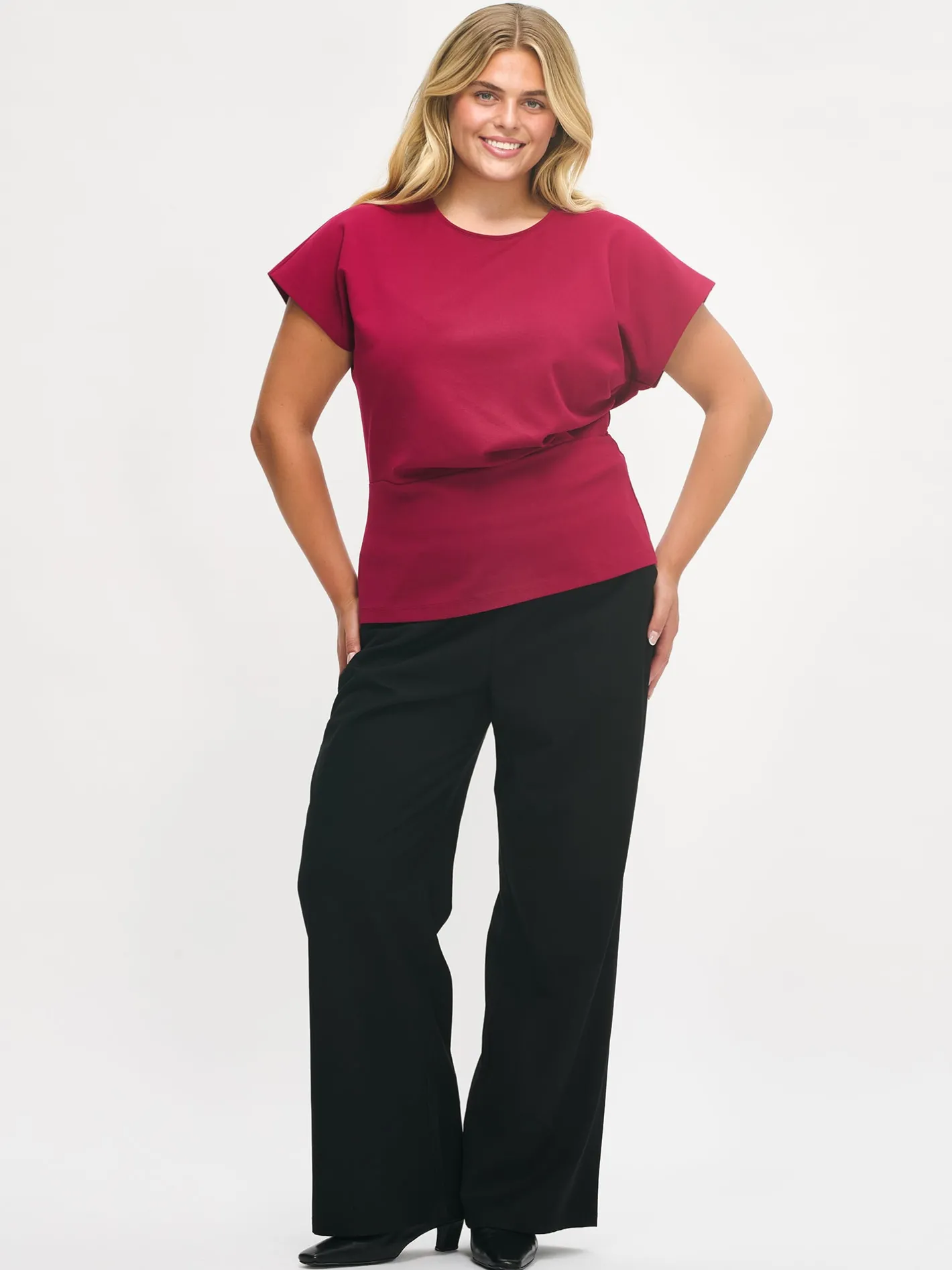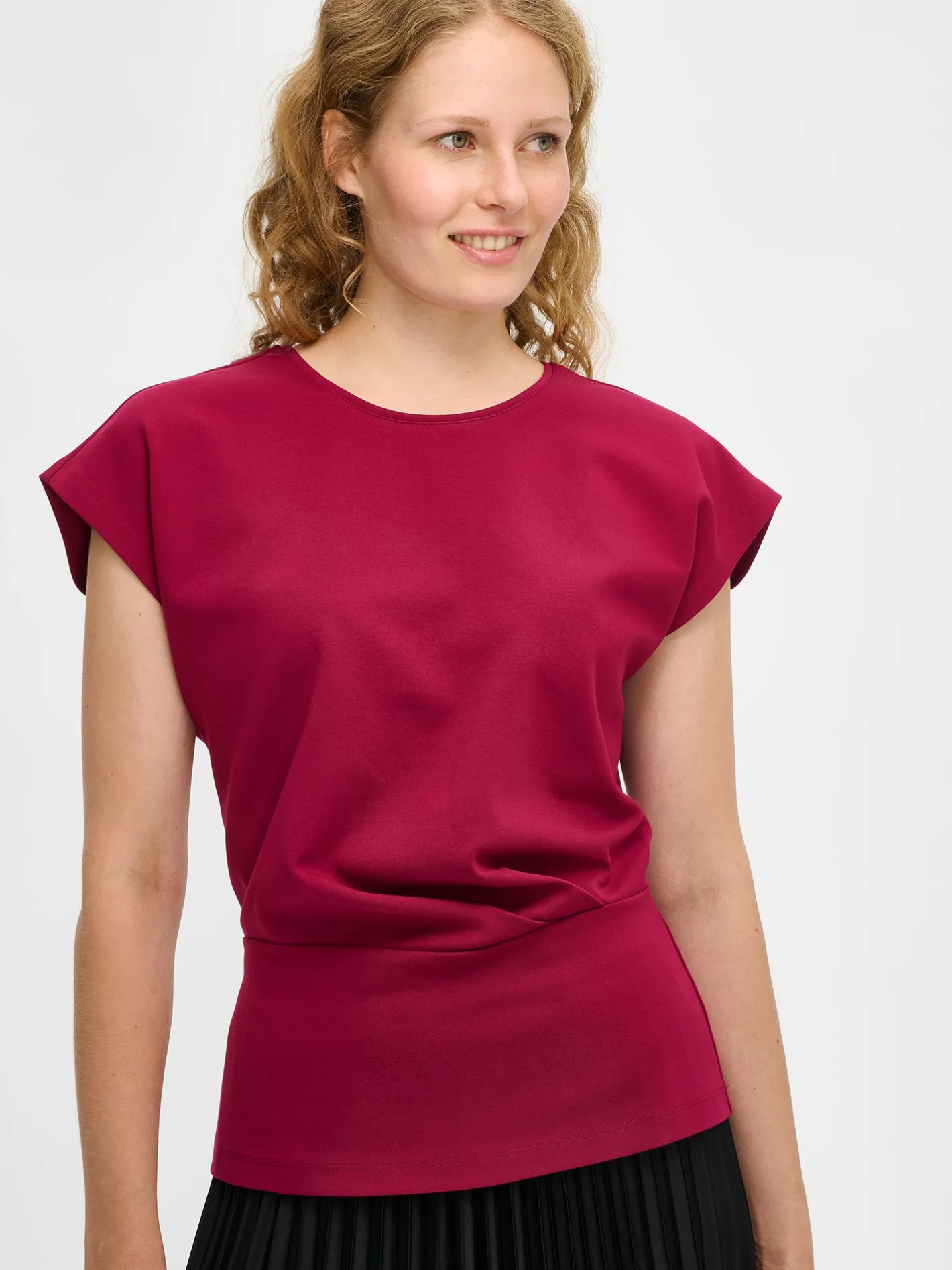 Naisten ajaton viininpunainen Elegia-paita. Elegia-pusero on tyylikäs valinta arkeen ja juhlaan – yhdistä se vaikkapa kauniiseen Taite-hameeseen tai klassisiin suoriin housuihin. Paidassa on pyöreä pääntie, holkkihihat ja edessä vyötäröllä laskokset. Paidan pituus koossa M on noin 62 cm. Materiaali on miellyttävän tuntuista interlock-neulosta.