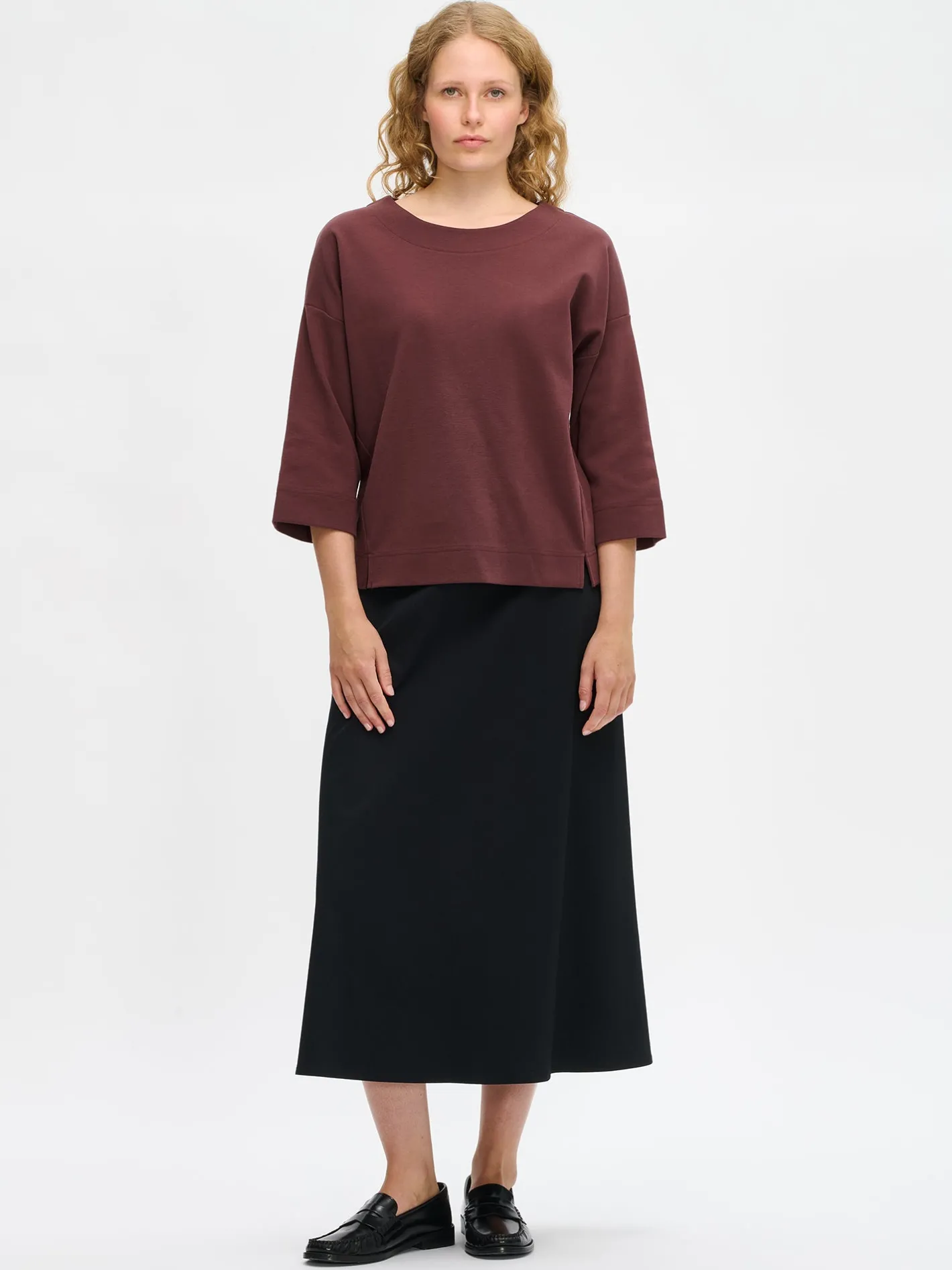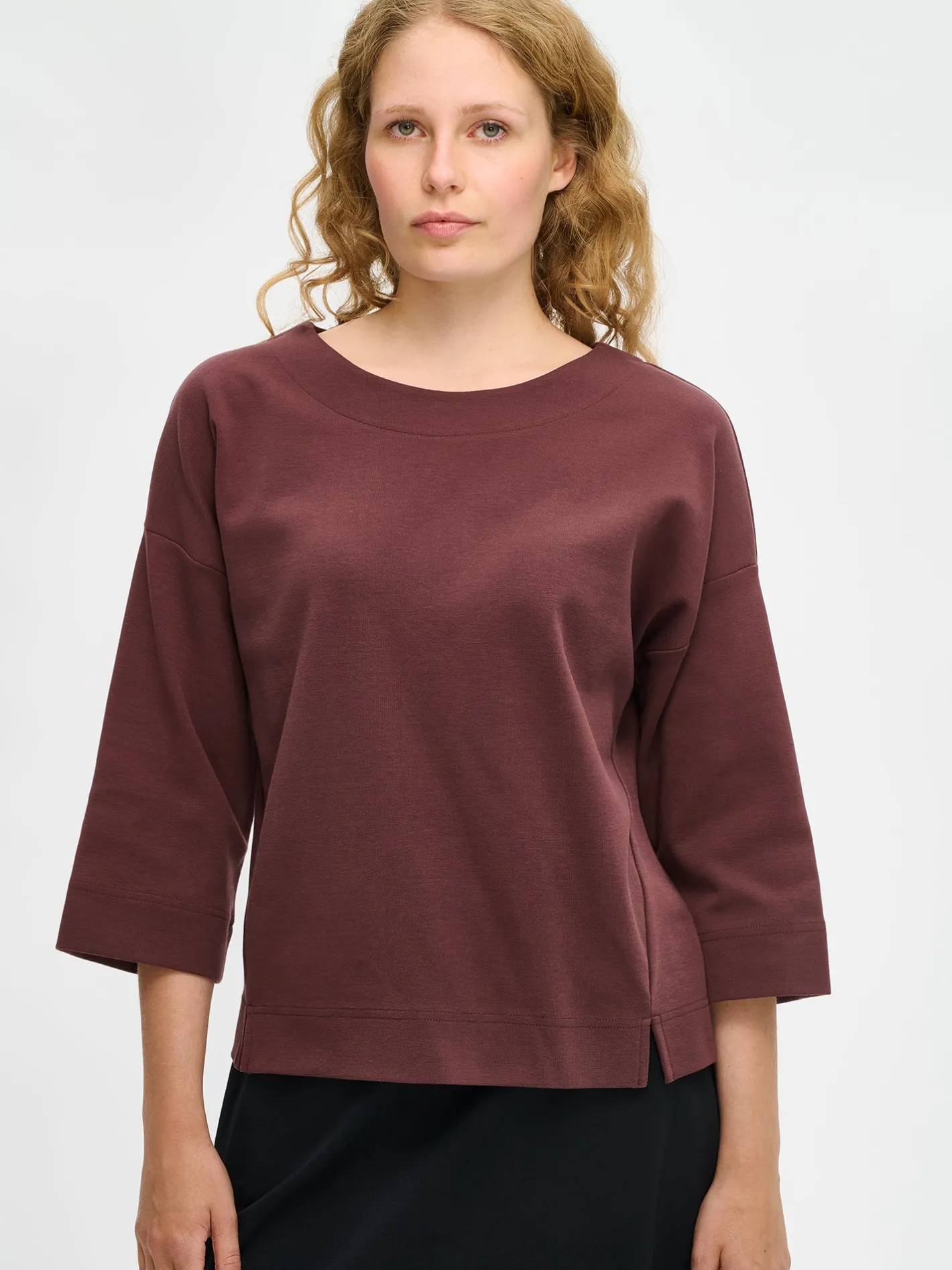 Naisten rento, ruskea Elena-pusero. Laatikkomaisessa puserossa on alavaralla huoliteltu ovaali pääntie ja 3/4 pituiset hihat. Olkalinja on reilusti pudotettu ja helmassa on halkiot. Puseron sivusauma tulee hienovaraisesti etupuolelle, korostaen vartalon linjoja ja tuoden asuun kevyttä muotoa. Puseron pituus koossa M on noin 62 cm. Materiaali on miellyttävää ja joustavaa puuvilla-polyesteri-elastaanineulosta. Pehmeä ja joustava Elena-pusero on helppo yhdistää eri asuihin, ja se tuo arkeen ajattoman mukavuutta.
