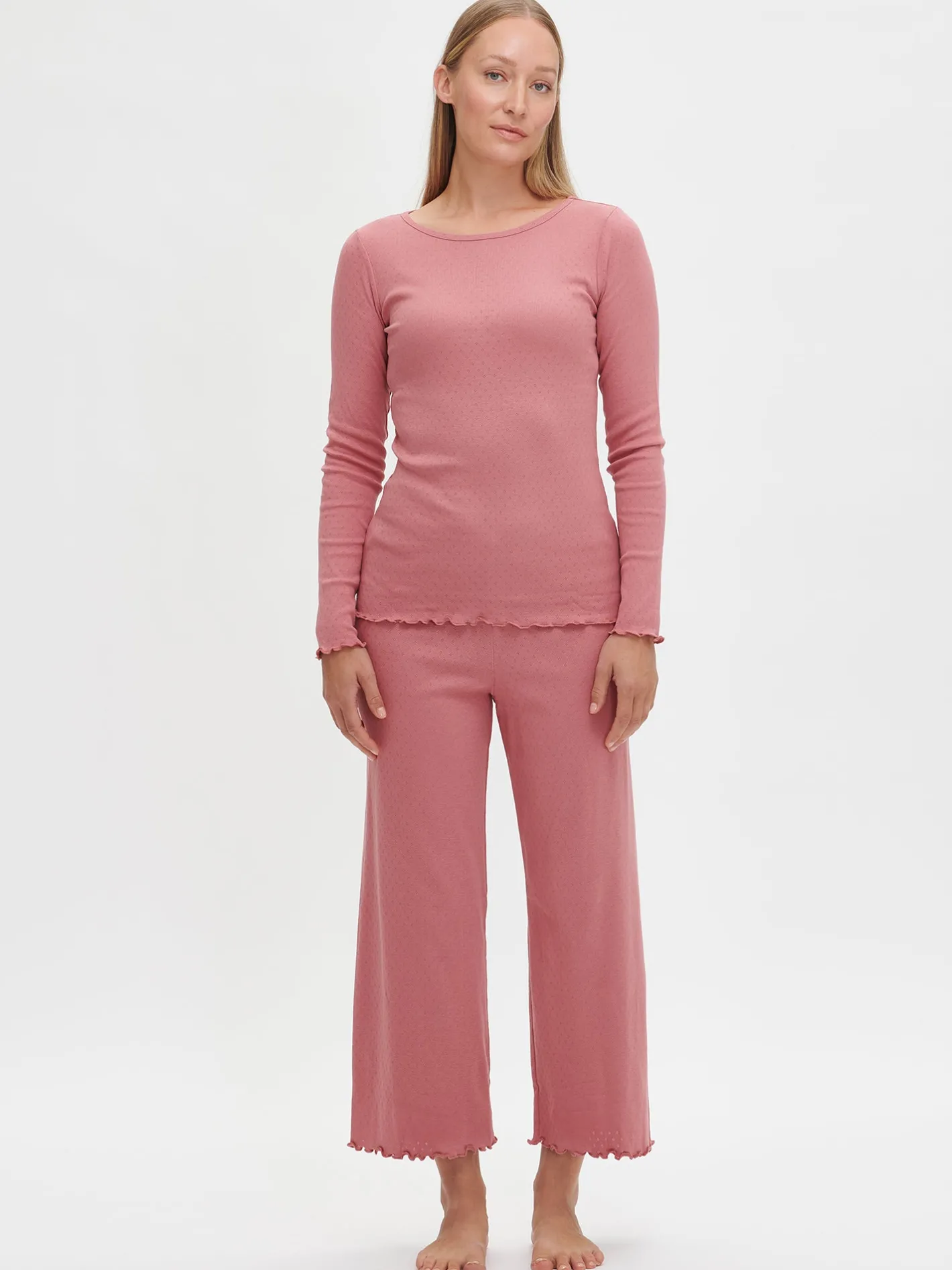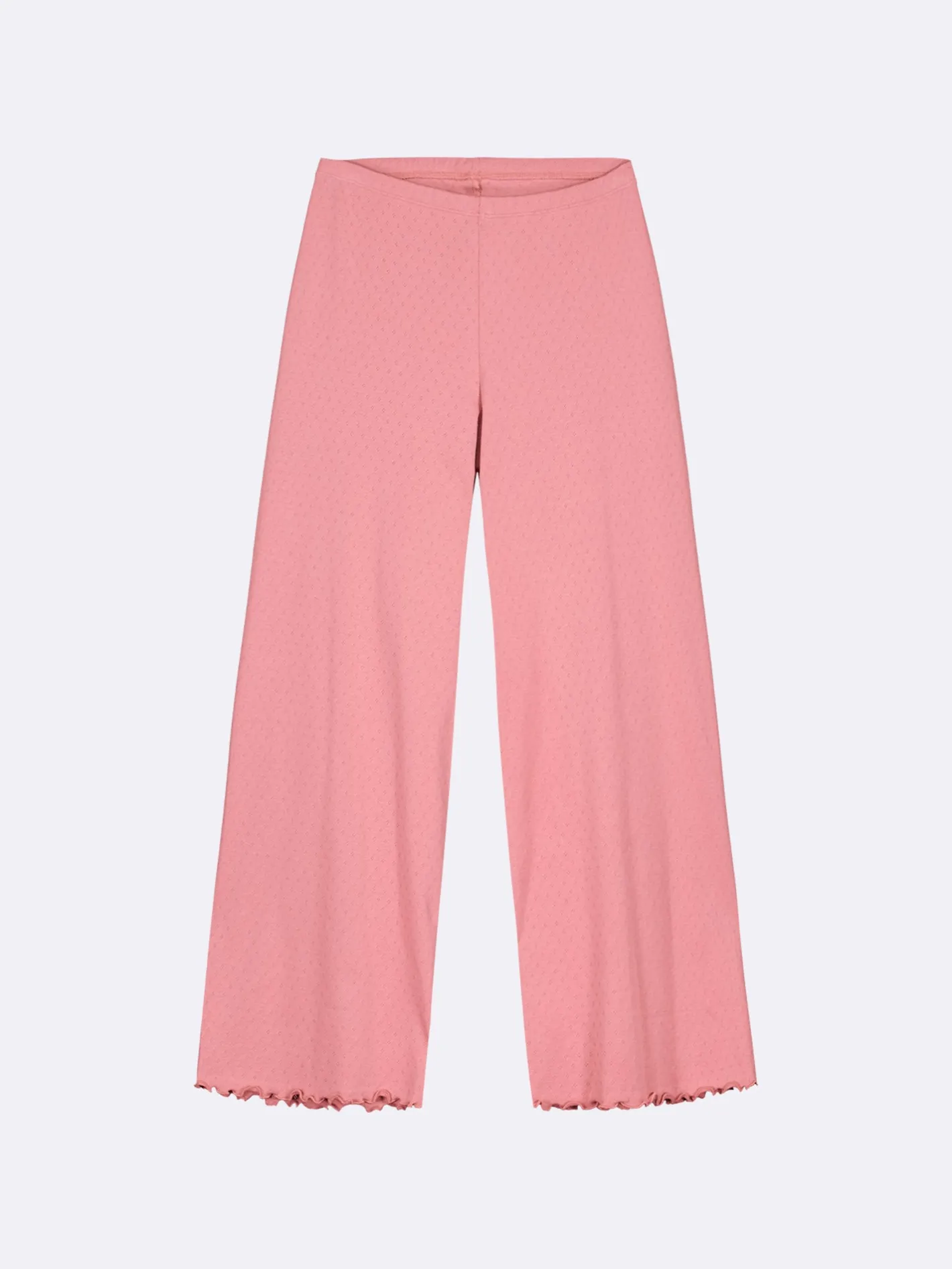 Naisten roosat Elise-housut. 7/8 pituisissa housuissa on joustava vyötärö. Lahkeensuut on viimeistelty kapealla ja tiiviillä saumuritikkauksella, joka huolittelee reunan ja luo siihen kauniin aaltoilevan efektin. Materiaali on joustavaa ja miellyttävän tuntuista puuvillaribbineulosta, jossa on kaunis ja hienostunut neulottu pitsikuvio.