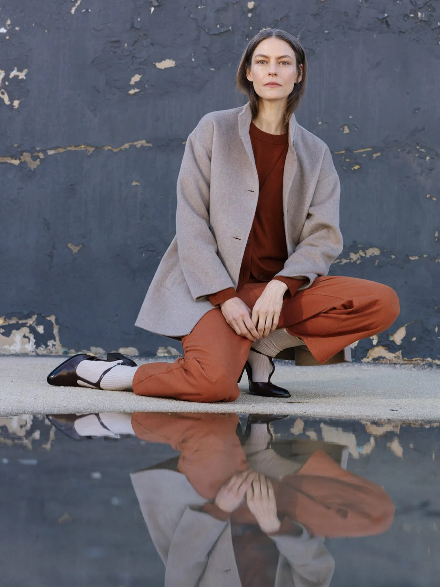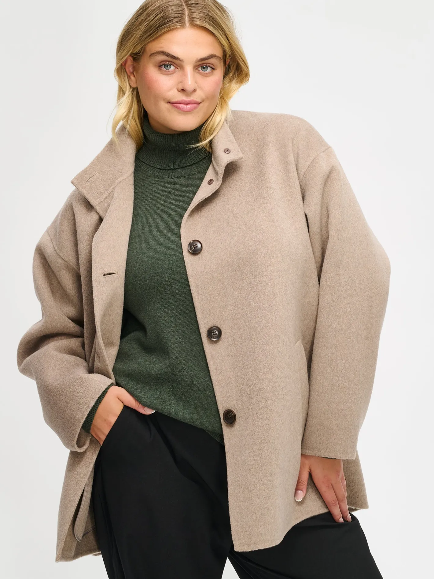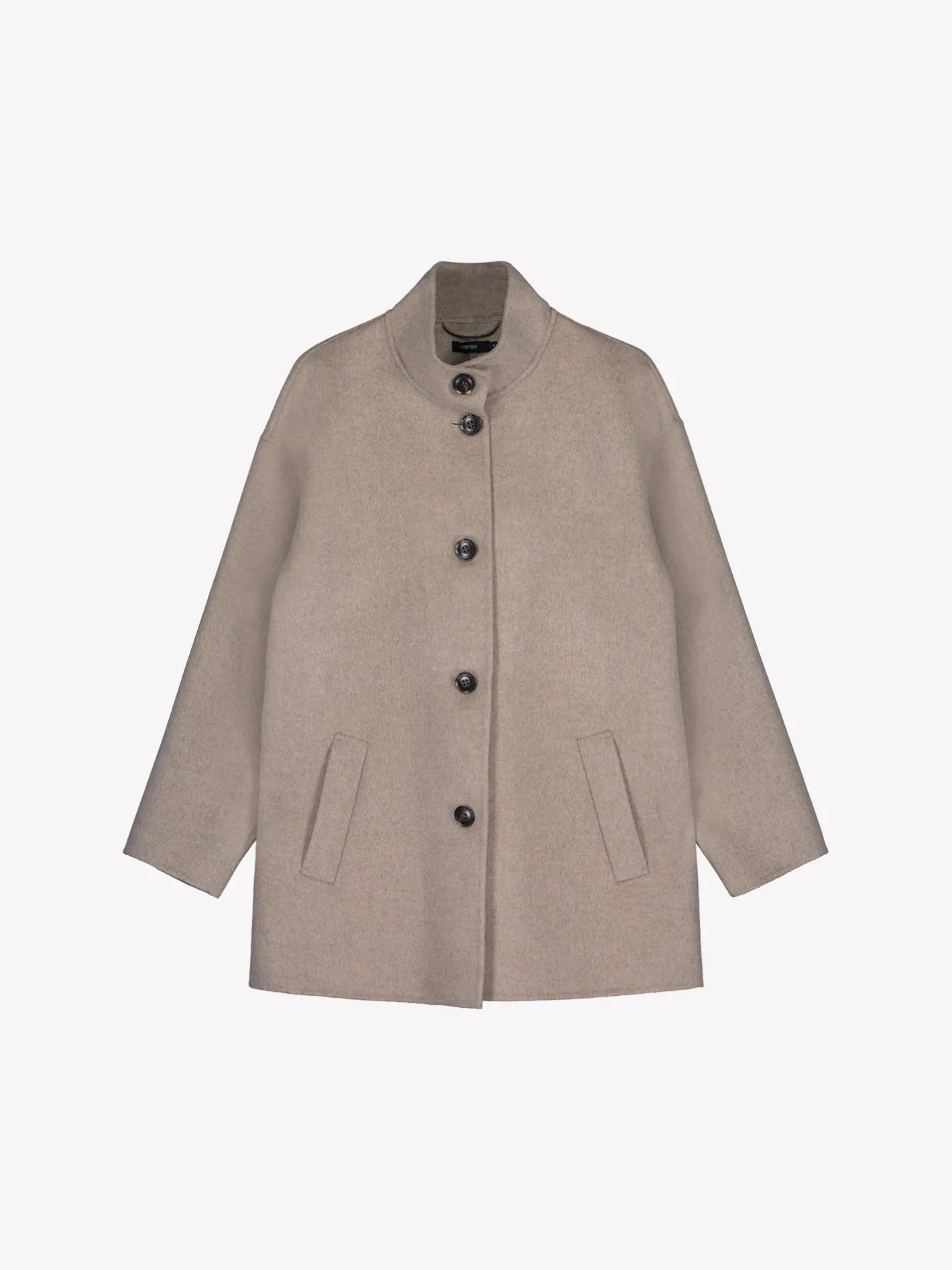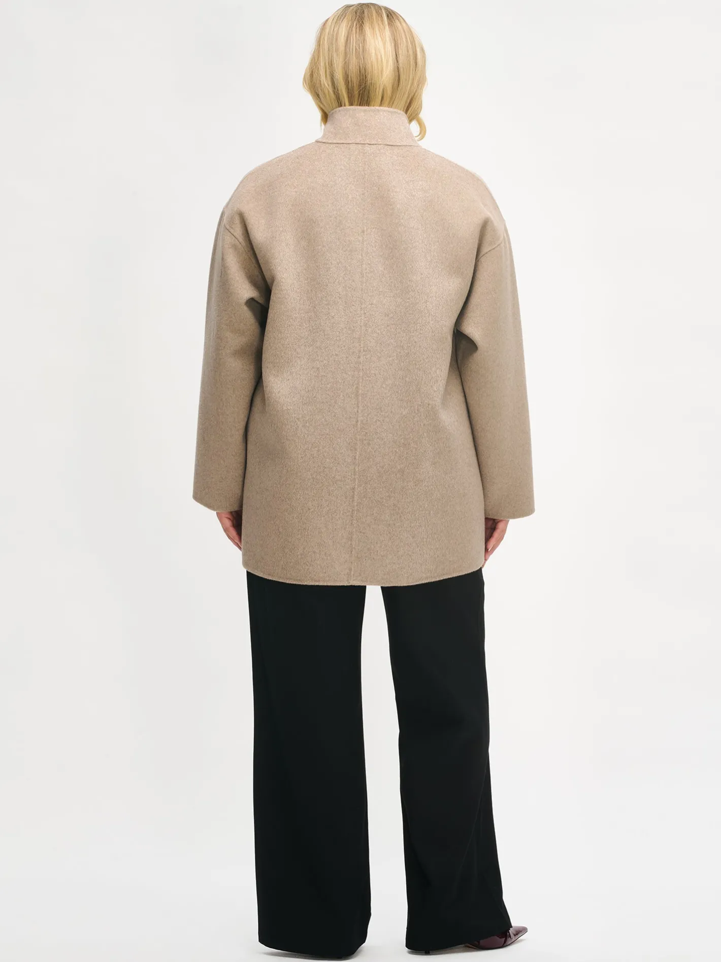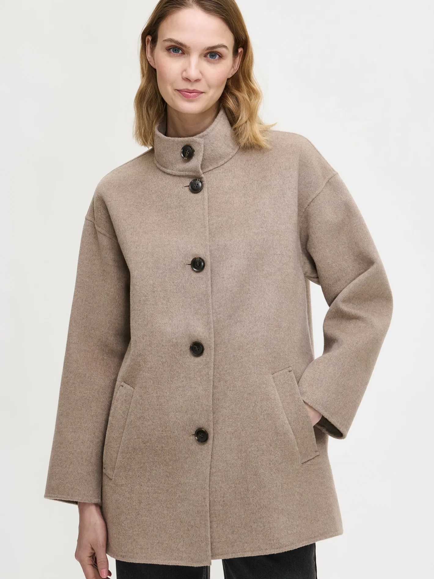 Naisten rento lyhyt beige Ella-villakangastakki matalalla pystykauluksella. Villakangastakki on ajaton vaatekaapin kulmakivi, johon on ihanaa pukeutua vuodesta toiseen. Tyylikäs Ella-villakangastakki on monikäyttöinen, sillä se sopii niin arkeen kuin juhlaan. Materiaali on laadukasta villa-polyesteri sekoitetta. A-linjaisen vuorittoman takin saumat ovat kauniisti sisältä ja ulkoa huolitellut. Takissa on edessä nappikiinnitys ja listataskut. Takin pituus koossa M on noin 80 cm.
