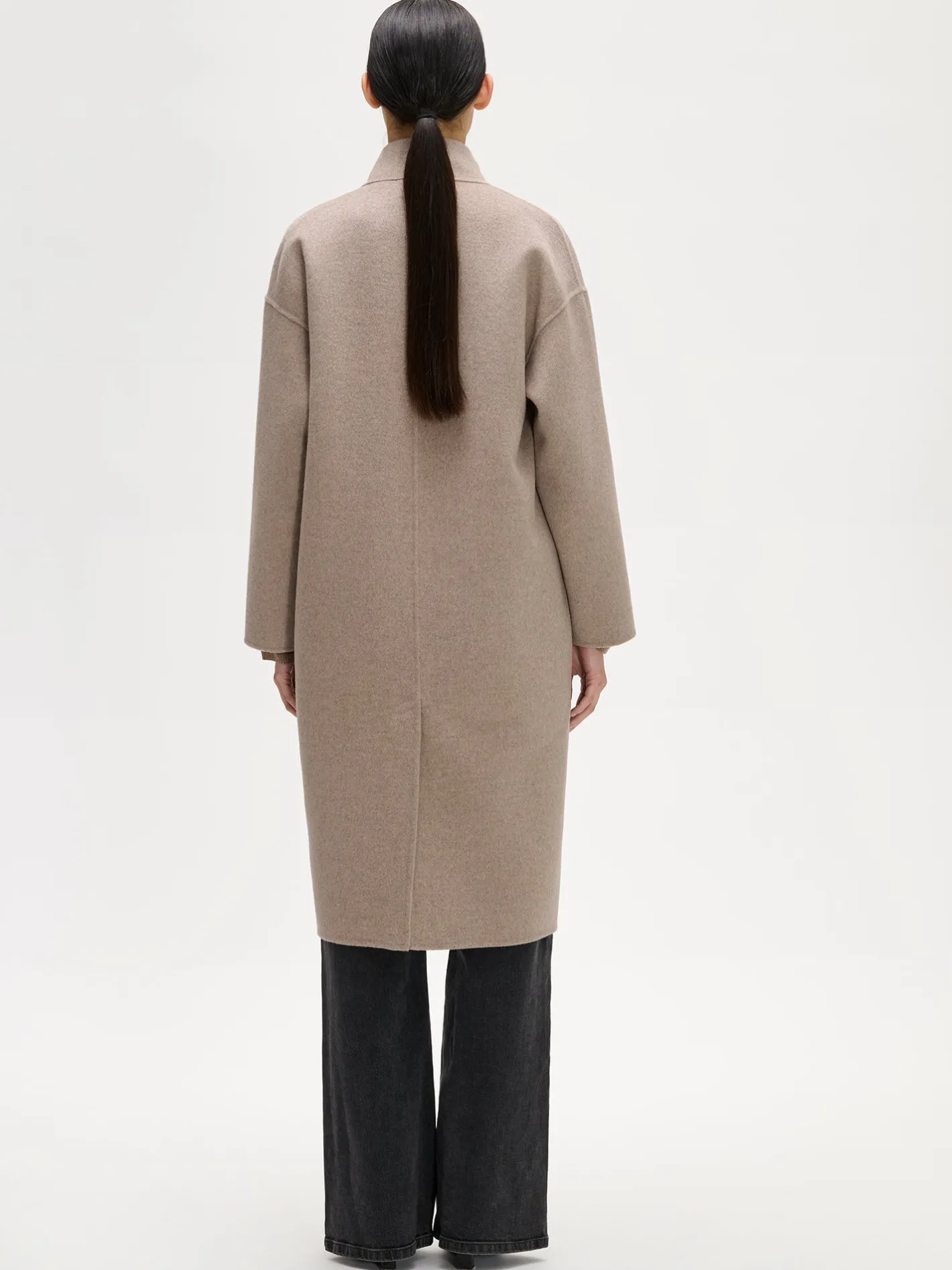 Naisten pitkä beige Elle-villakangastakki matalalla pystykauluksella. Ajaton ja elegantti villakangastakki kuuluu jokaiseen vaatekaappiin. Elle-takki tuo tyyliä niin arkipukeutumiseen kuin juhlavampiin tilaisuuksiin. Materiaali on laadukasta villa-polyesteri sekoitetta. Vuorittoman takin saumat ovat kauniisti sisältä ja ulkoa huolitellut. Takissa on edessä nappikiinnitys ja listataskut. Olkalinja on pudotettu ja takki hieman alaspäin kapenevaa mallia. Takin pituus koossa M on noin 110 cm.